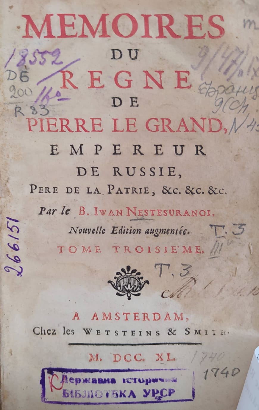Nestesuranoi Iwan. Memoires du Regne de Pierre le Grand, empereur de Russie, pere de la patrie, etc. etc. etc. La Haye: Chez R. C. Alberts, Amsterdam: Chez Her.Uytwerf, 1740. – T. 3. – 452 p.