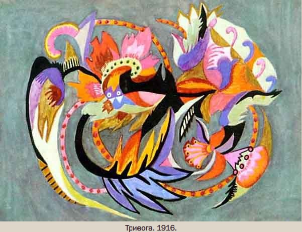 1916 року, під час першої світової війни, Ганна Собачко створює композицію «Тривога». Тут можна побачити те нове колірне та образне рішення, що відрізняє її твори від робіт попередніх років. На темно-зеленому, а не білому, як раніше, фоні представлені червоно-вогняні, посилені чорним, смерчі, в центрі — дві білі плями з чорними зіницями. Червоно-вогняними смерчами художниця ніби хотіла передати весь жах, тривогу та трагедійність війни, що охопила світ.