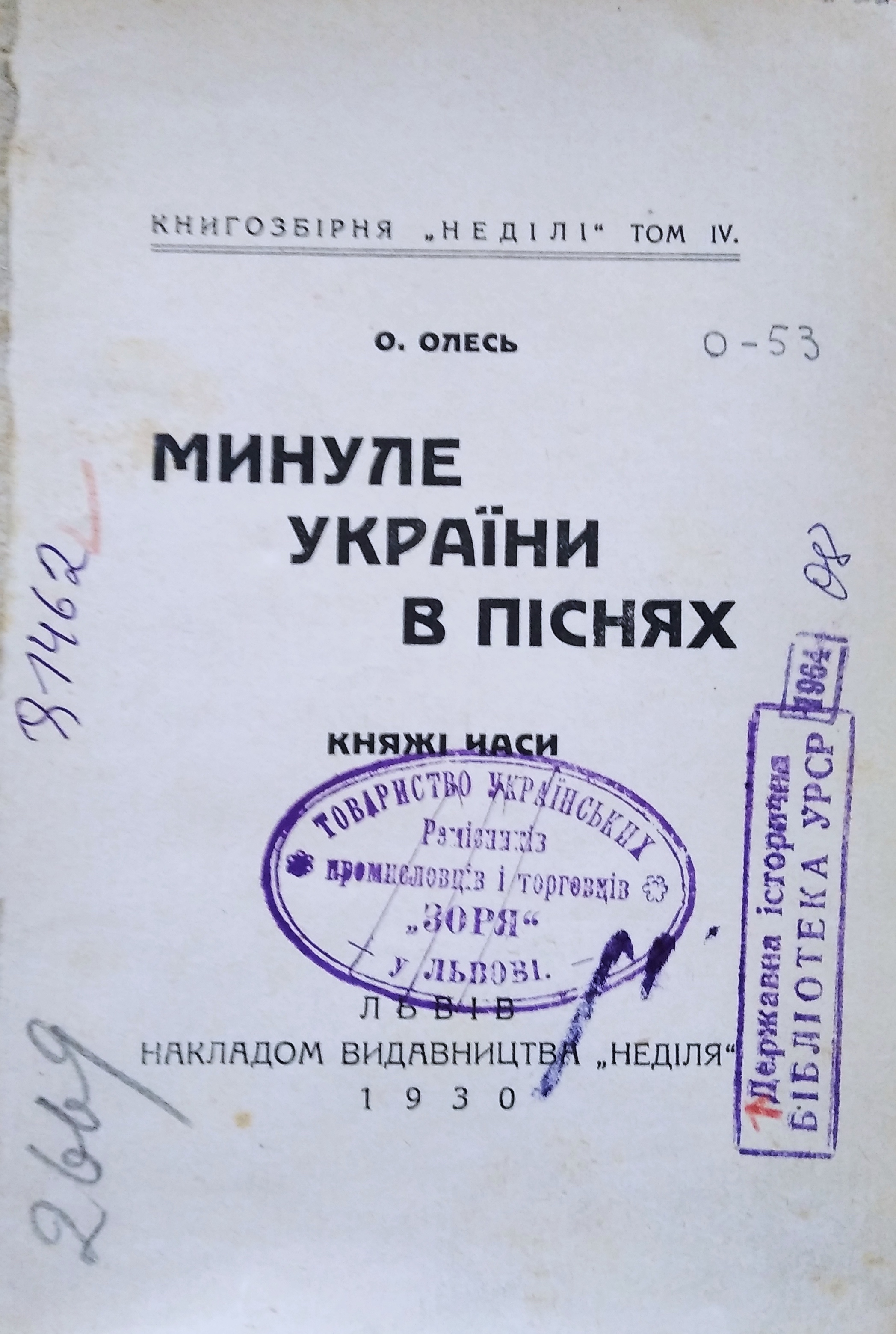 Книга, написана Олександром Олесем в еміграції у 1920 році, з різних причин не була видана і довгий час пролежала у рукописах. Уперше її надруковано у львівському видавництві «Неділя» під назвою «Минуле України в піснях. Княжі часи», передмову до видання написав історик і мистецтвознавець Микола Голубець. Наступне перевидання книги здійснено 1949 року у Празі під короткою назвою «Княжа Україна». У 1991 році видавництво «Веселка» (м. Київ) підготувало сучасне видання цієї збірки.