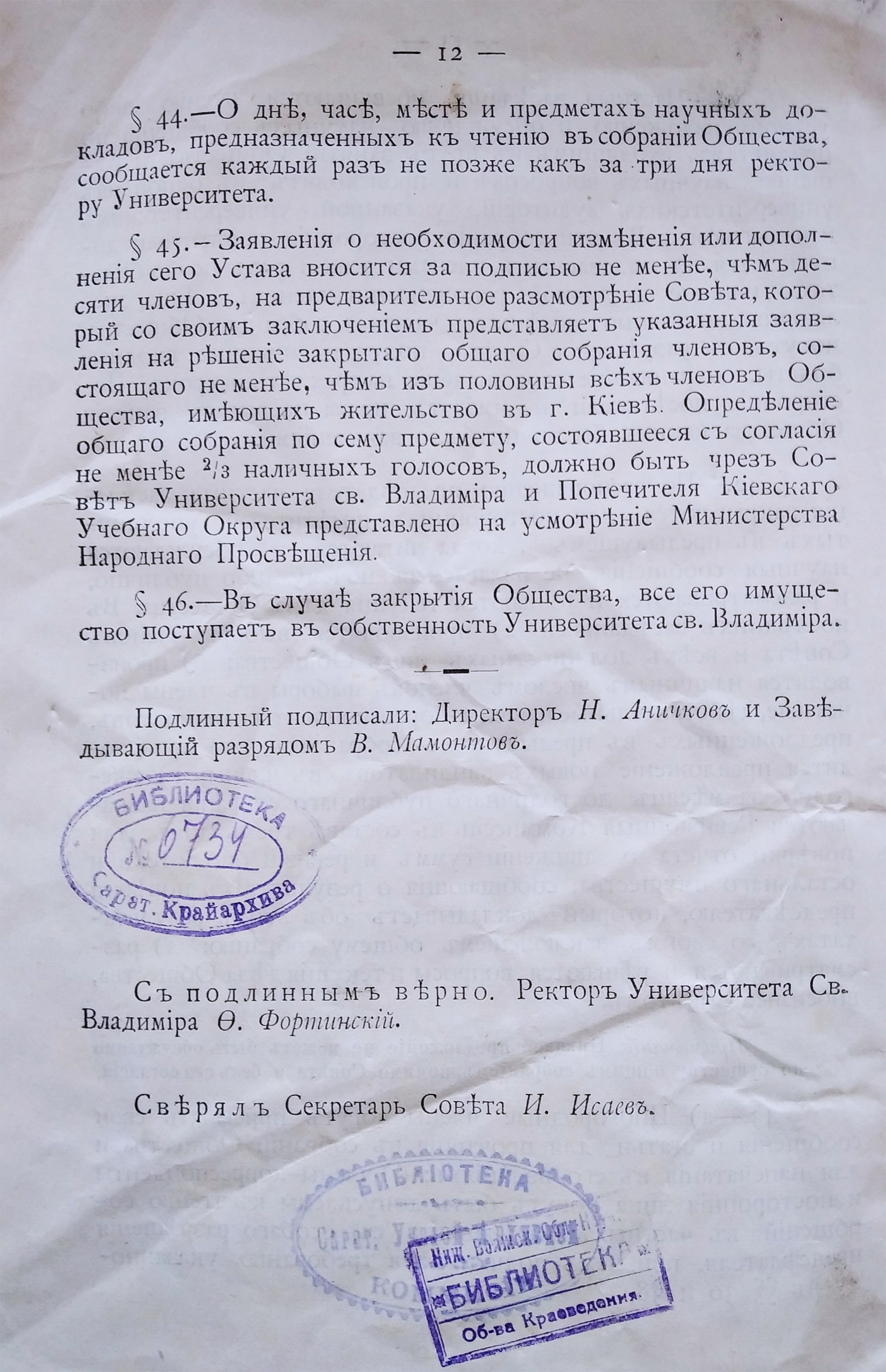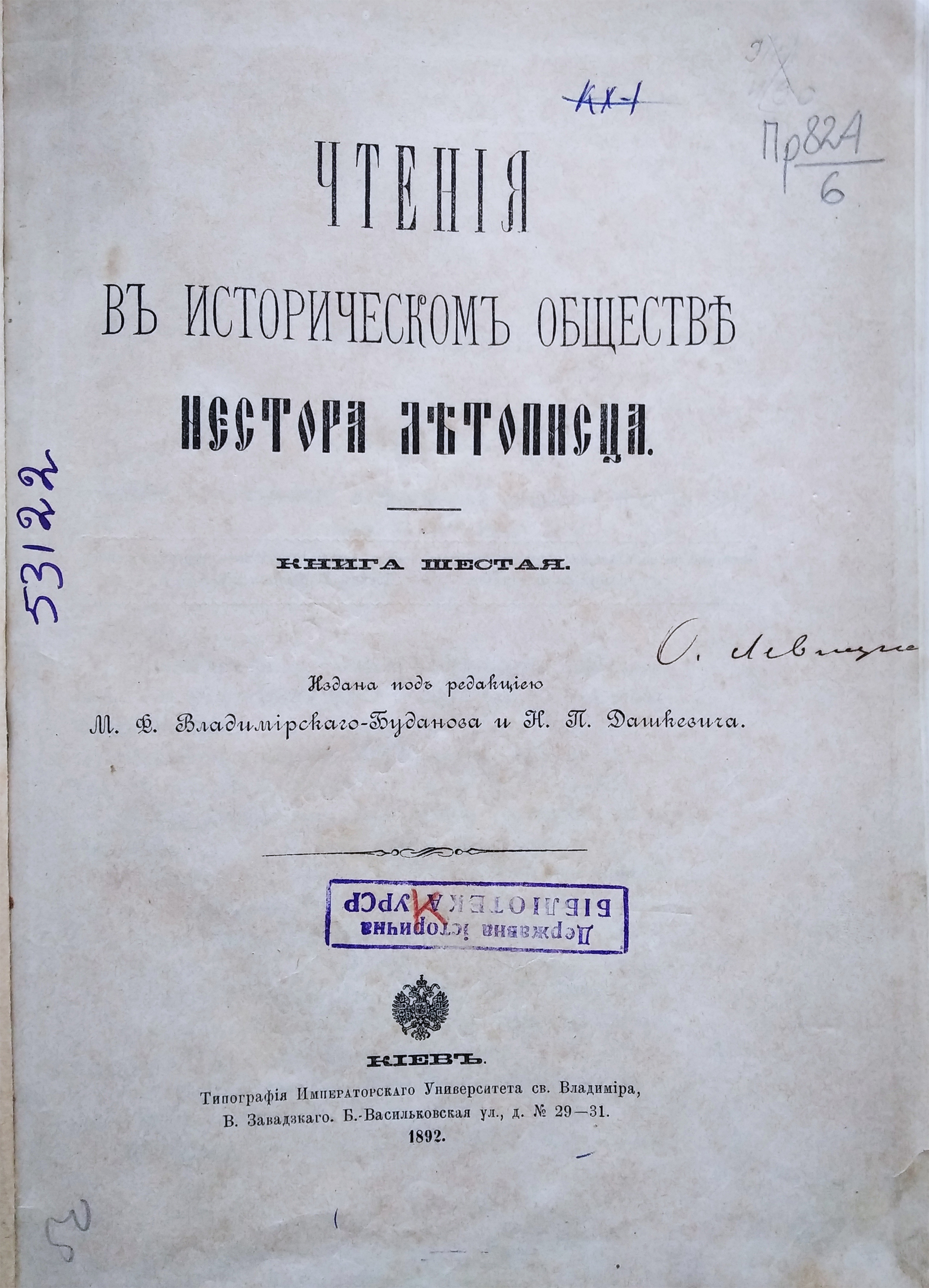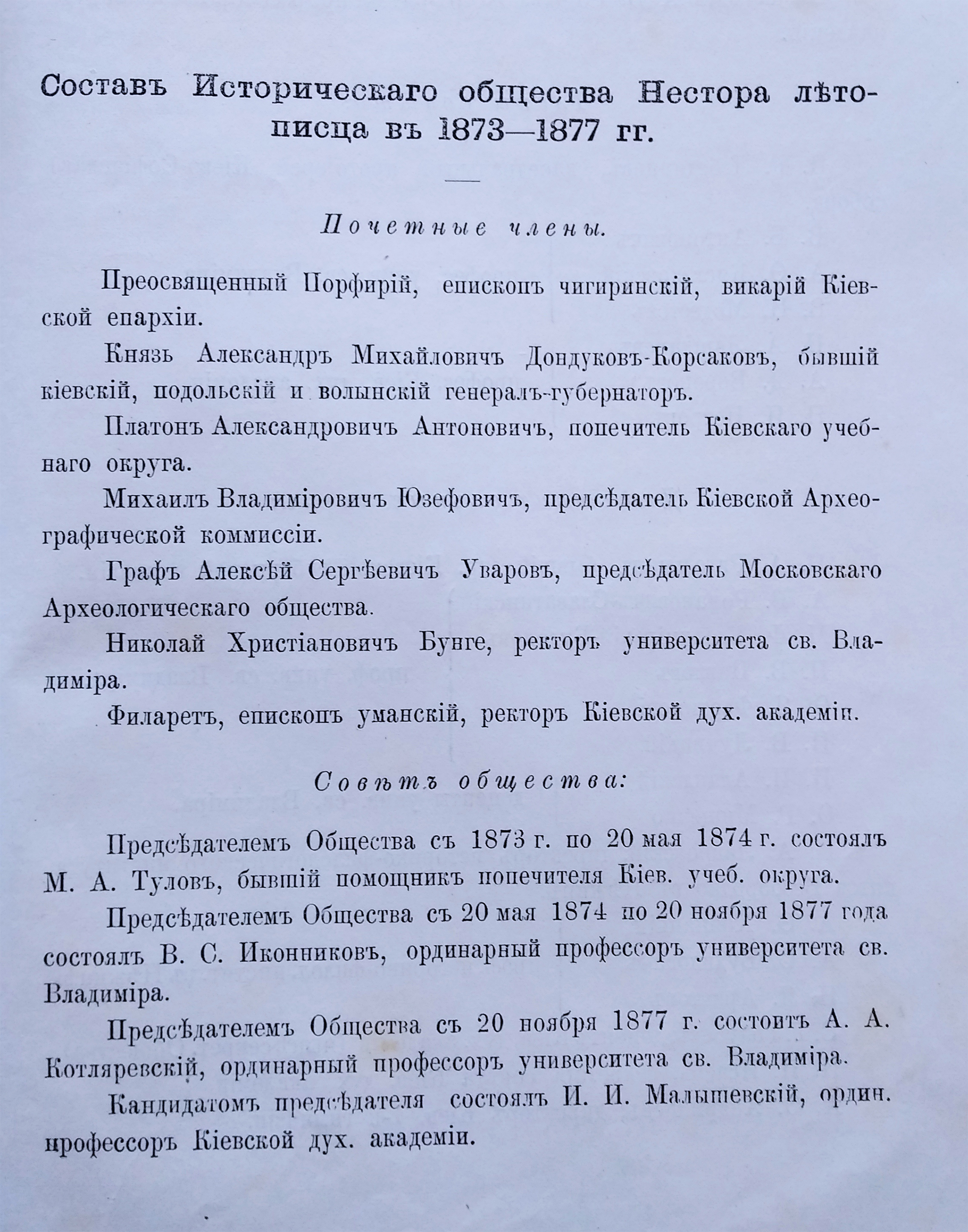 В оновленому Статуті Історичного товариства Нестора Літописця при Імператорському Університеті св. Володимира (надалі – ІТНЛ) 1894 року зазначено, що головним його завданням є «сприяння розвитку історії та допоміжних наук», а найближчим завданням – підтримання зв’язку між ученими-істориками та розповсюдження точних історичних знань. Приватні та публічні засідання проводилися в приміщеннях Університету, тут виголошувалися доповіді й повідомлення та відбувалося їх обговорення. Ясна річ, перед Товариством, як і перед засновниками Університету св. Володимира у 1834 р., поставало надзавдання: насаджувати й підтримувати імперський наратив російської історії. Однак і Університет у Києві, і наукове Товариство при ньому все ж змогли виростили цілу плеяду українських істориків, які мовою давніх документів і археологічних артефактів неспростовно доводили «точні історичні знання».
