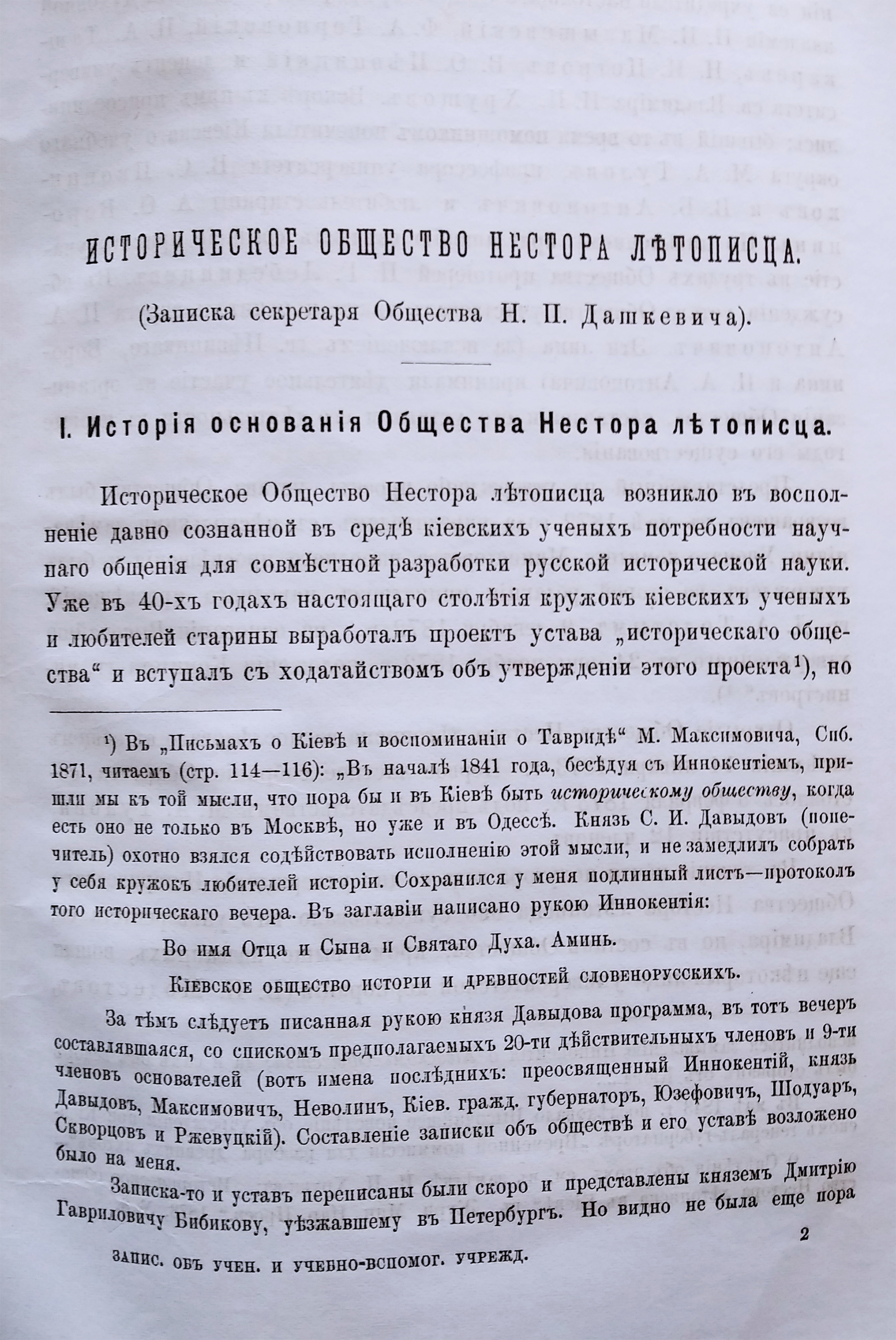 Саме з цієї величної та прекрасної постаті в українській науці варто почати розмову про Історичне товариство Нестора Літописця. Представляємо збірник «Историко-статистические записки об учёных учреждениях […]», зредагований професором В.С. Іконниковим, й виданий до 50-річчя Університету св. Володимира. У примітках до статті Миколи Дашкевича, тодішнього секретаря ІТНЛ, читаємо передісторію створення Товариства, яка почалася 1841 року, і в якій головну роль відіграв перший ректор Університету св. Володимира, людина енциклопедичних знань Михайло Олександрович Максимович.