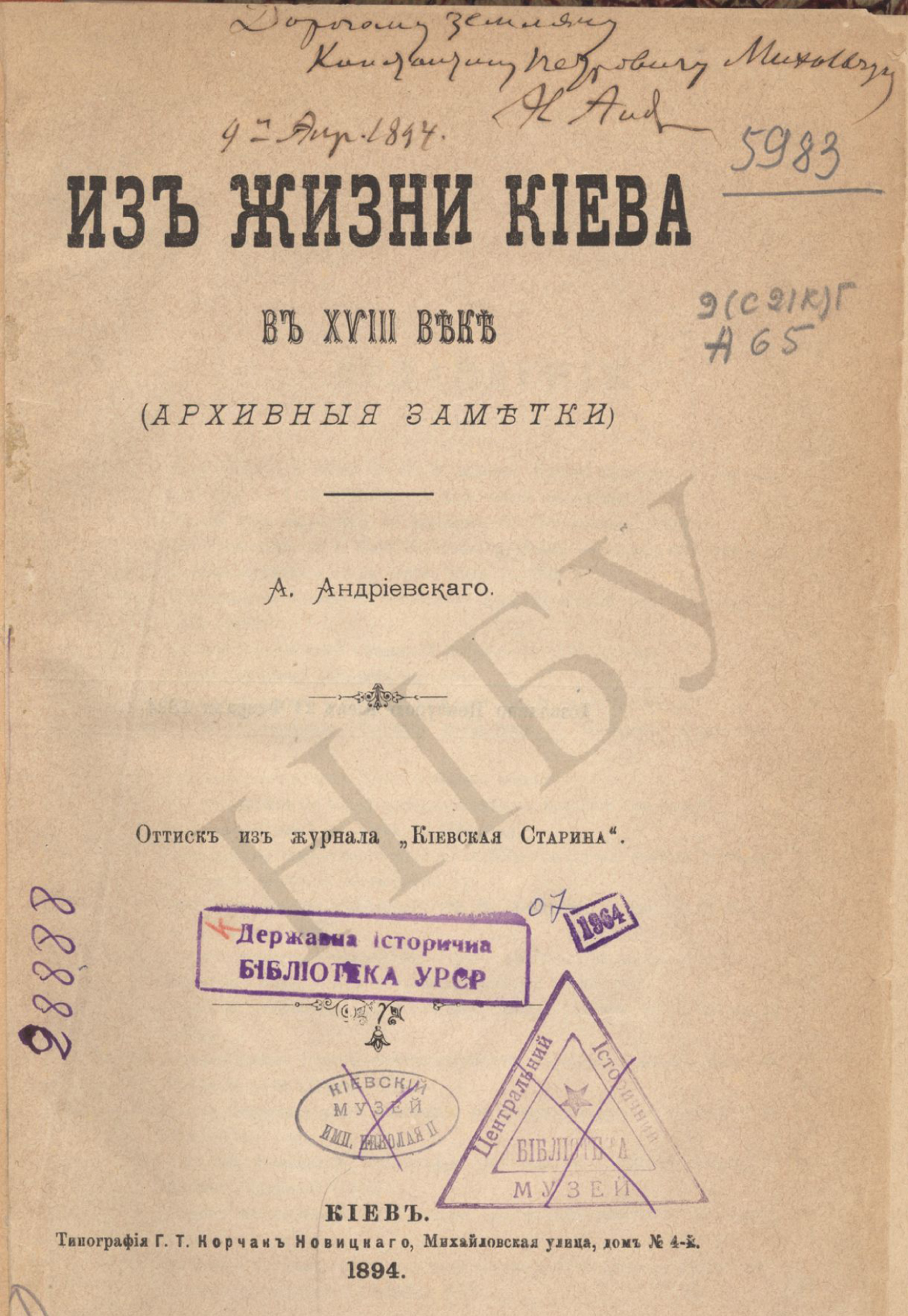 Олексій Олександрович Андрієвський (1845—1902) – український педагог, історик, археограф. Закінчив Університет св. Володимира (1865). Активний діяч київської Старої Громади, дійсний член ІТНЛ.