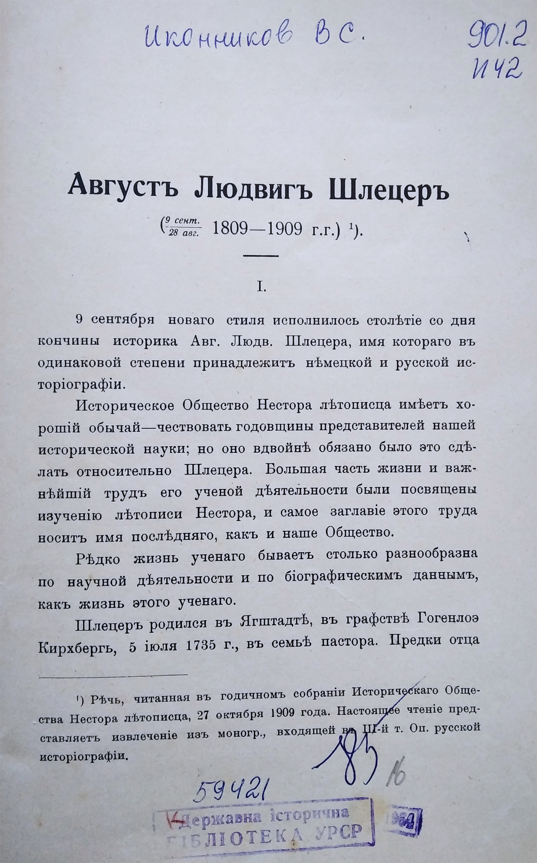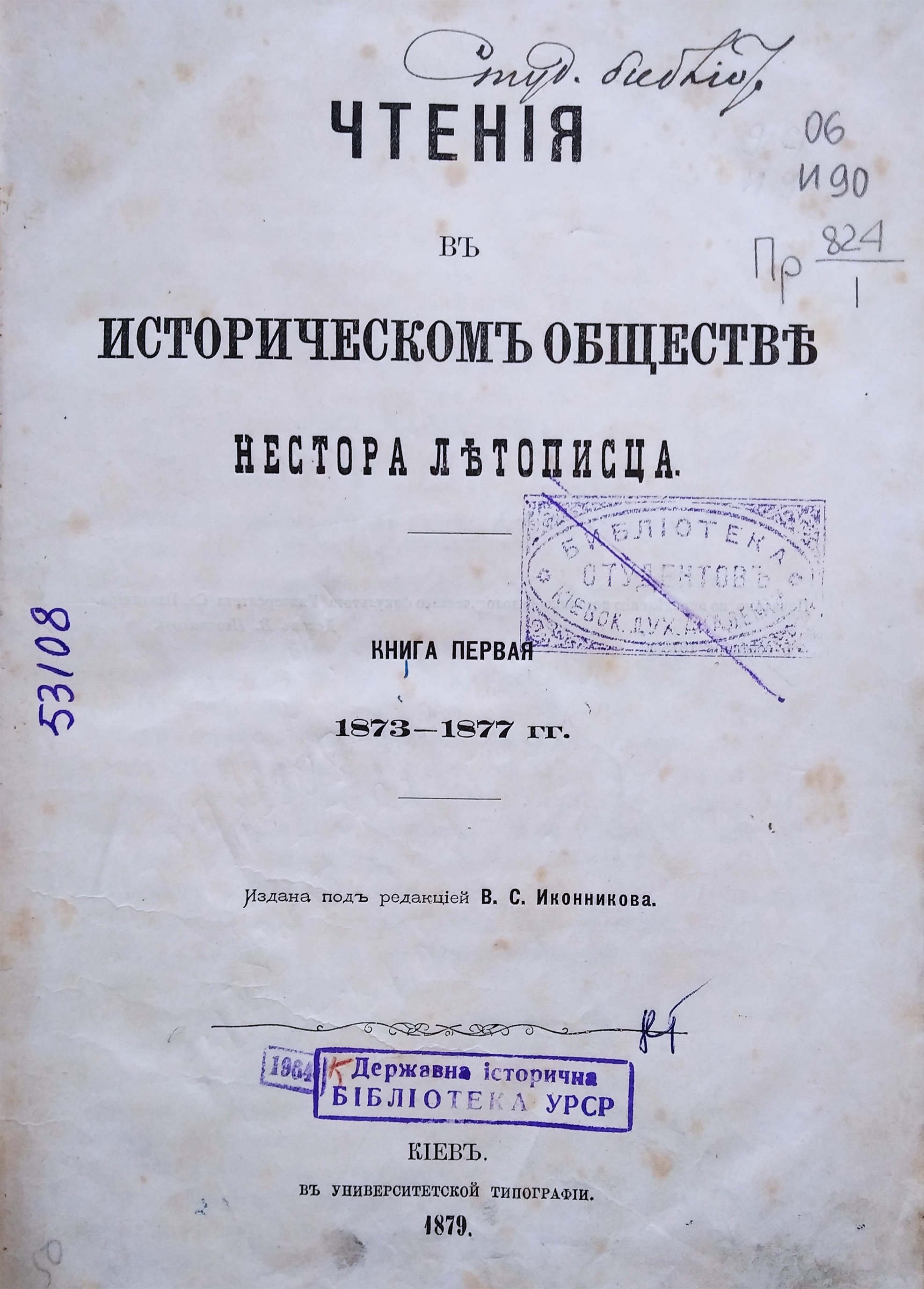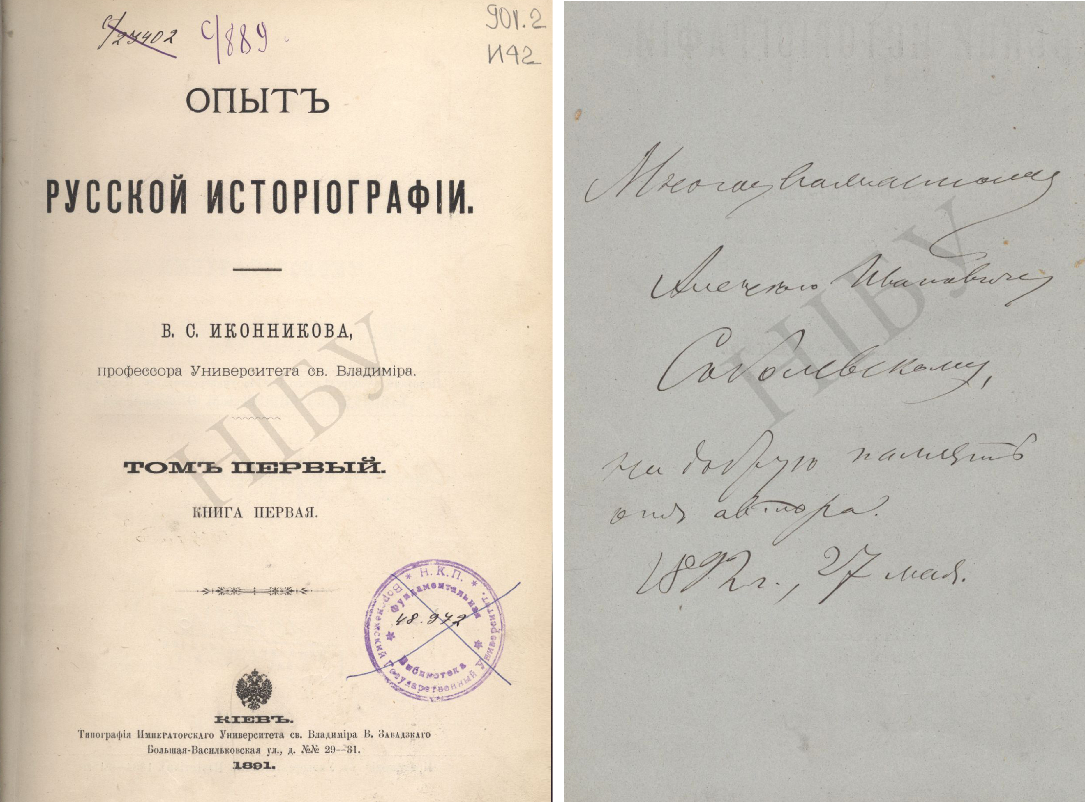 Представляємо екземпляр першого тому знаменитої праці В. С. Іконникова «Опыт русской историографии», подарований автором Олексію Соболевському, теж активному діячу ІТНЛ і редактору другої книги «Чтений».