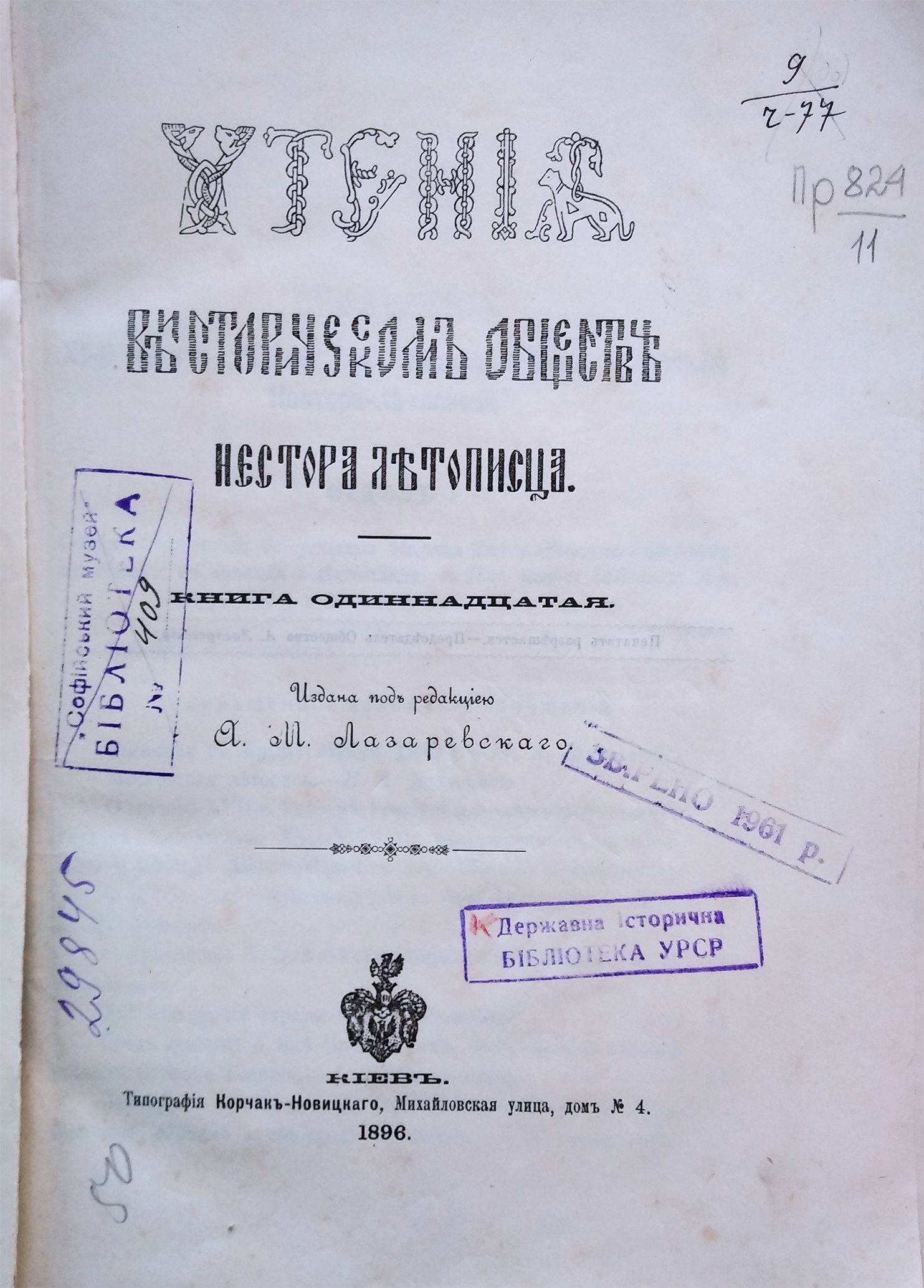 Упродовж 1895-1896 рр. видатний історик, археограф, генеалог, джерелознавець, видавець Олександр Матвійович Лазаревський (1834-1902) був головою ІТНЛ. В 11-й книзі ЧИОНЛ, зредагованій Олександром Матвійовичем, на 240-ка сторінках вміщені дві його вагомих розвідки («Сведения о пребывании кн. Иеремии Вишневецкого в Левобережной Украине и об уходе его оттуда», «Записка Г. А. Полетики о начале Киевской Академии») та дві визначні археографічні публікації ученого («Исторические очерки Полтавской Лубенщины XVII и XVIII вв.»; «Материалы для истории общественного и частного быта в Малороссии XVIII в.»).