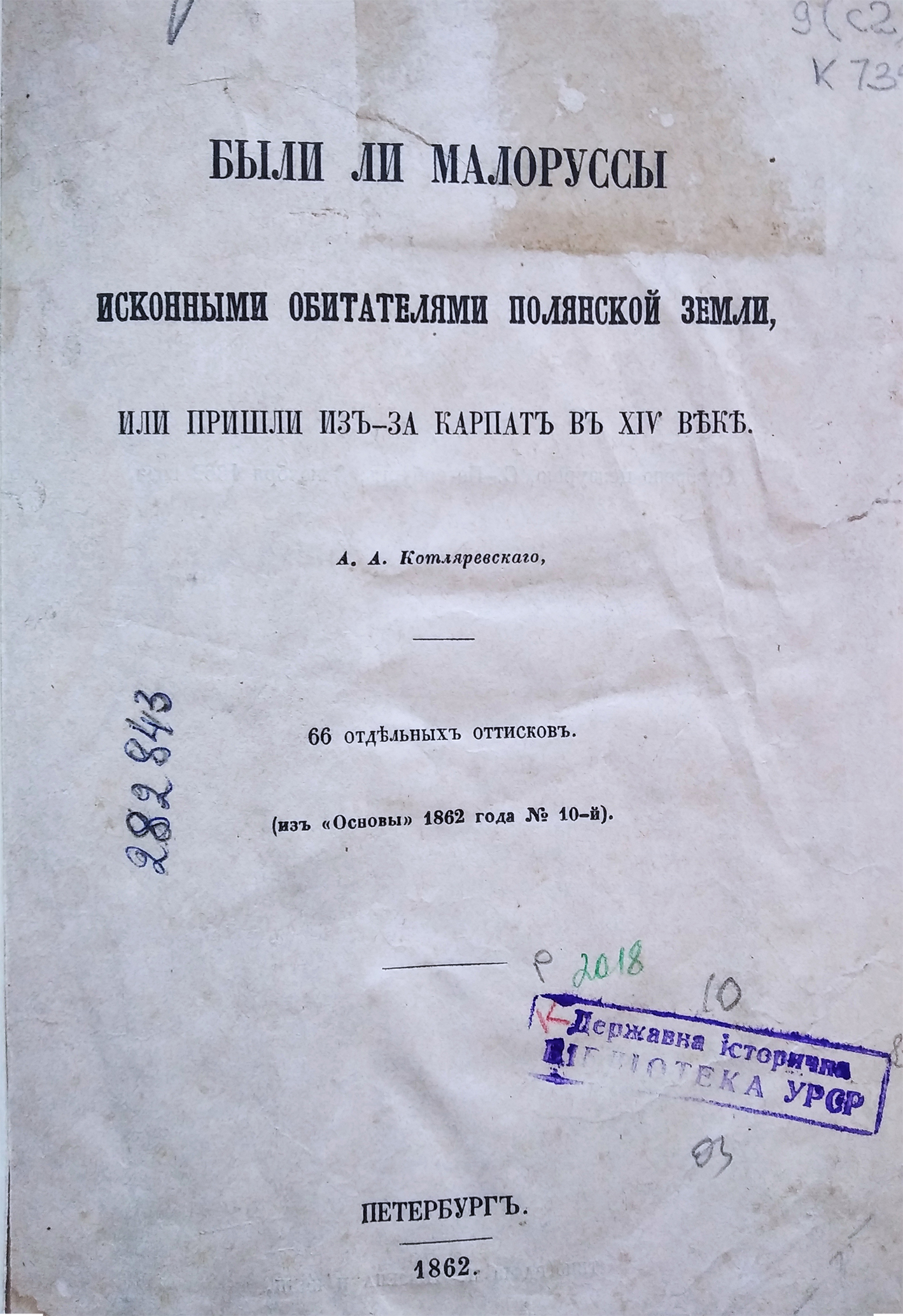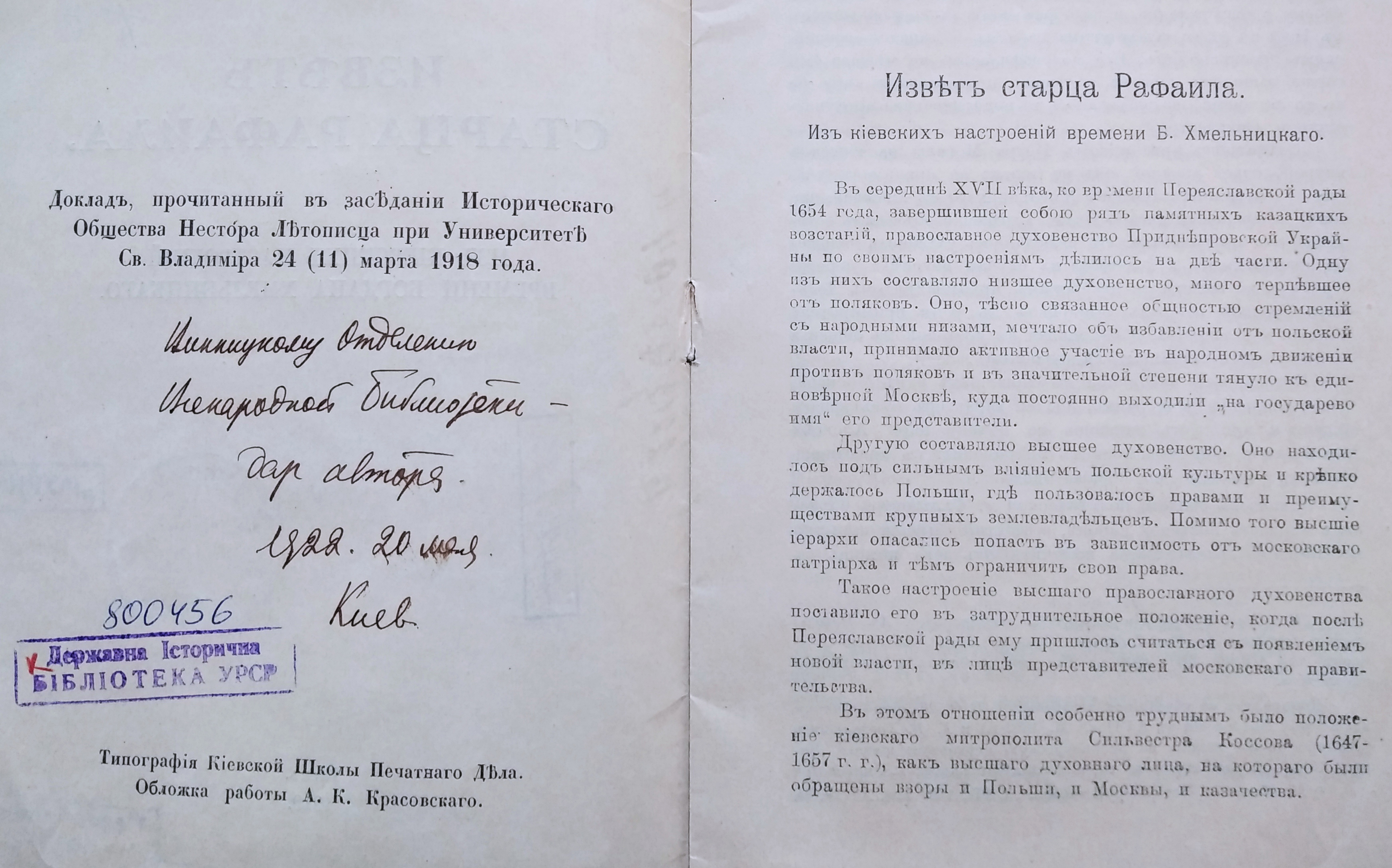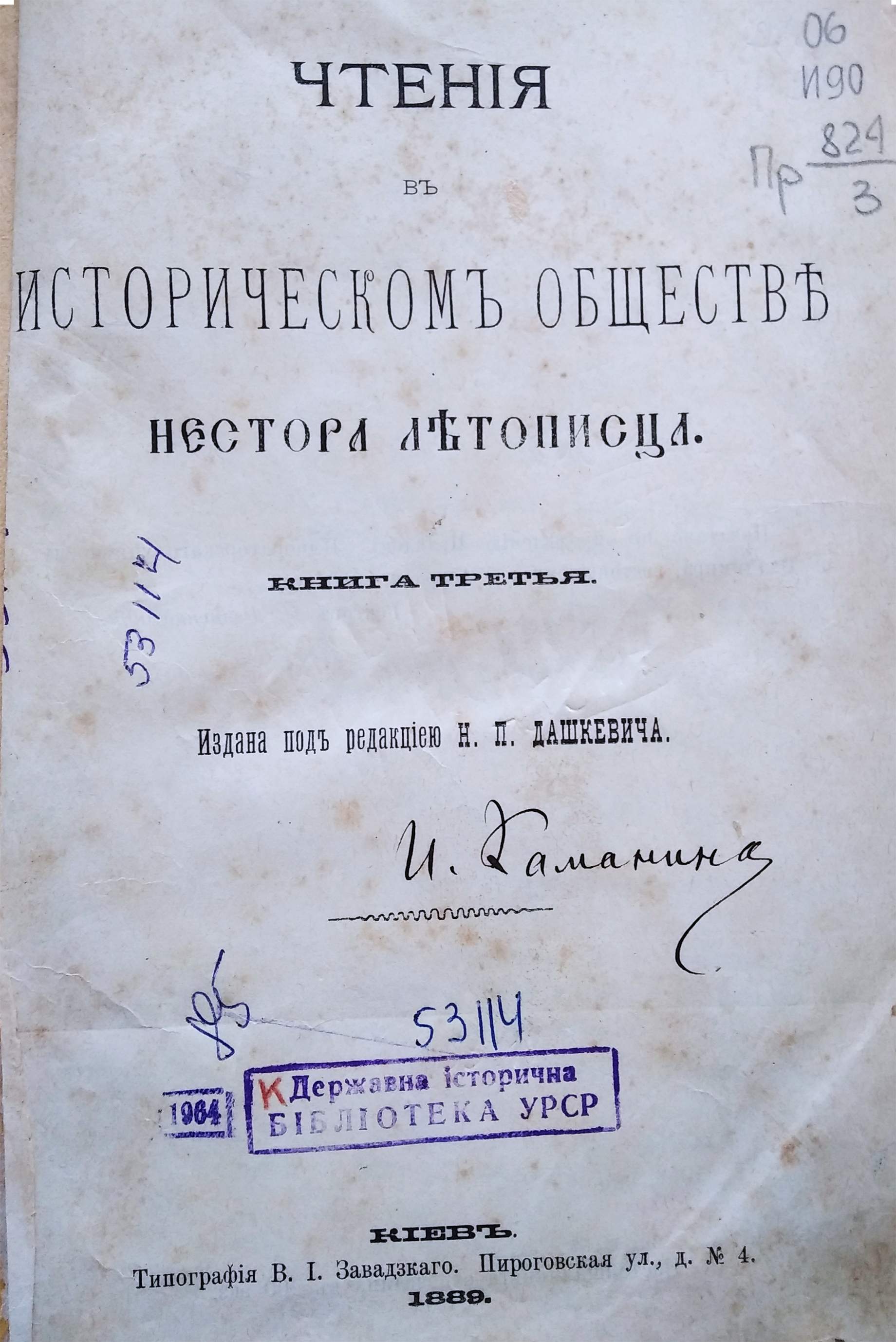 Брошюра була подарована автором – істориком-славістом, літературознавцем, учнем О. О. Котляревського дійсним членом ІТНЛ Андроником Степовичем – «Уважаемому Николаю Павловичу Дашкевичу».