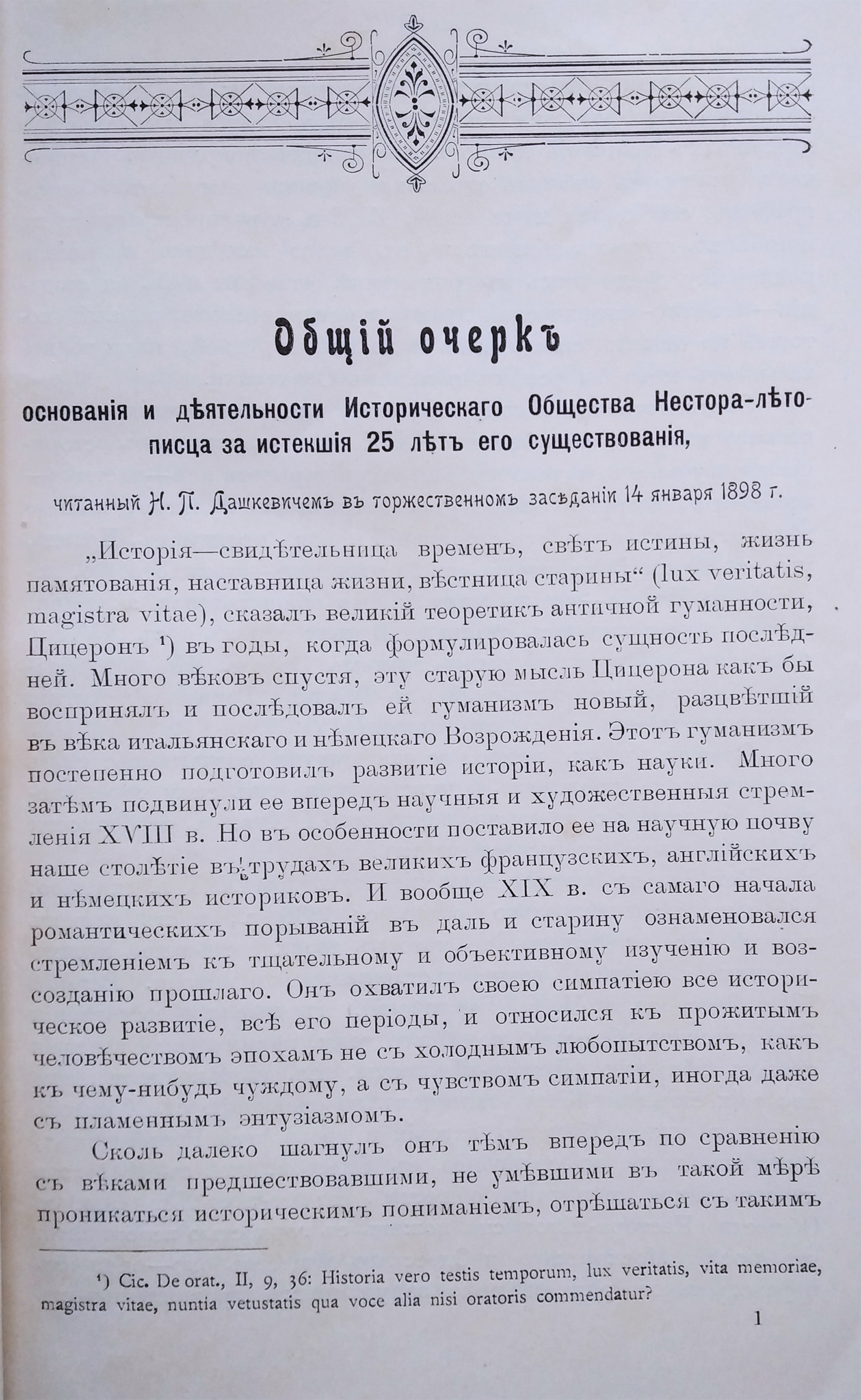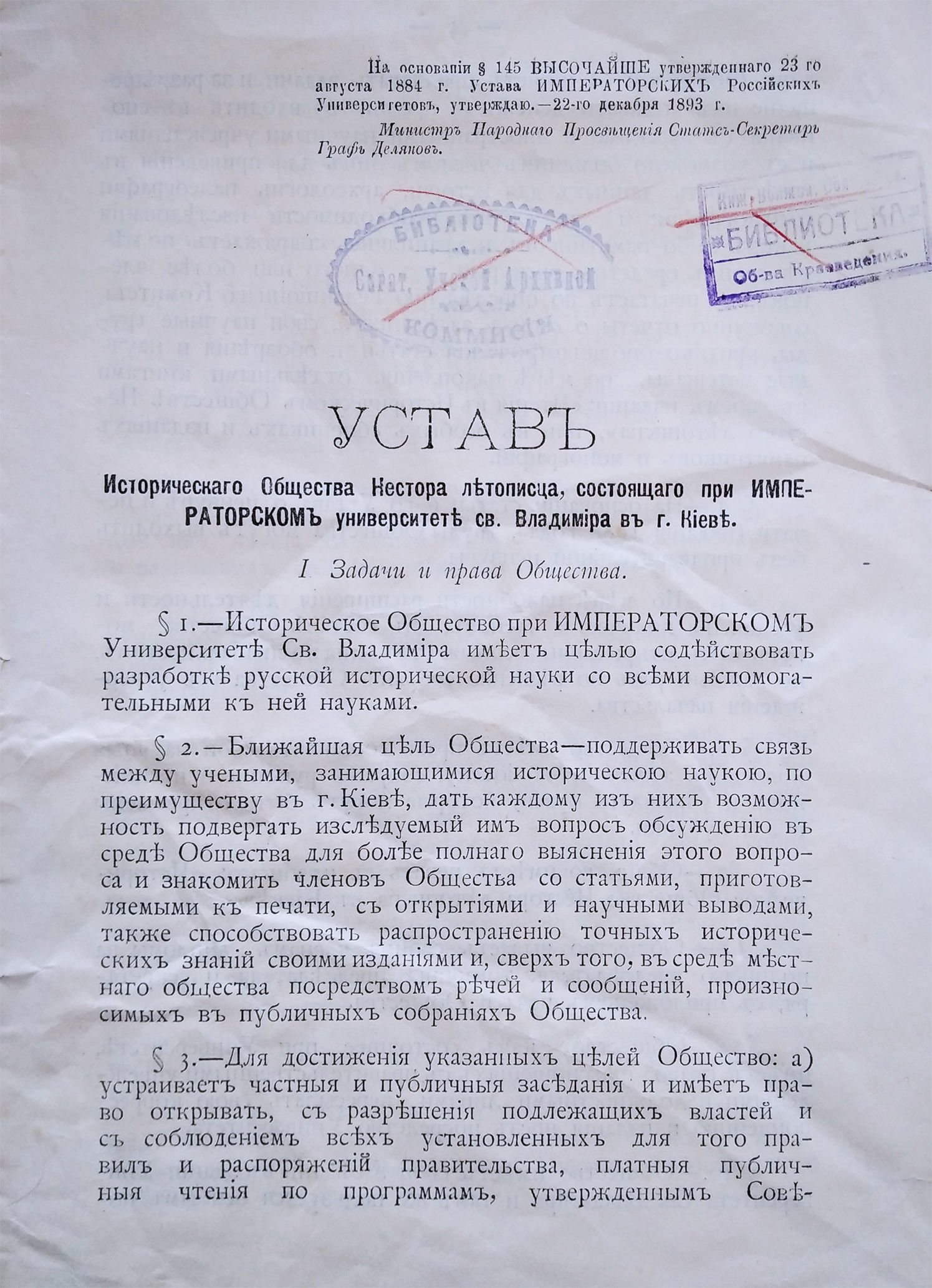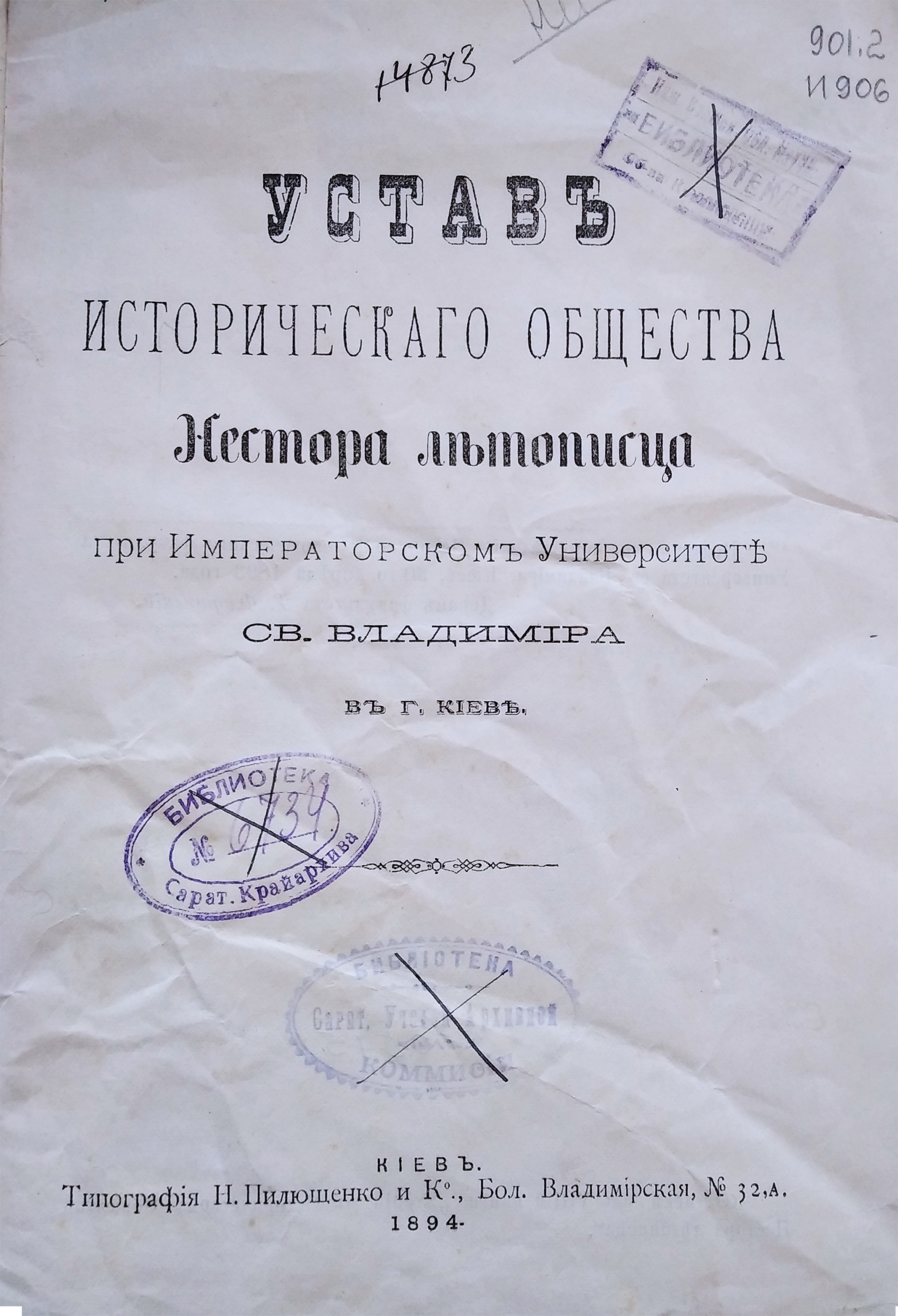 В оновленому Статуті Історичного товариства Нестора Літописця при Імператорському Університеті св. Володимира (надалі – ІТНЛ) 1894 року зазначено, що головним його завданням є «сприяння розвитку історії та допоміжних наук», а найближчим завданням – підтримання зв’язку між ученими-істориками та розповсюдження точних історичних знань. Приватні та публічні засідання проводилися в приміщеннях Університету, тут виголошувалися доповіді й повідомлення та відбувалося їх обговорення. Ясна річ, перед Товариством, як і перед засновниками Університету св. Володимира у 1834 р., поставало надзавдання: насаджувати й підтримувати імперський наратив російської історії. Однак і Університет у Києві, і наукове Товариство при ньому все ж змогли виростили цілу плеяду українських істориків, які мовою давніх документів і археологічних артефактів неспростовно доводили «точні історичні знання».