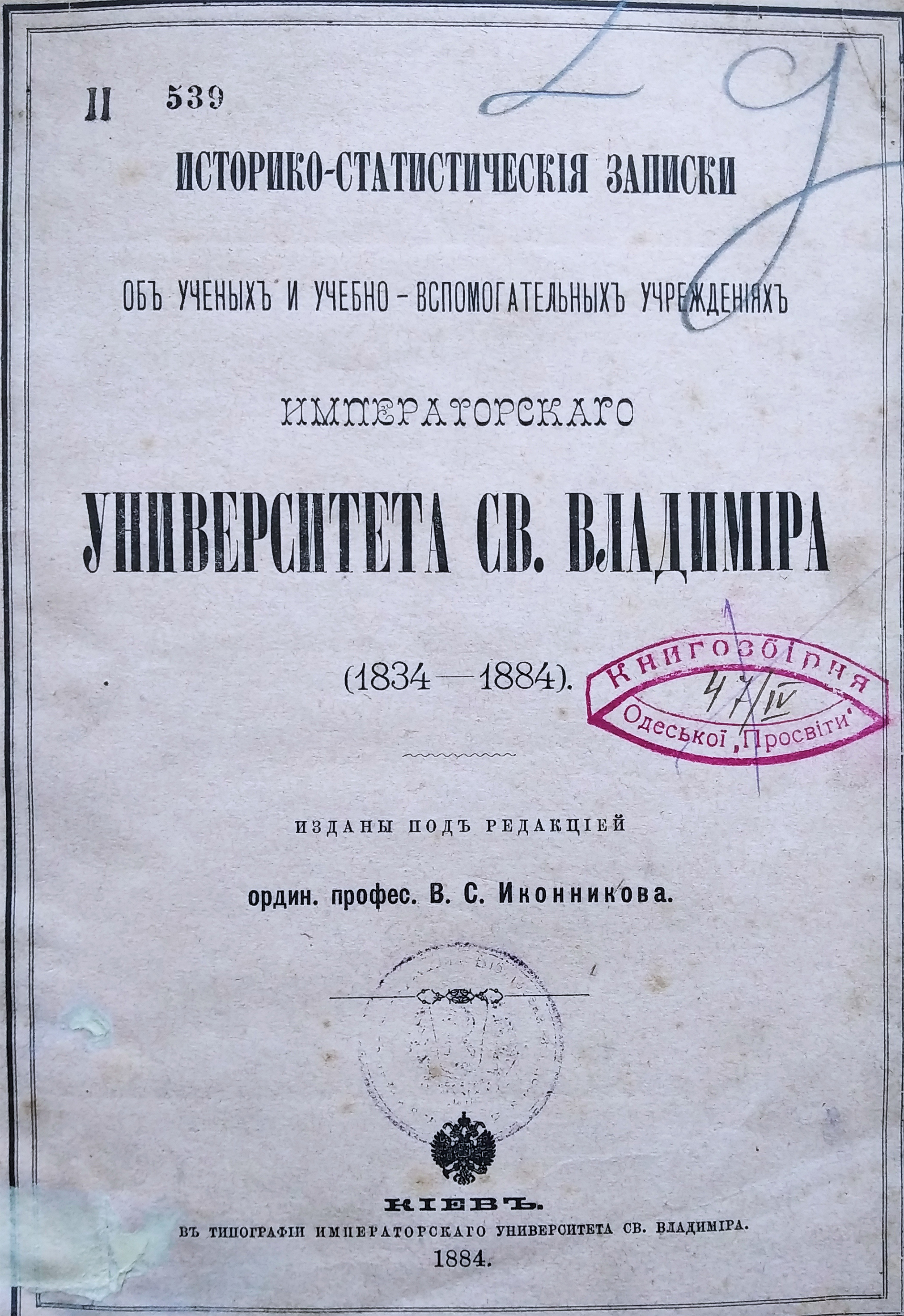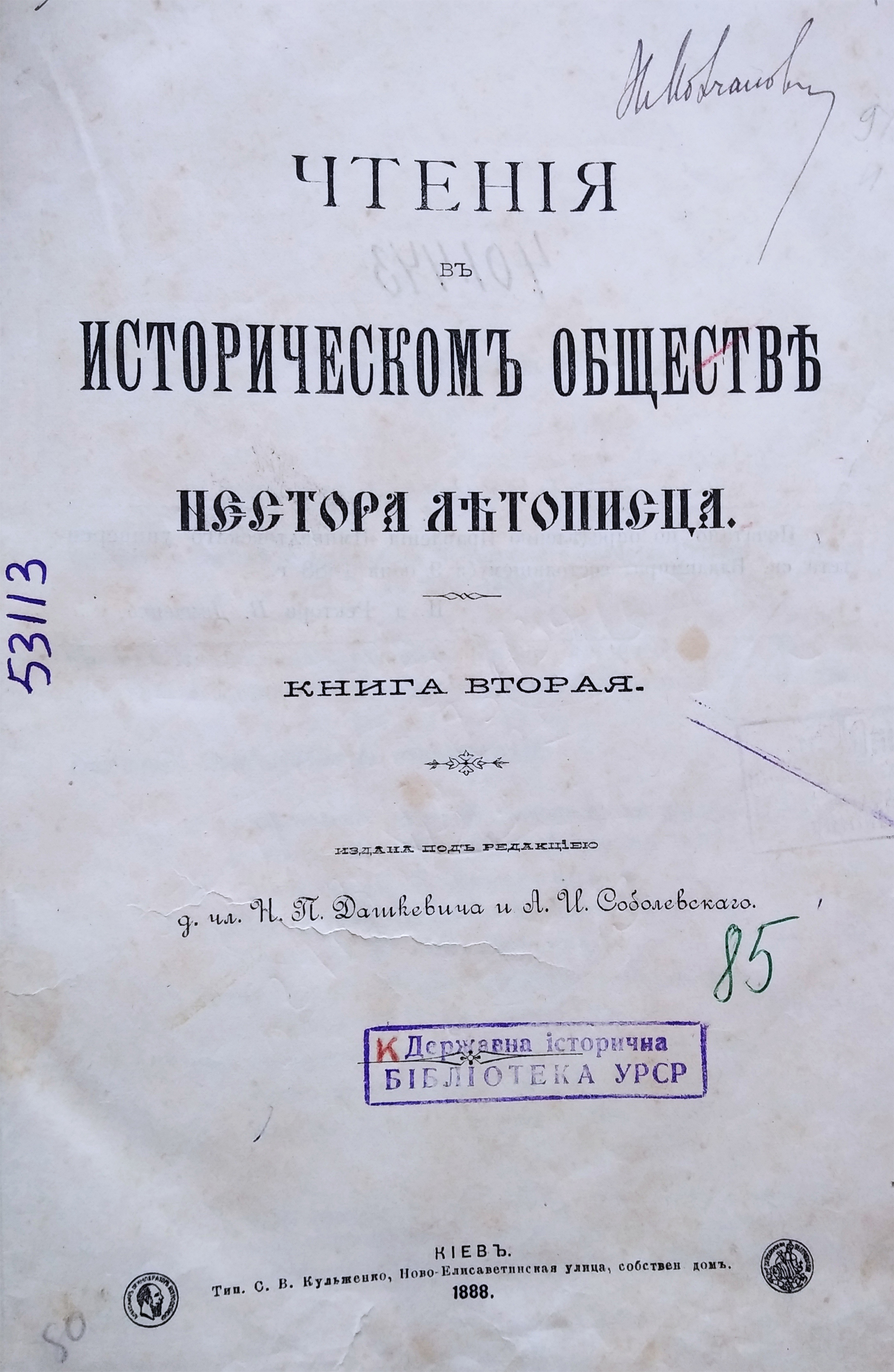 Представляємо екземпляр першого тому знаменитої праці В. С. Іконникова «Опыт русской историографии», подарований автором Олексію Соболевському, теж активному діячу ІТНЛ і редактору другої книги «Чтений».
