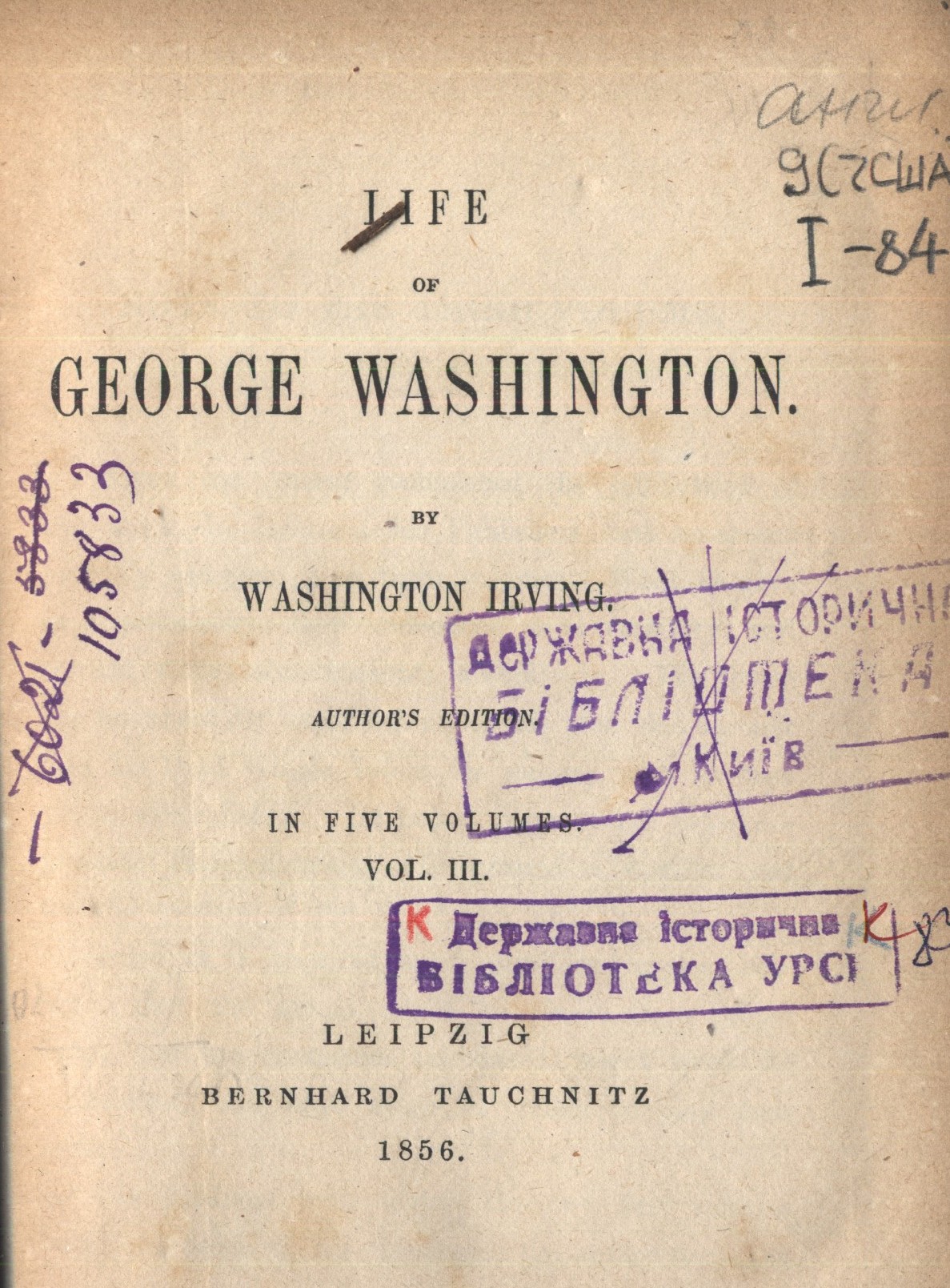 Washington, Irving. Lebensgeschichte Georg Washington's. Von Washington Irving. Aus dem Englischer von den Übersetzer der Werke Prescott's [Текст]. Bd. 3 / I. Washington. - Leipzig : F. A. Brockhaus, 1857. - 471 s. - Нім.
