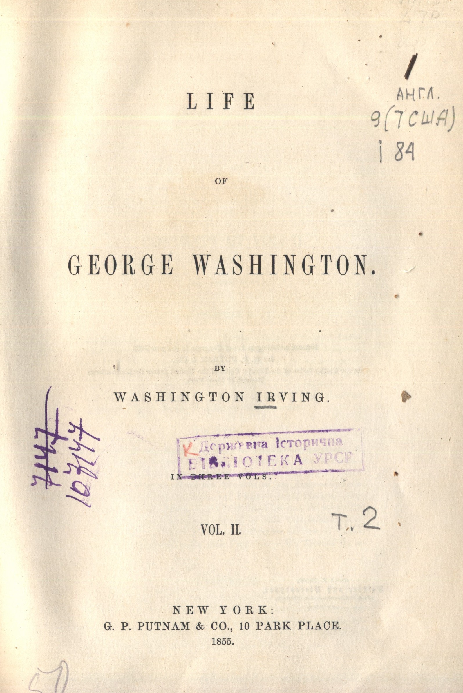 Irwing, Washington. Lebensgeschichte Georg Washington's [Текст] . Т. 2 / W. Irwing. - Leipzig : Brockhaus, 1856. - XVI, 484 s. - Нім.