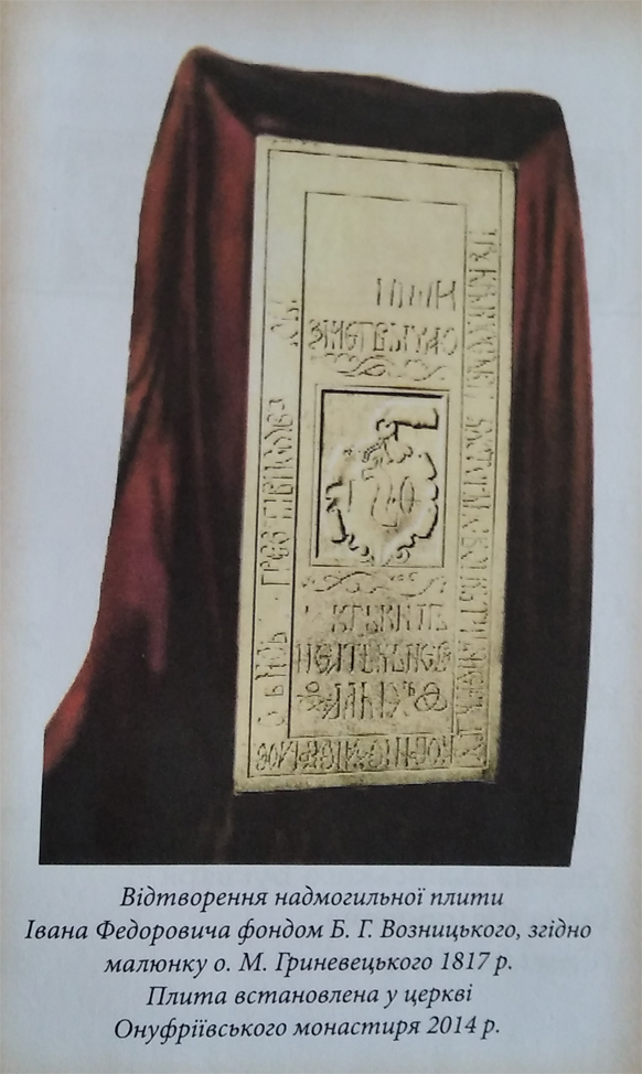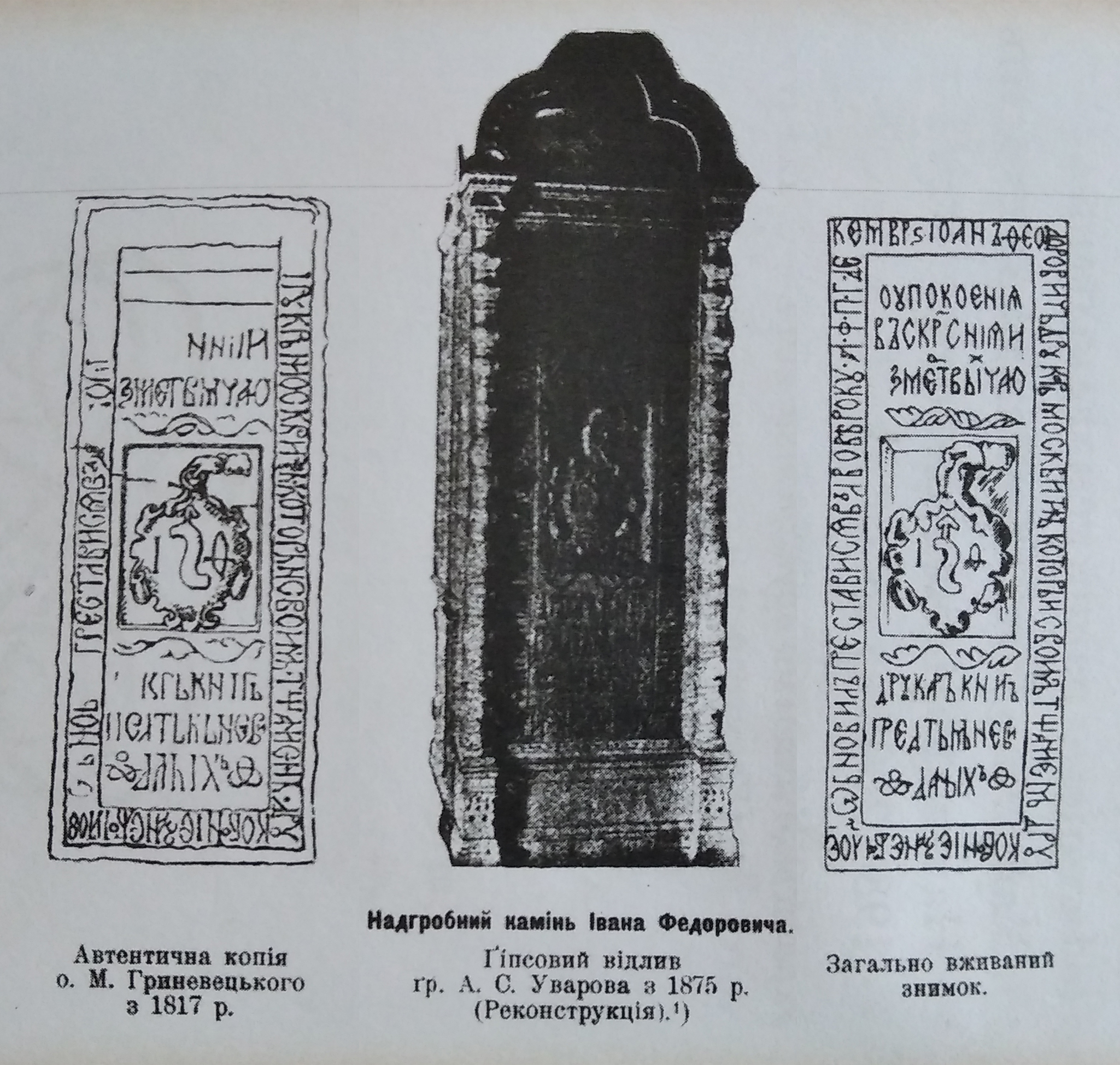 Вдячні міщани поховали друкаря «книг пред тим невиданих» при церкві св. Онуфрія на Підзамчі» [20, с. 533]. Окреме місце серед письмових джерел, що стосуються Івана Федорова (Федоровича), займає епіграфічна пам’ятка, його епітафія (надгробна плита), яка не збереглась до наших днів, текст напису або малюнок якої подав М. Гриневецький (в 1817 р.) [18, с. 18].