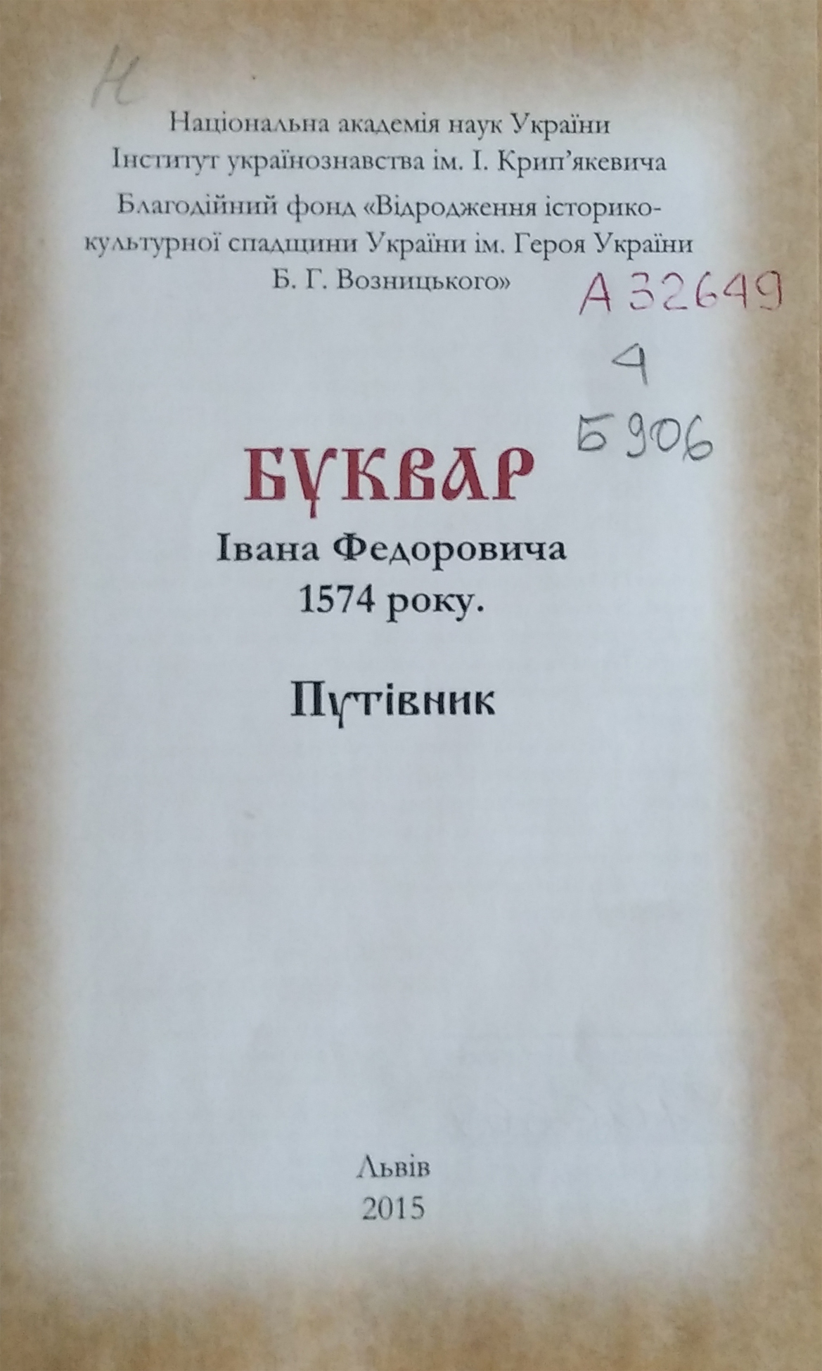 1. Буквар Івана Федоровича 1574 року : путівник / НАН України, Інститут українознавства ім. І. Крип’якевича, Благодійний фонд «Відродження історико-культурної спадщини України ім. Героя України Б. Г. Возницького» ; упоряд. : І. Жук, М. Литвин, А. Миронюк. – Львів : Бона, 2015. – 115 с.