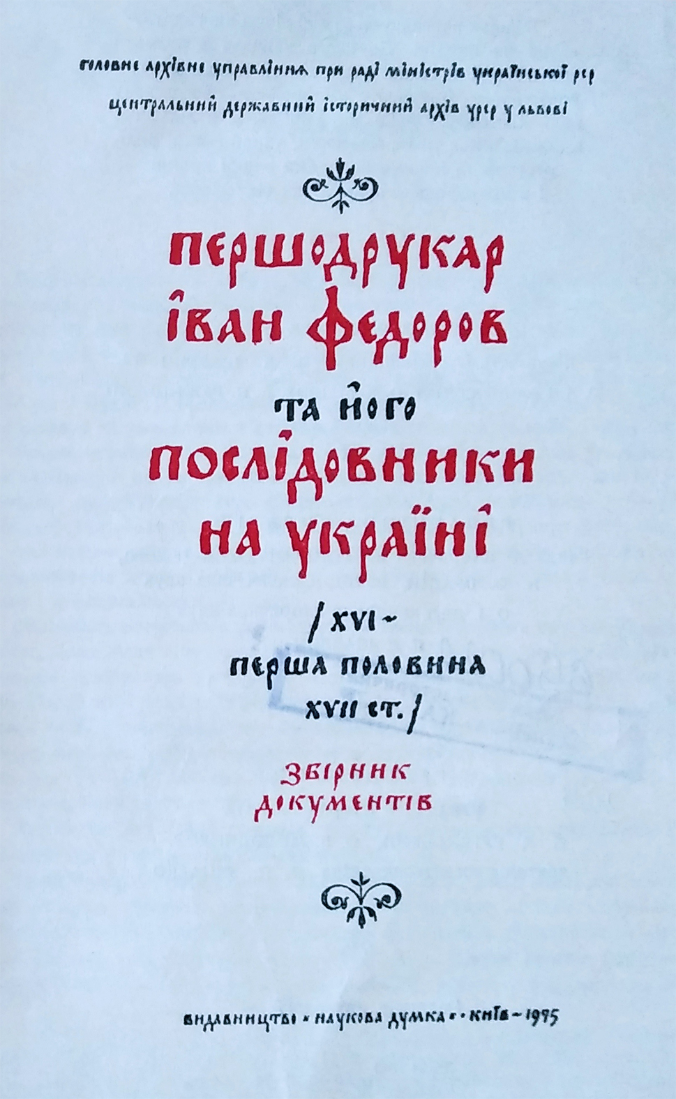 24. Першодрукар Іван Федоров та його послідовники на Україні (XVI – перша половина XVII ст.) : збірник документів : [присвяч. 400-річчю книгодрукування на Україні] / Рада Міністрів Української РСР, Головне архітектурне управління, Державний історичний архів Української РСР у Львові ; ред. кол. (голова) О. Г. Мітюков ; упоряд. : Я. Д. Ісаєвич [та ін.]. – Київ : Наукова думка, 1975. – 343 с. : 21 л. іл. – Текст документів латинською та польською мовами, в перекладі на українську.