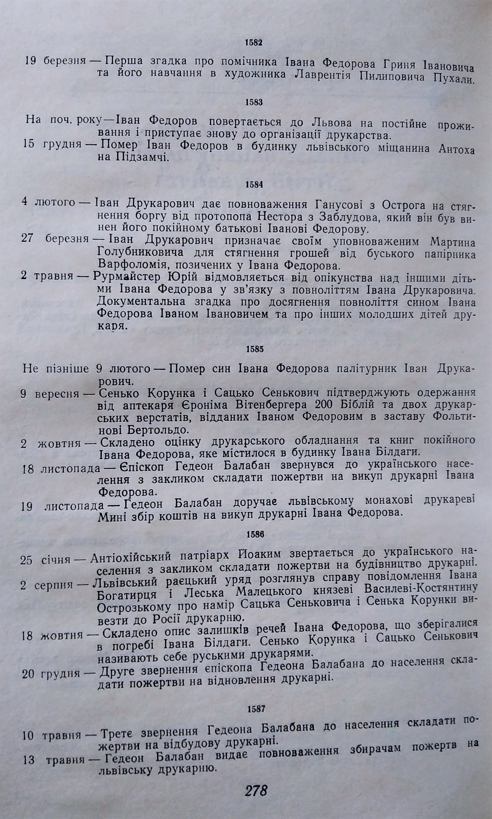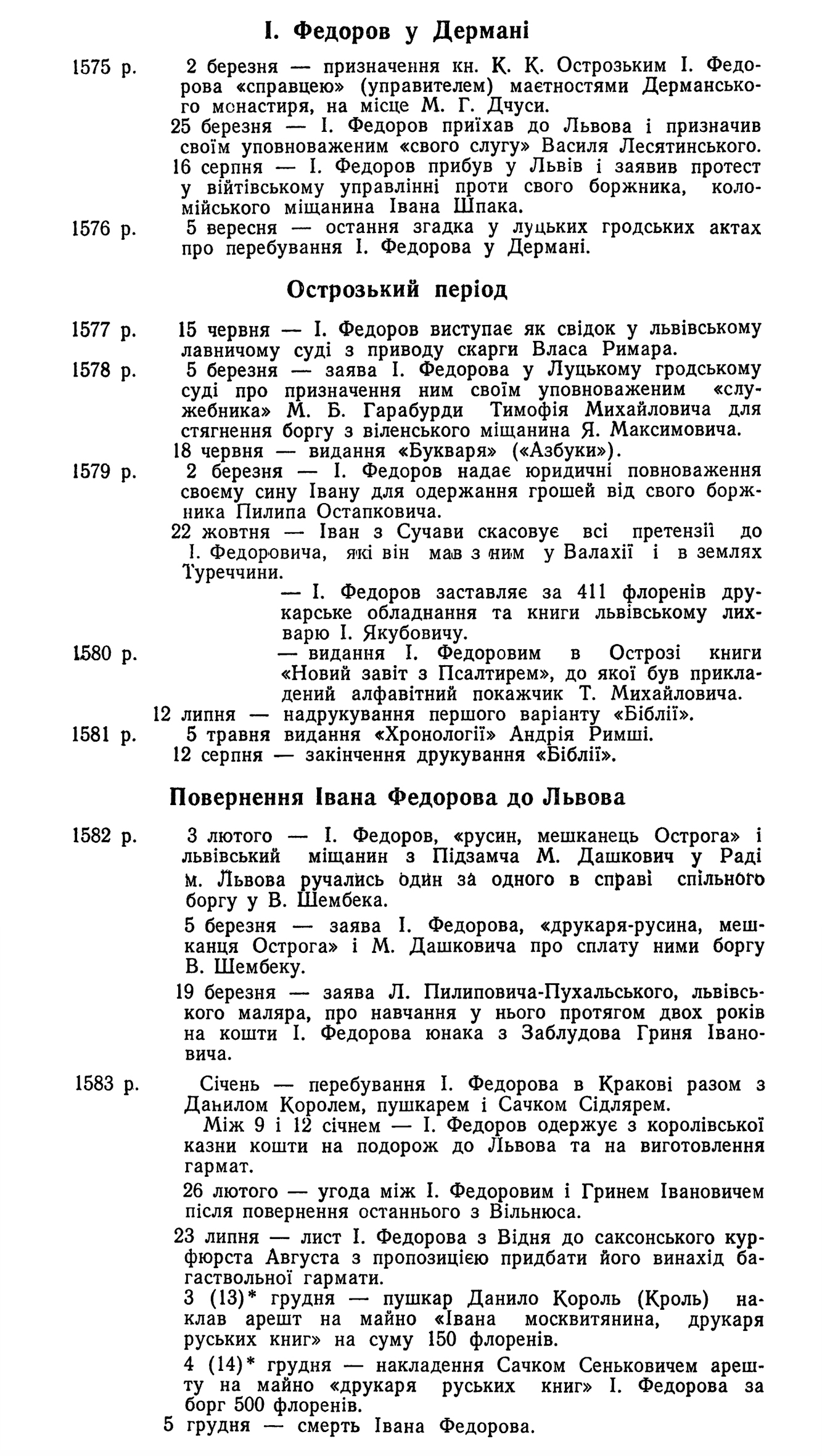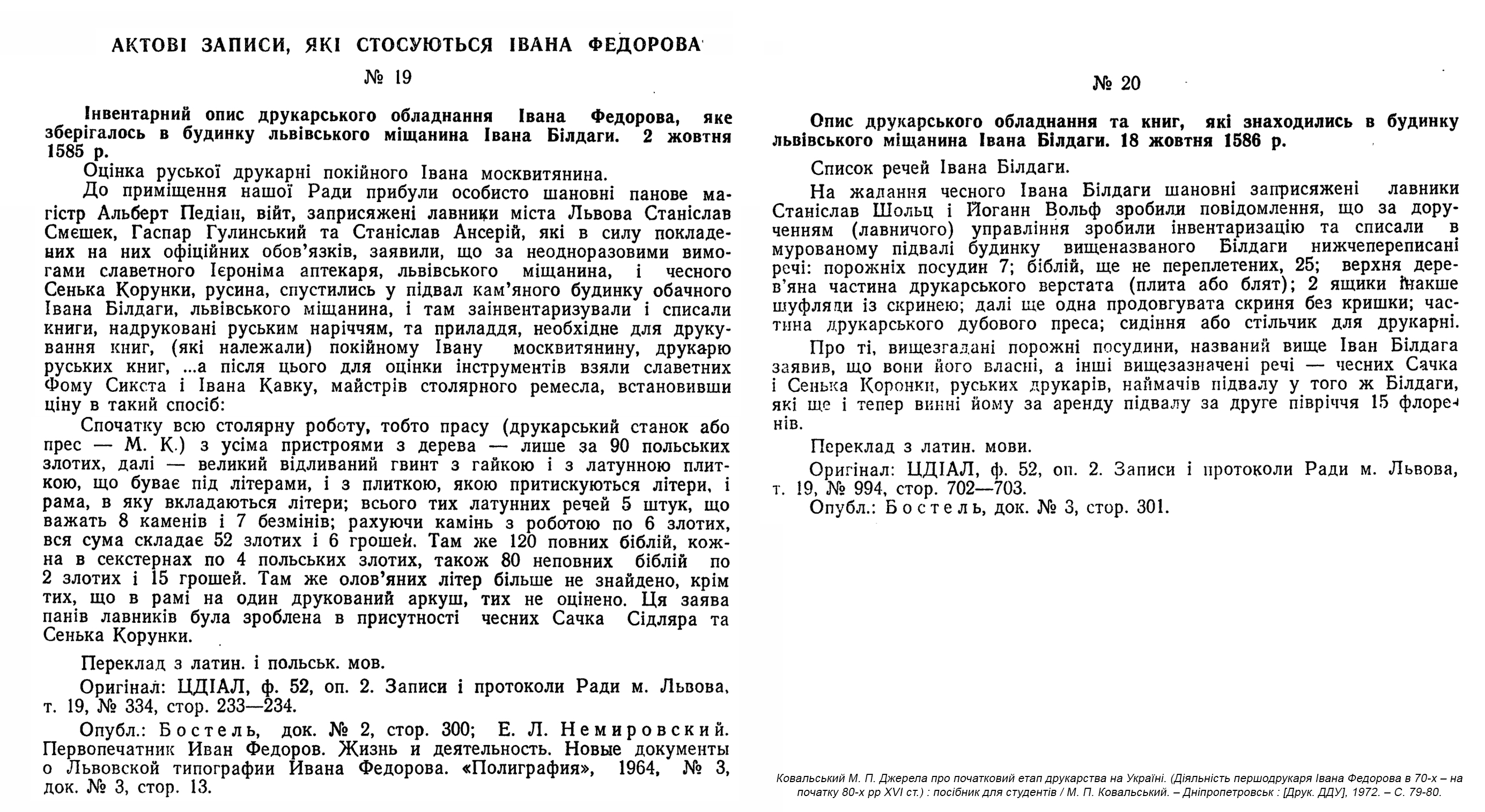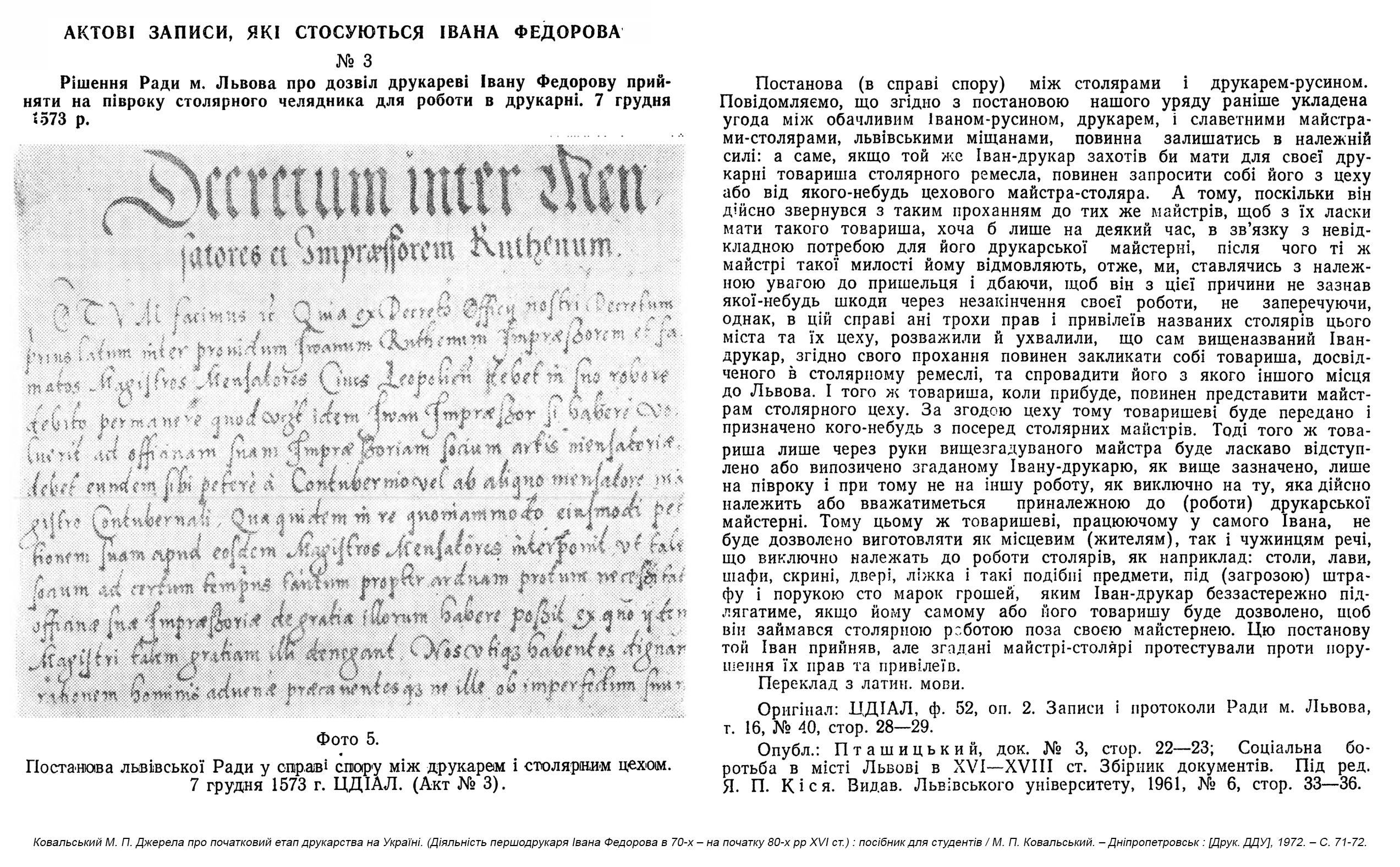 1. Актові записи про спір друкаря з львівським цехом столярів щодо найму челядника столярного ремесла для потреб друкарні […], 26 січня 1573 р. – перша згадка в записах львівських актів про Івана Федорова. Документи свідчать, що у Львові, мабуть, був відсутній досвід організації друкарні, а тому довелось звернутись за консультацією до краківських друкарів, коли Федорову треба було найняти столяра [18, с. 38-39, 59].