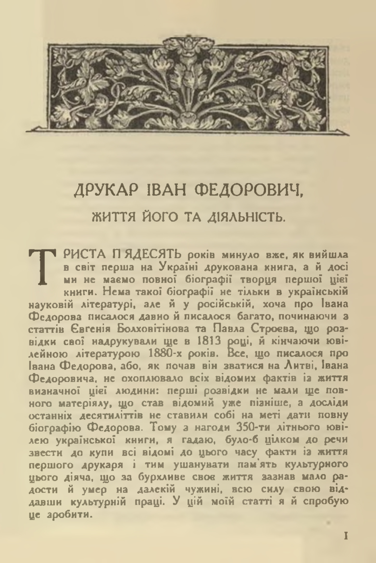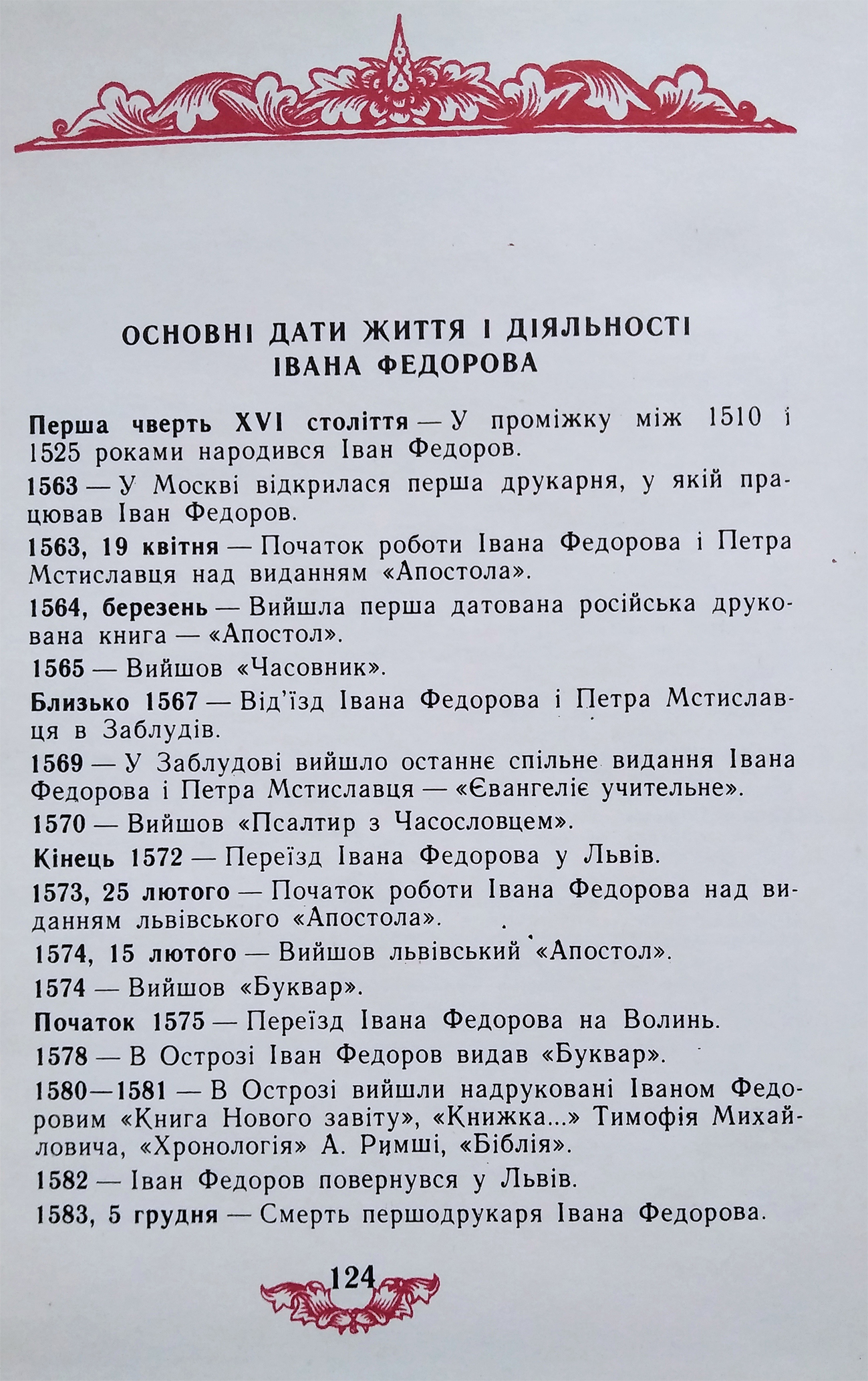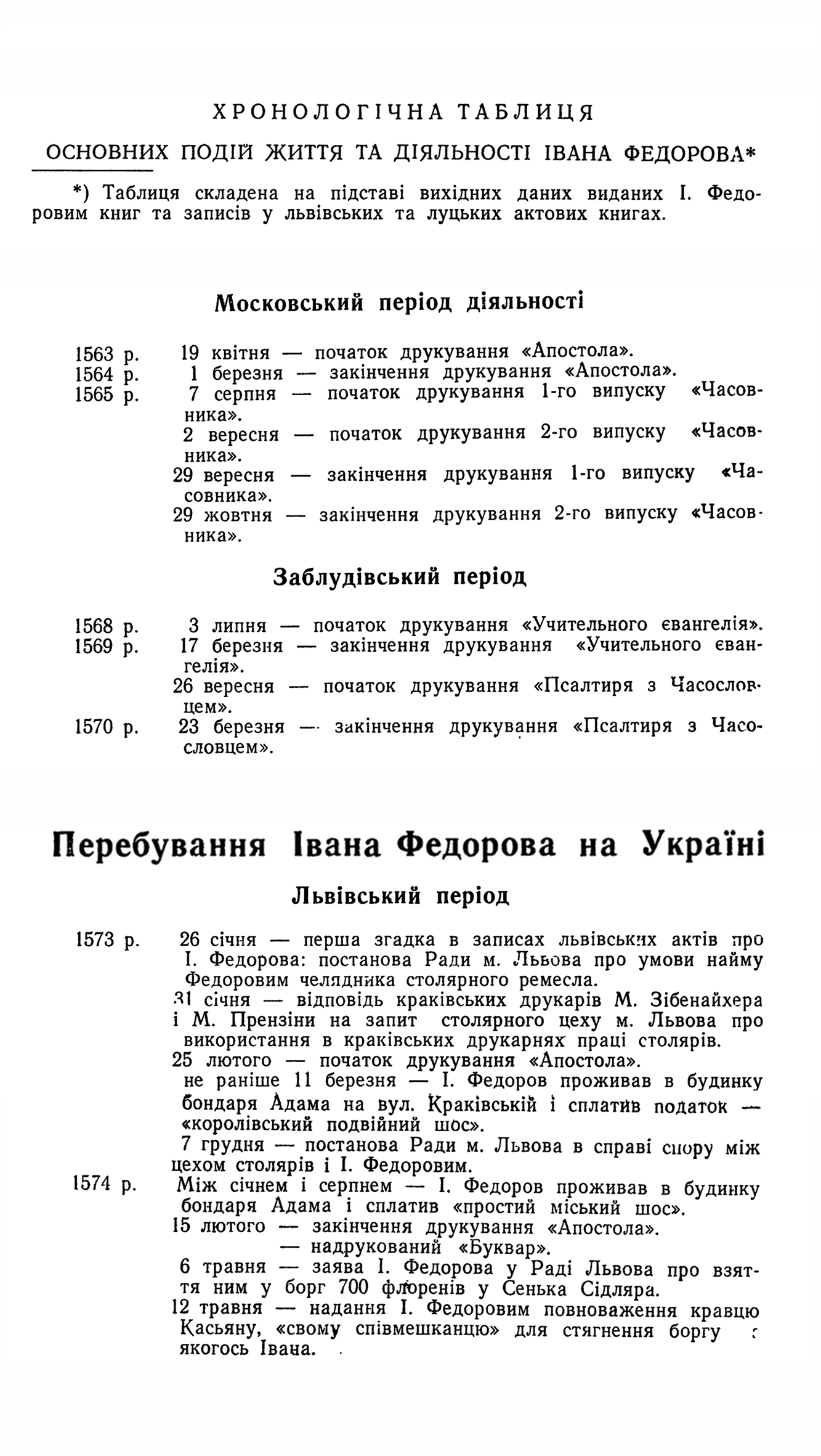 Десятирічне перебування Івана Федорова (Федоровича) на українських землях було найбільш плідним в його друкарській діяльності часом, насиченим багатьма подіями в його житті, коли виявились всебічні творчі інтереси друкаря, глибоке розуміння ним культурних та освітніх завдань своєї праці і покликання, що знайшло відображення у виданих ним в Україні книгах [18. с. 17].