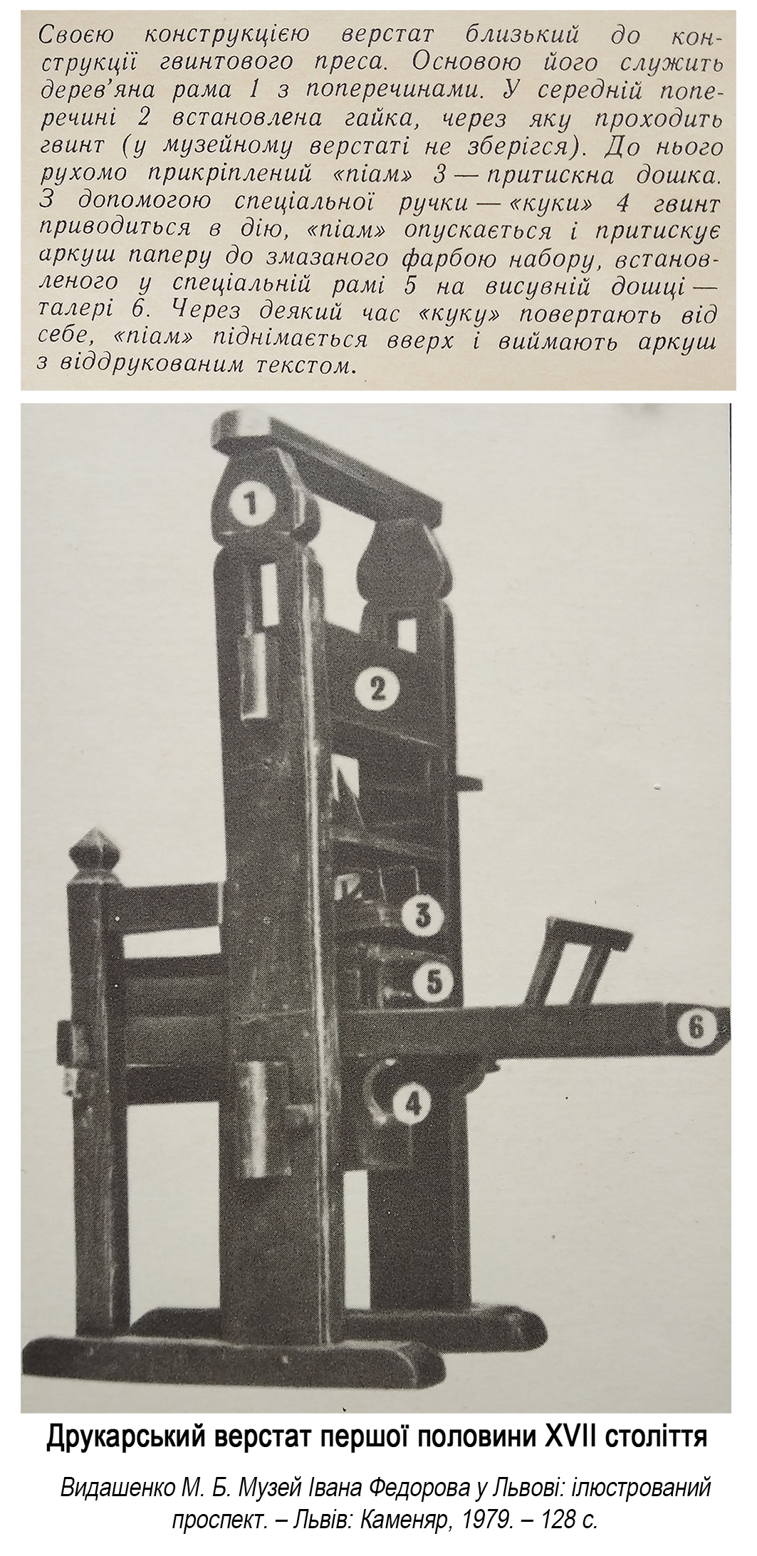 Джерельна база про останній період діяльності І. Федорова у Львові та долю його друкарського приладдя істотно поповнилась завдяки публікації шести документів із записів війтівського уряду і Ради Львова за 1585–1588 рр. [18, с. 42]. У львівському архіві збереглося два описи частини майна Івана Федорова. З цих документів можна скласти уявлення про конструкцію його друкарського верстата [2, с. 29].