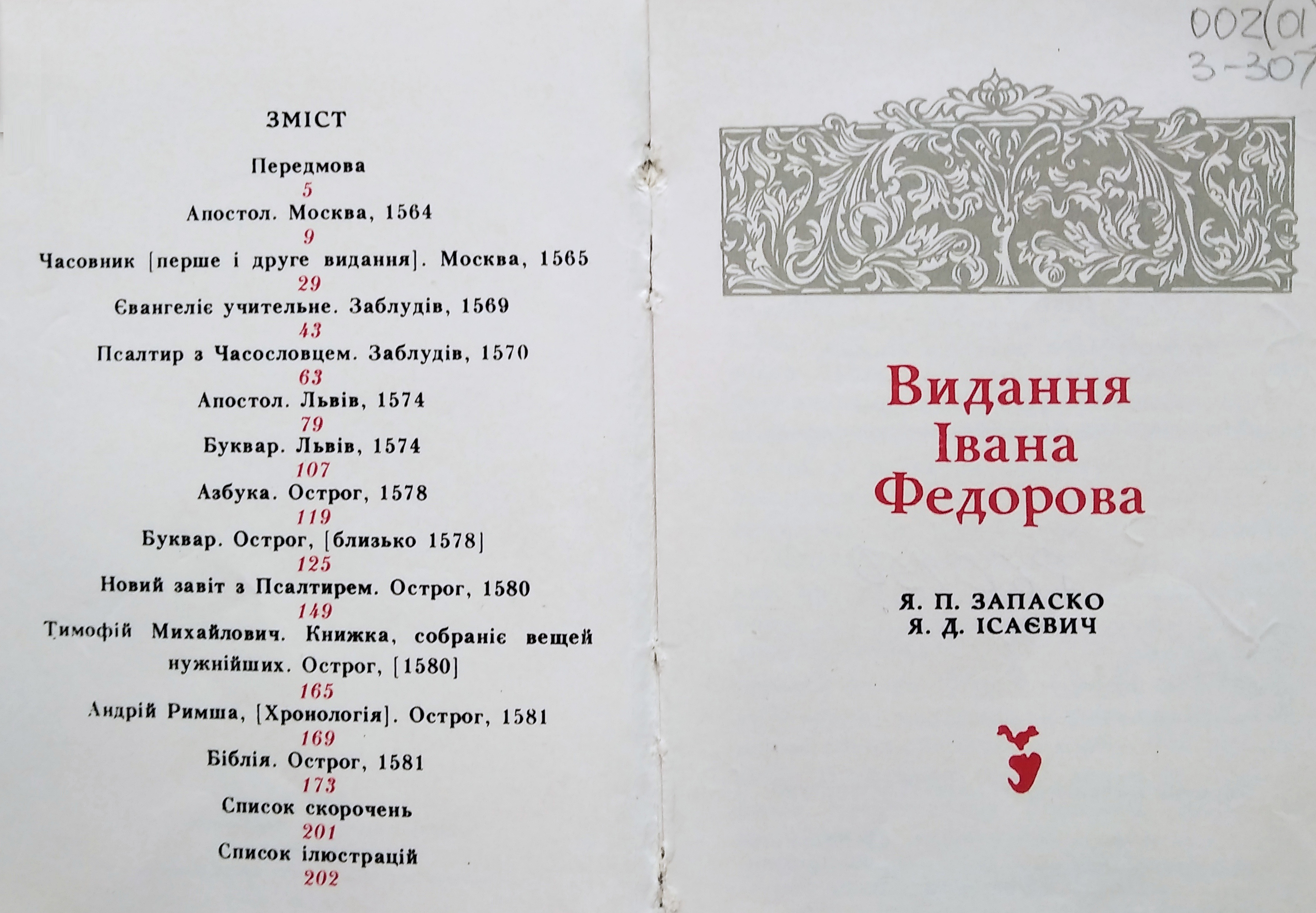 5. Запаско Я. П. Видання Івана Федорова / Я. П. Запаско, Я. Д. Ісаєвич. – Львів : Вища школа. Вид-во при Львівському ун-ті, 1983. – 206 с. : іл. ; 60х90 мм.