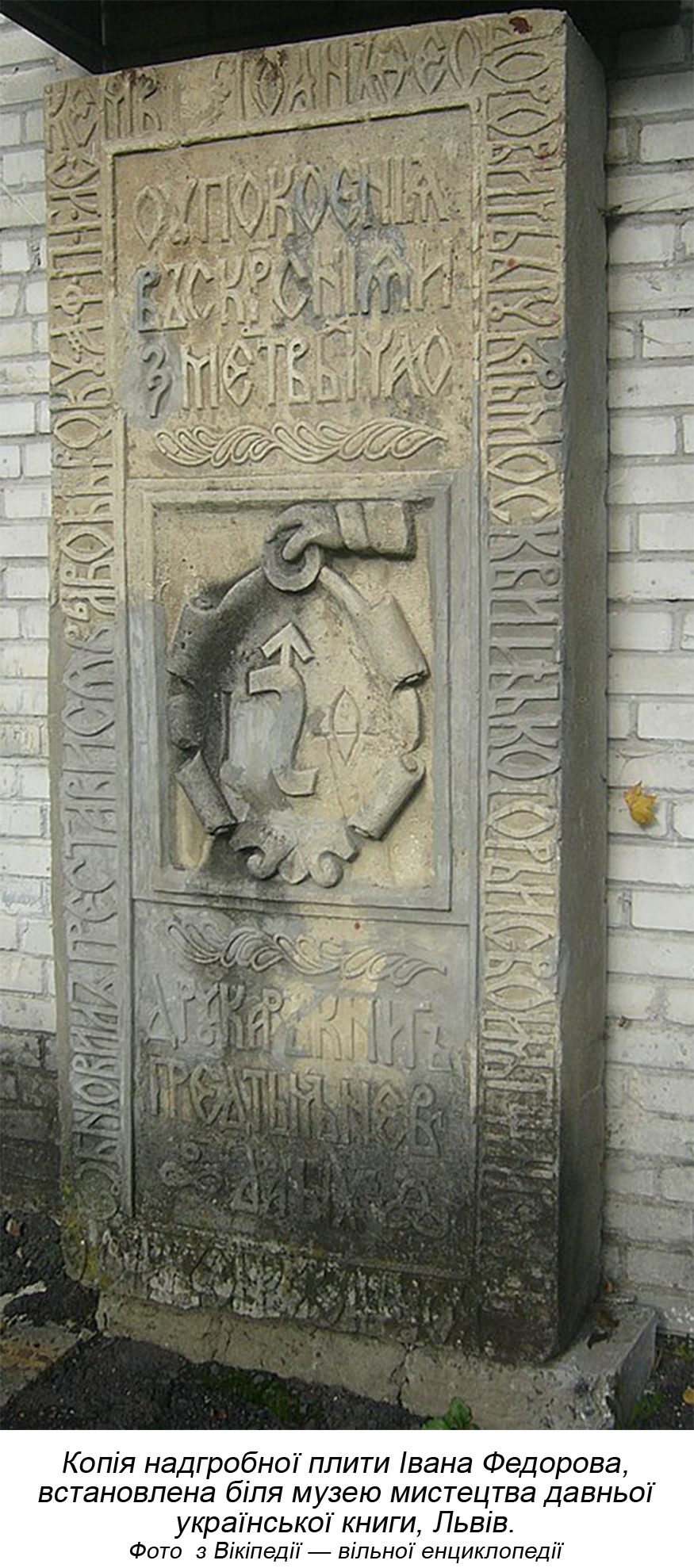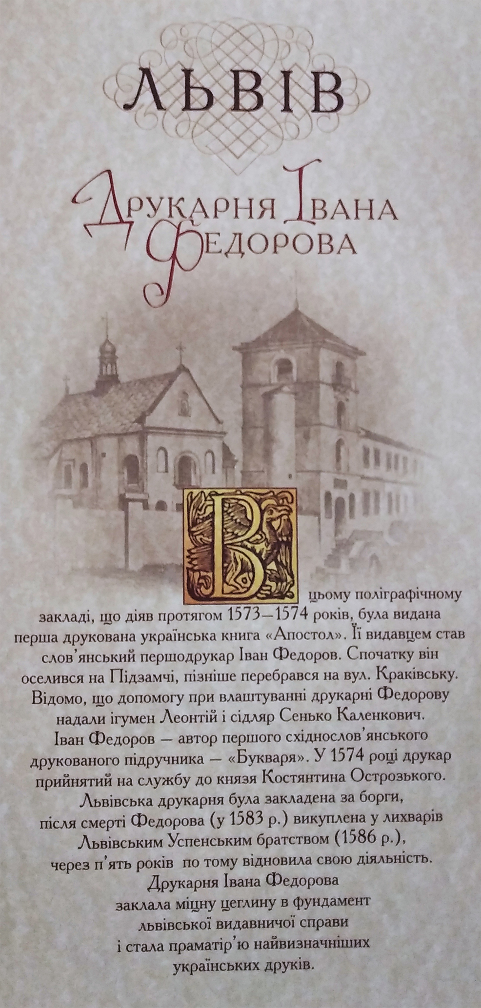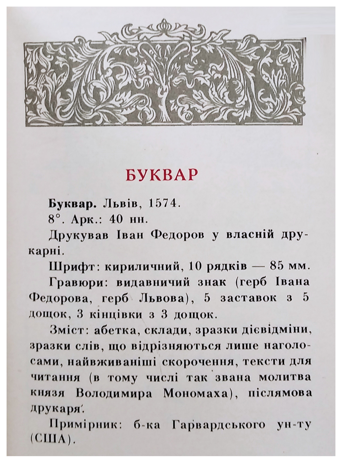 Глибоко розуміючи значення освіти для народу, Іван Федоров[ич] 1574 року видає у Львові «Буквар» – перший друкований підручник у східних слов’ян. Назва книги умовна, деякі дослідники називають її «Граматикою» («Грамматикия»). Титульного аркуша у виданні ще не було (як і в Апостолі), але на останній сторінці книги стояв друкарський знак Івана. Федорова з вирізьбленими літерами «ІОАН» і гербом Львова. Під зображенням – підпис: «Видруковано у Львові року 1574» [33, с. 353].