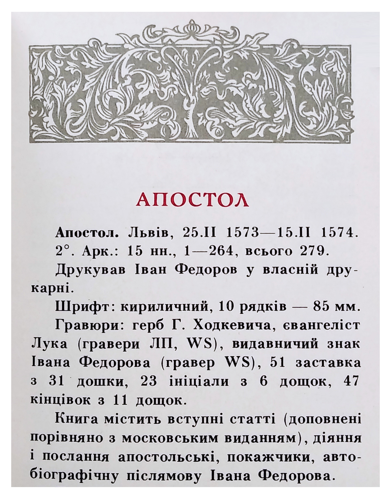 28. Апостол [Електронний ресурс]. – Львів : Друкарня Івана Федорова, 1574. – [16], 264, [2] арк. : ил. Ілюстрації, заставки, кінцівки, в’язь, ініціали, рамки маргіналій; 2°. – Режим доступу : http://irbis-nbuv.gov.ua/ulib/item/UKR0000290 (дата звернення : 20.03.2022 р.). – Назва з екрана.