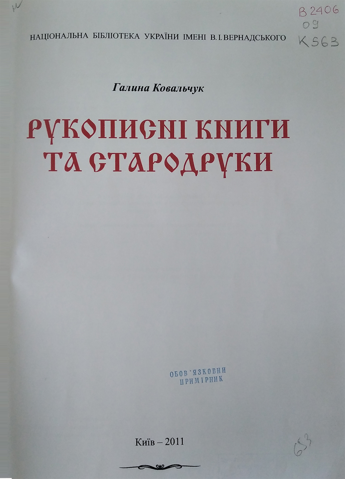 19. Ковальчук Г. І. Рукописні книги та стародруки : навчальний посібник / Г. І. Ковальчук ; Нац. б-ка України ім. В. І. Вернадського. – Київ, 2011. – 100 с., іл.
