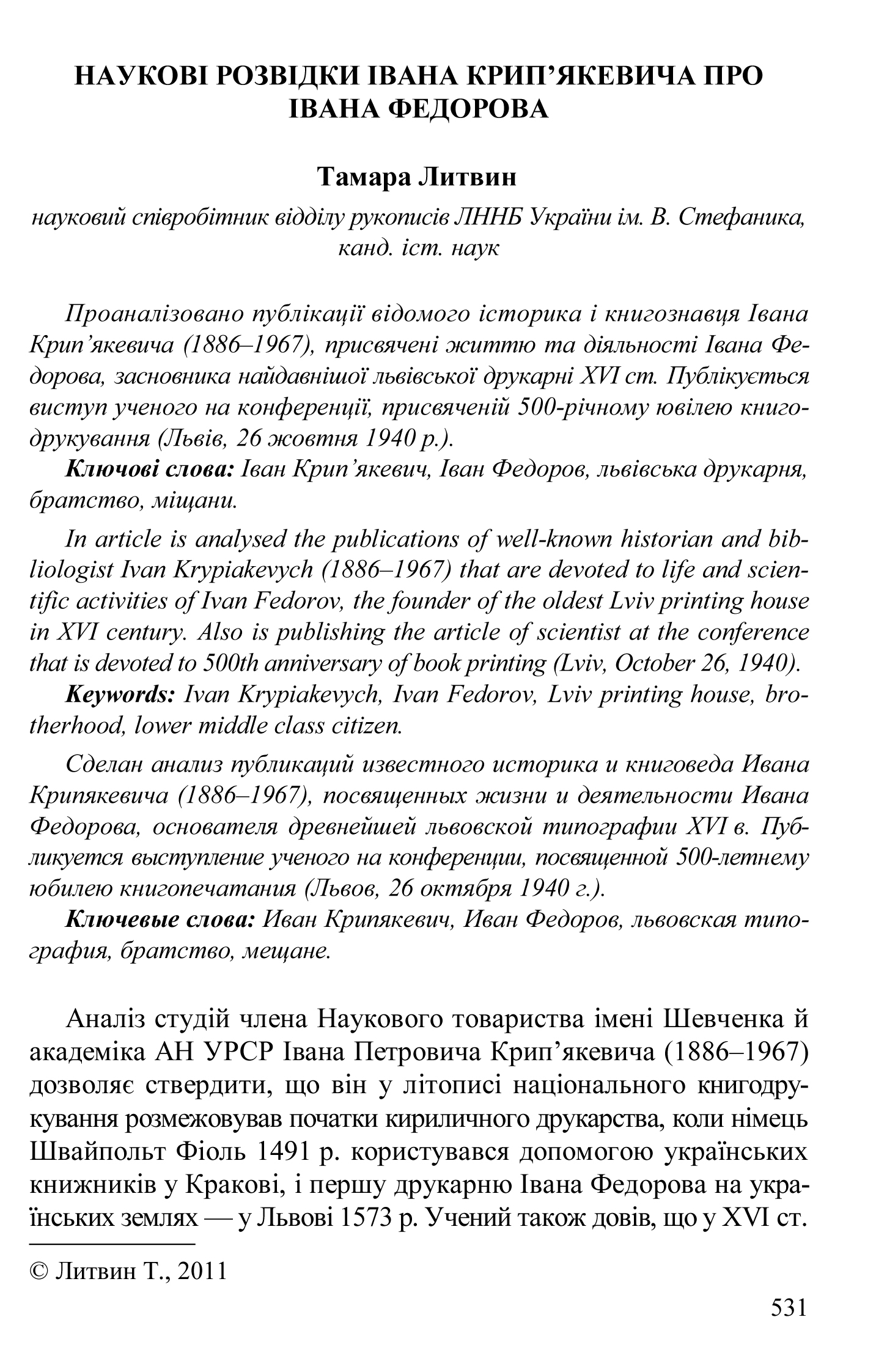 20. Литвин Т. Наукові розвідки Івана Крип’якевича про Івана Федорова / Т. Литвин // Зап. Львів. нац. наук. б-ки України ім. В. Стефаника : збірник наукових праць. – 2011. – Вип. 3 (19). – С. 531–556. – З додатками : 1. Крип’якевич І. Іван Федорів у Львові : [доповідь на науковій конференції, присвяченій 500-річному ювілею винаходу книгодрукування Й. Ґутенберґом, 26 жовтня 1940 р., Львів] ; 2. Рукописна карта «Діяльність Ів. Федорова XVI [ст.]», виготовлена І. Крип’якевичем.