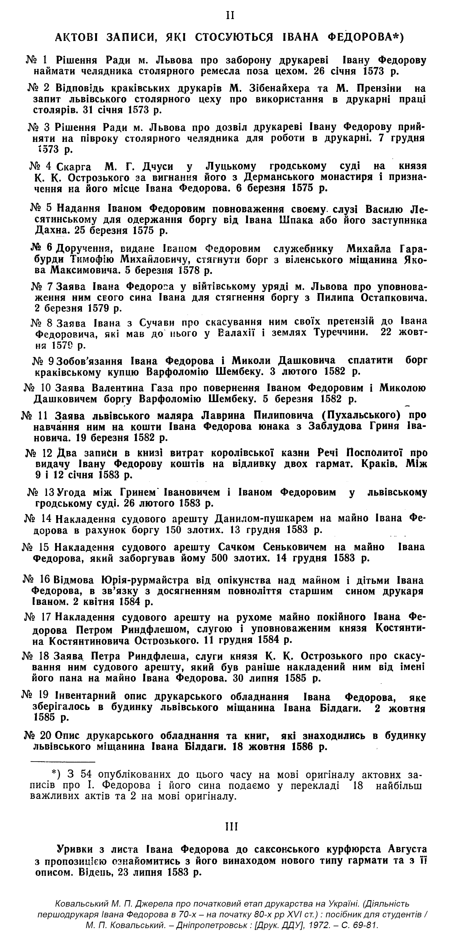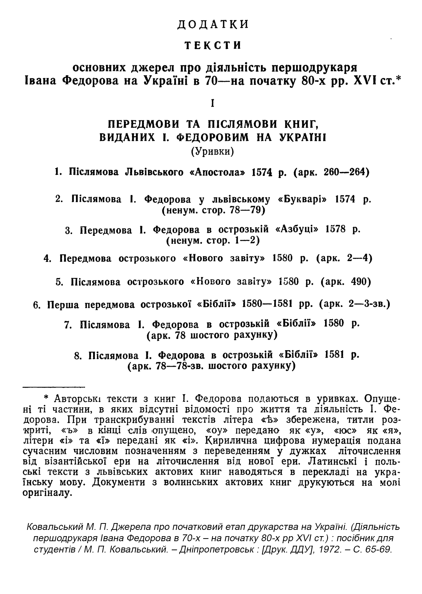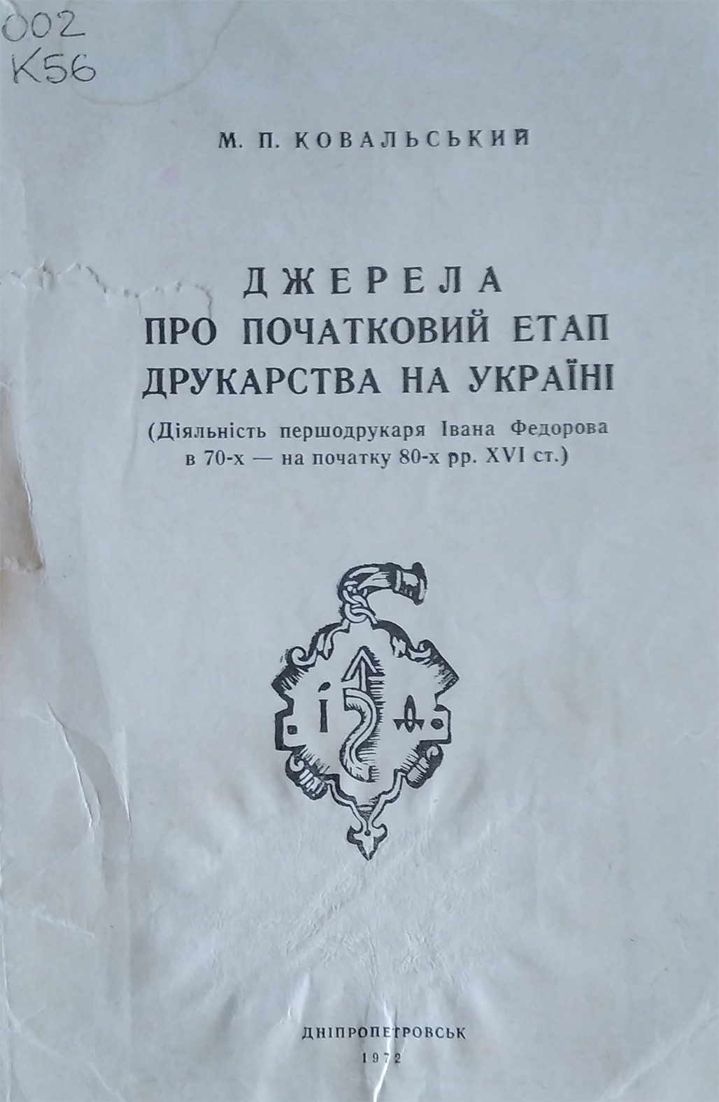 18. Ковальський М. П. Джерела про початковий етап друкарства на Україні. (Діяльність першодрукаря Івана Федорова в 70-х – на початку 80-х рр XVI ст.) : посібник для студентів / М. П. Ковальський. – Дніпропетровськ : [Друк. ДДУ], 1972. – 83 с. : іл.