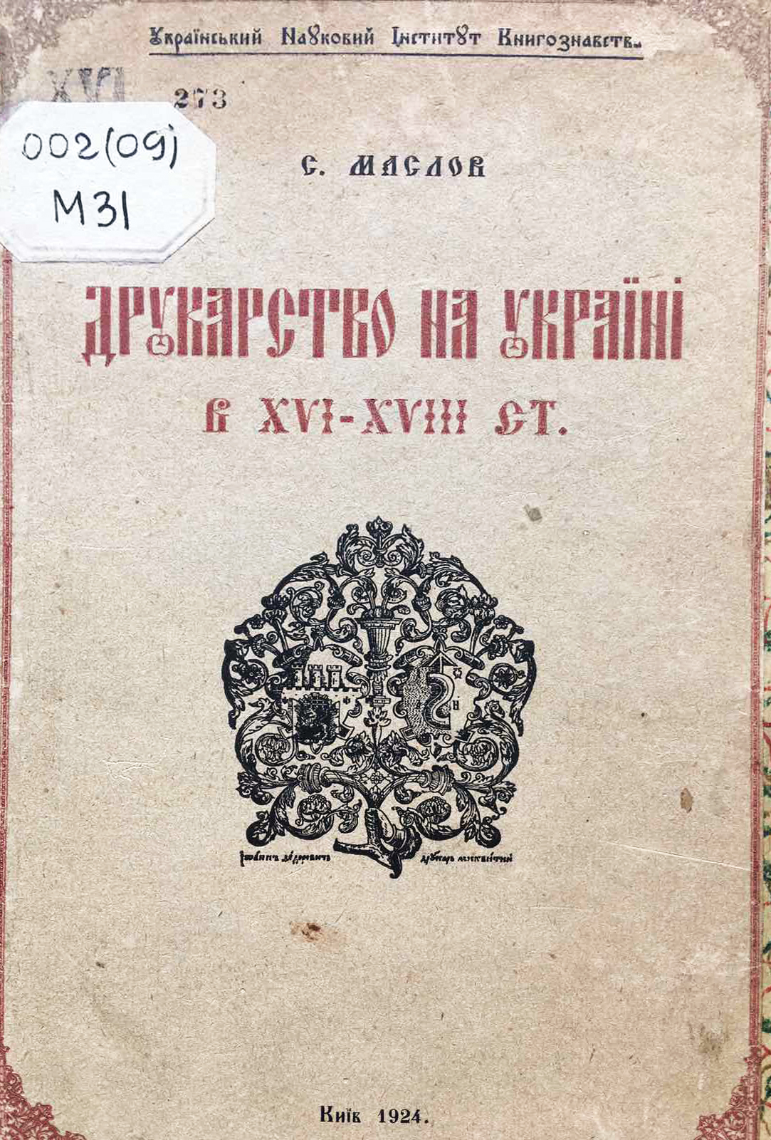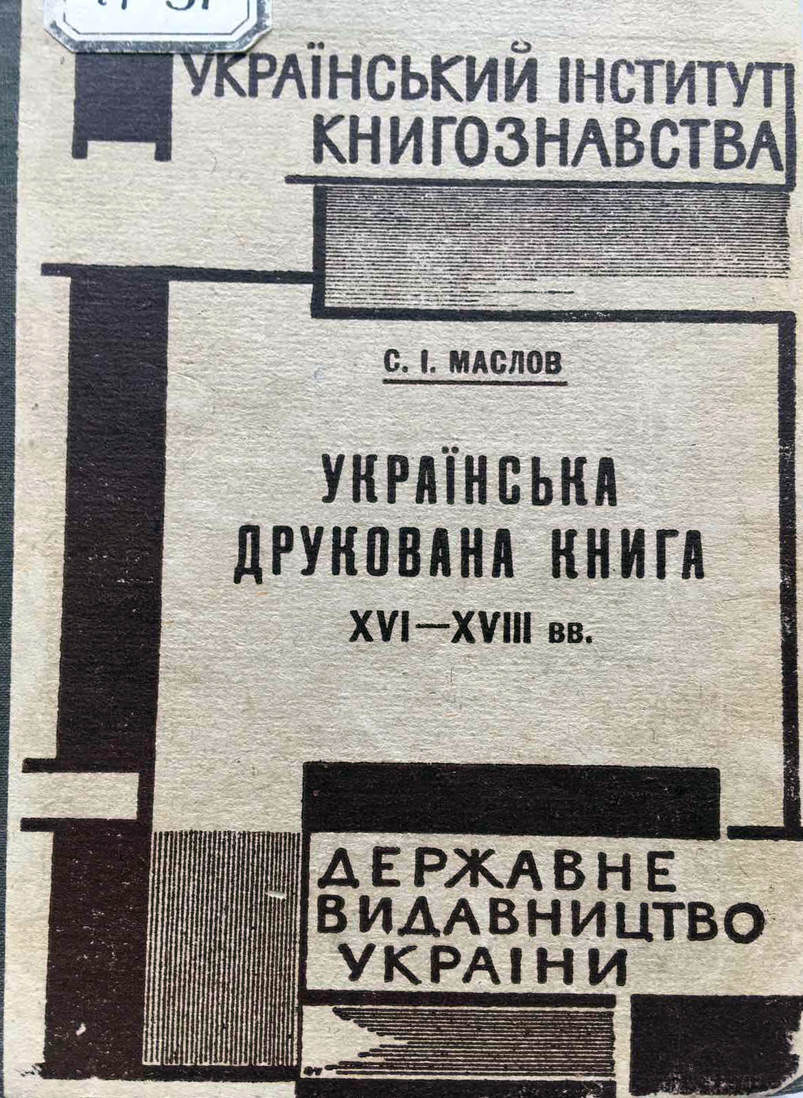 22. Маслов С. І. Українська друкована книга XVI-XVIII вв. / С. І. Маслов; Український науковий інститут книгознавства. – Київ: Державне видавництво України, 1925. – 76 с. – (Науково-популярна бібліотека книгознавства ; вип. 4).