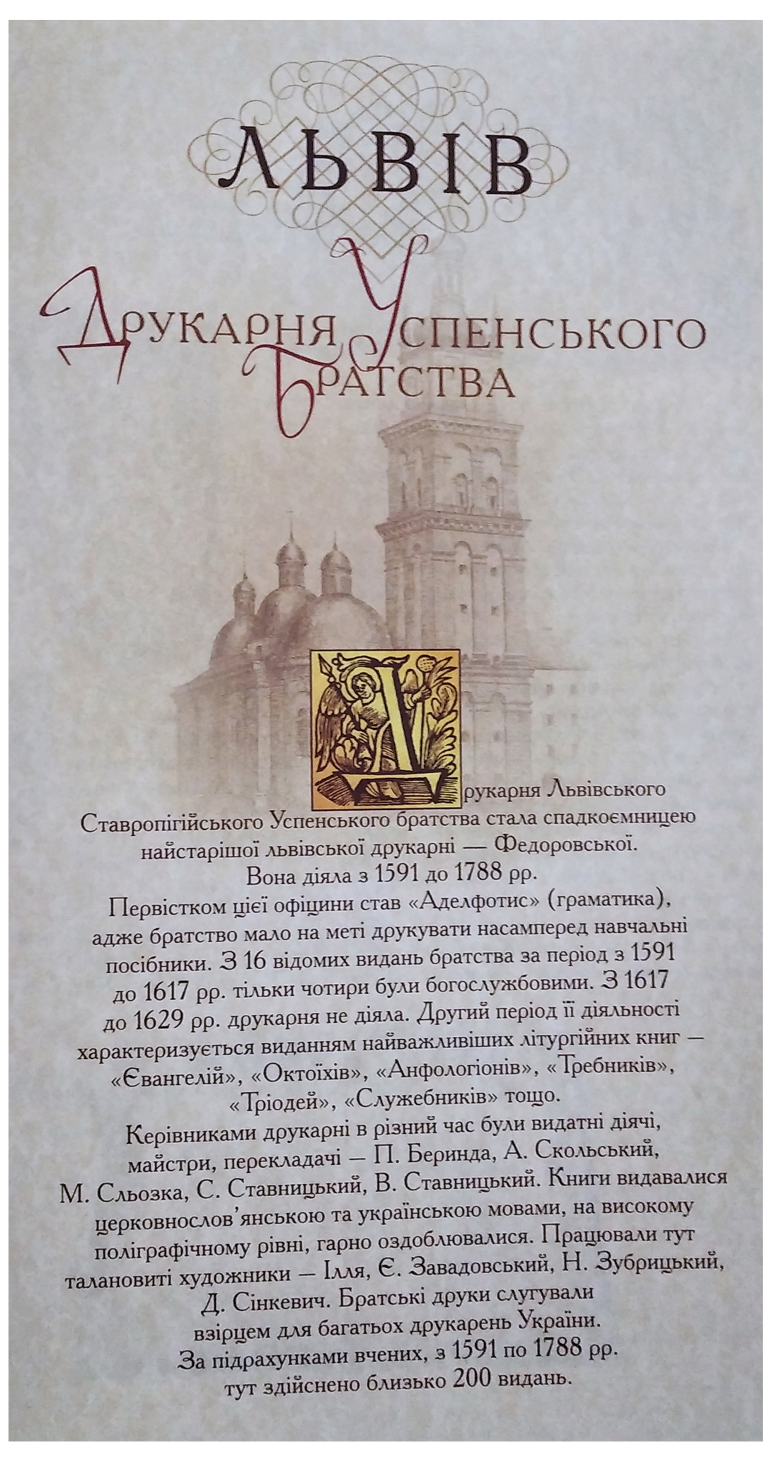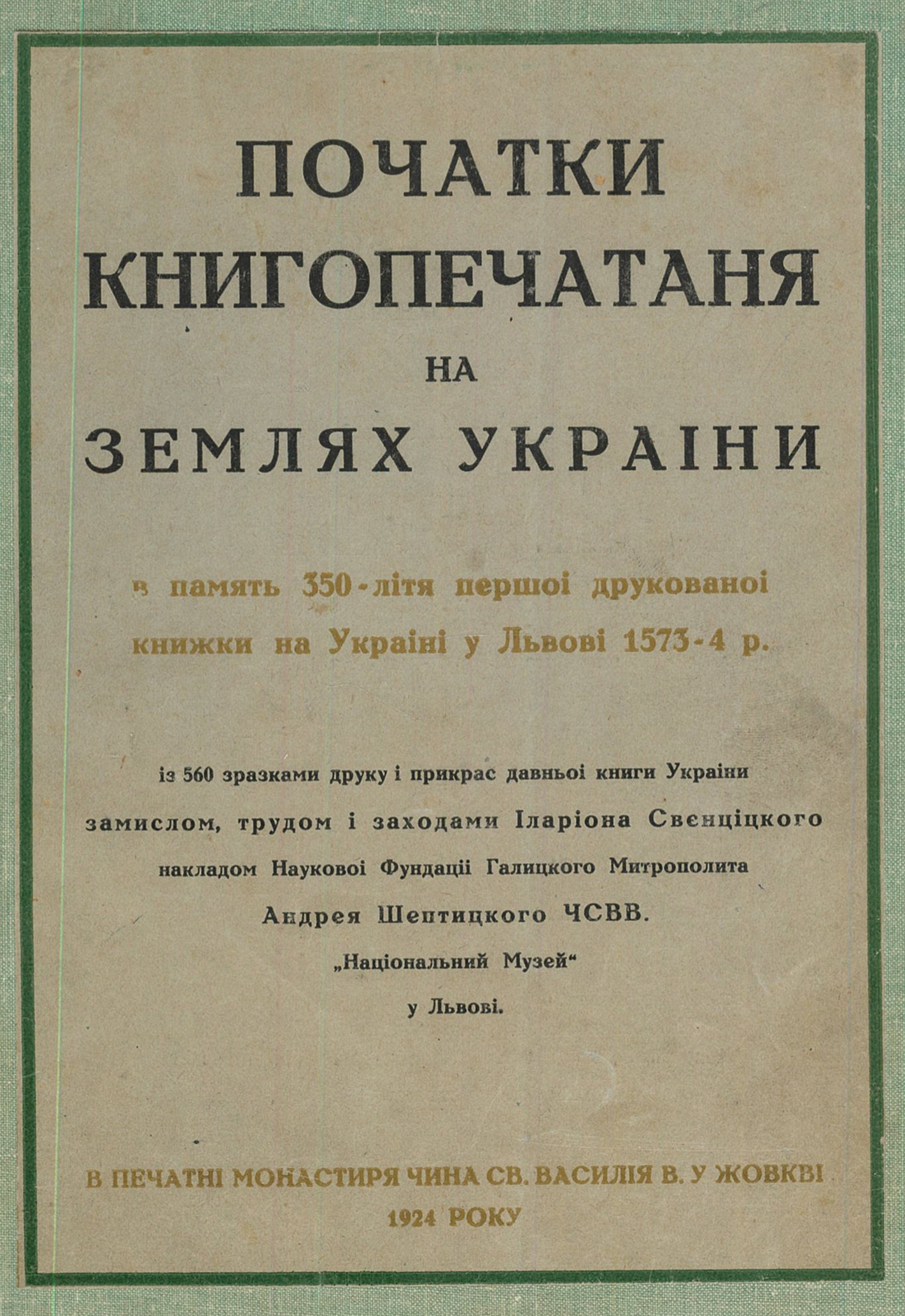 25. Свєнціцкий, Іларіон. Початки книгопечатаня на землях України: в память 350-ліття першої друкованої книжки на Україні у Львові 1573-4 р. [Електронний документ] : із 560 зразками друку і прикрас давньої книги України / замислом, трудом і заходами Іларіона Свєнціцкого ; накладом Наукової фундації Галицького митрополита Андрея Шептицького ЧСВВ ; «Національний Музей» у Львові. – Жовква : В печ. монастиря чина св. Василія Вел. , 1924. – 85 с. : CLI, 1 арк. іл. – Режим доступу : https://nibu.kyiv.ua/elfond/svjencickyj_pochatky_knygopechatannja_na_zemljah_ukr/svjencickyj_pochatky_knygopechatannja_na_zemljah_ukr.pdf