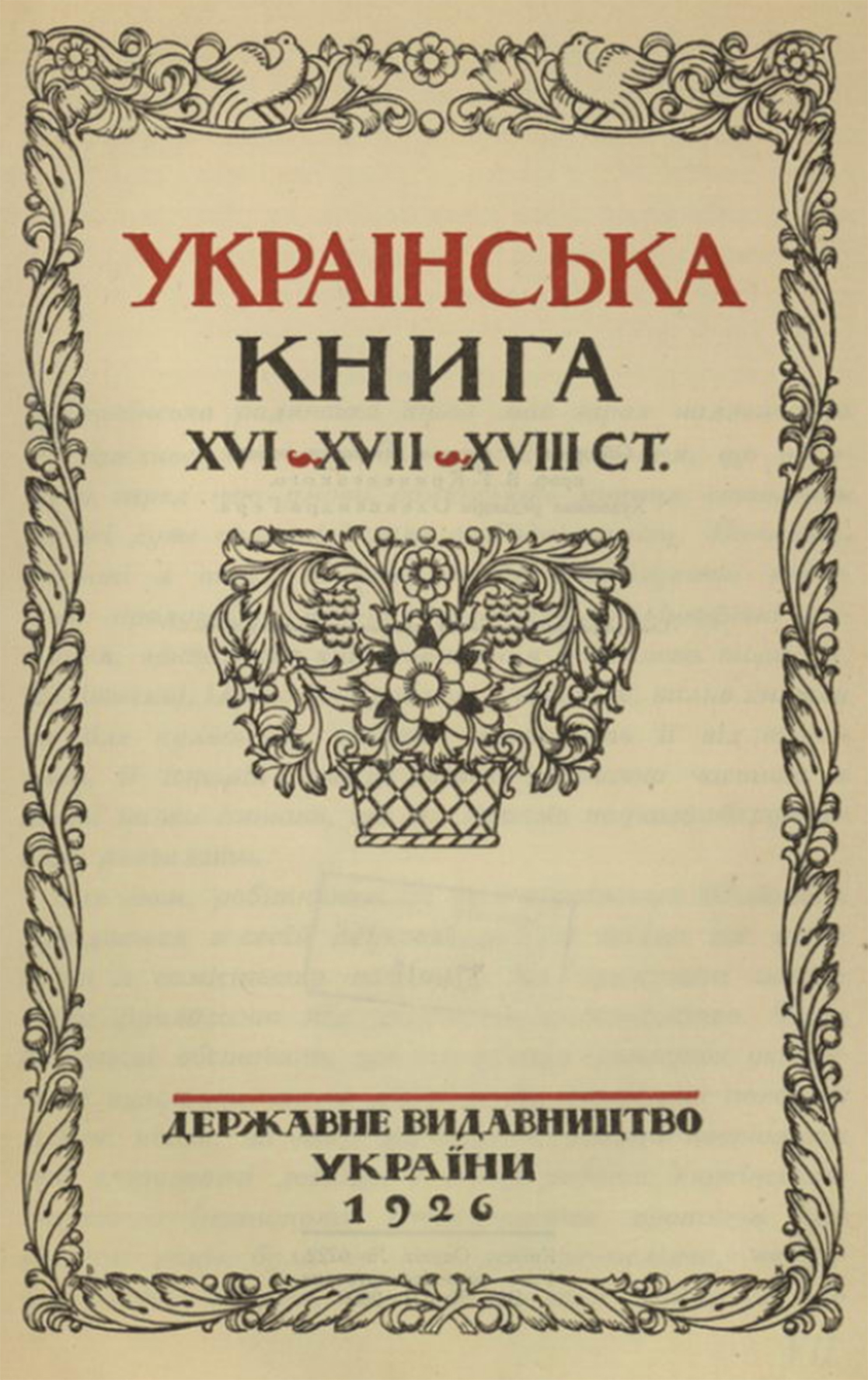 27. Українська книга XVI-XVII-XVIII ст. / Укр. наук. ін.-т книгозн-ва ; обгортка та тит. стор. роботи проф. В. Г. Кричевського ; худож. ред. Олександра Гера. – Київ : Держ. вид-во України, 1926. – XV, I, 435 с. : іл. – (Труди Українського наукового інституту книгознавства ; т. 1).
