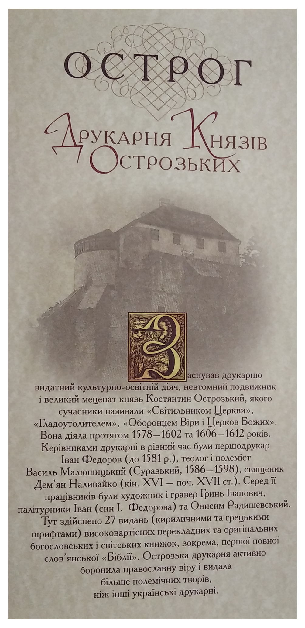 32. Музей книги та друкарства [Електронний ресурс] // Державний історико-культурний заповідник міста Острога : [вебсайт]. – 2023 – Режим доступу : https://ostrohcastle.com.ua/muzej-knygy-ta-drukarstva (дата звернення : 21.03.2022 р.). – Назва з екрана.