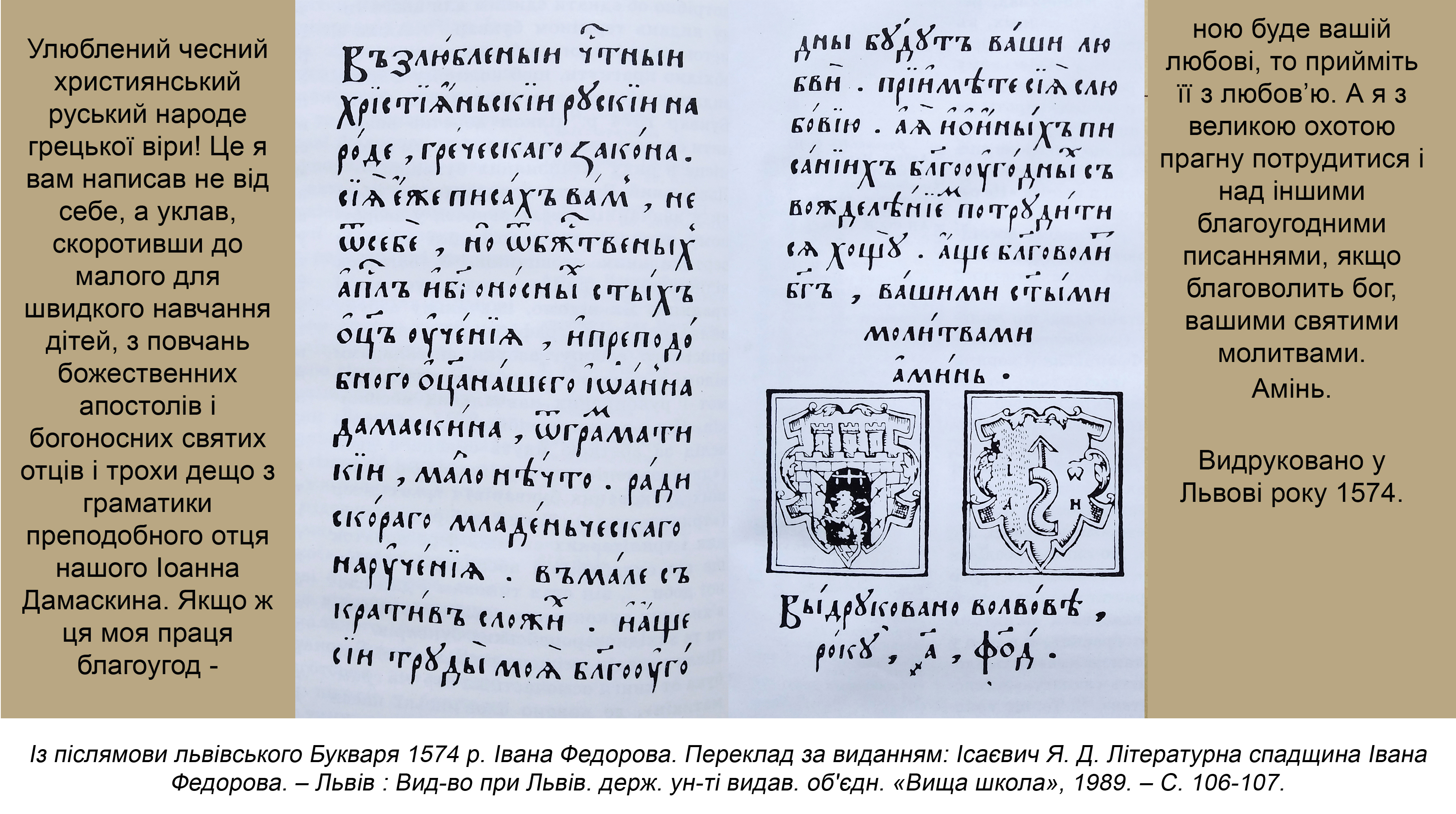 Глибоко розуміючи значення освіти для народу, Іван Федоров[ич] 1574 року видає у Львові «Буквар» – перший друкований підручник у східних слов’ян. Назва книги умовна, деякі дослідники називають її «Граматикою» («Грамматикия»). Титульного аркуша у виданні ще не було (як і в Апостолі), але на останній сторінці книги стояв друкарський знак Івана. Федорова з вирізьбленими літерами «ІОАН» і гербом Львова. Під зображенням – підпис: «Видруковано у Львові року 1574» [33, с. 353].
