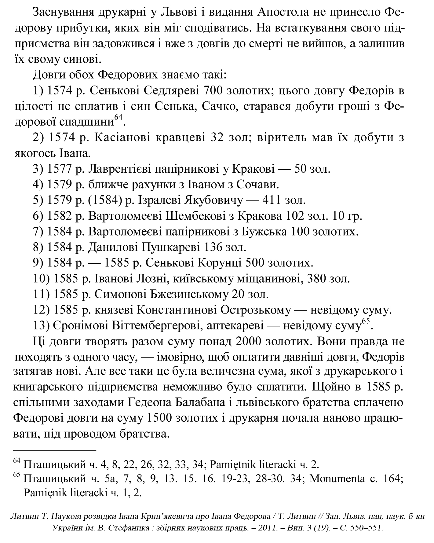 20. Литвин Т. Наукові розвідки Івана Крип’якевича про Івана Федорова / Т. Литвин // Зап. Львів. нац. наук. б-ки України ім. В. Стефаника : збірник наукових праць. – 2011. – Вип. 3 (19). – С. 531–556. – З додатками : 1. Крип’якевич І. Іван Федорів у Львові : [доповідь на науковій конференції, присвяченій 500-річному ювілею винаходу книгодрукування Й. Ґутенберґом, 26 жовтня 1940 р., Львів] ; 2. Рукописна карта «Діяльність Ів. Федорова XVI [ст.]», виготовлена І. Крип’якевичем.