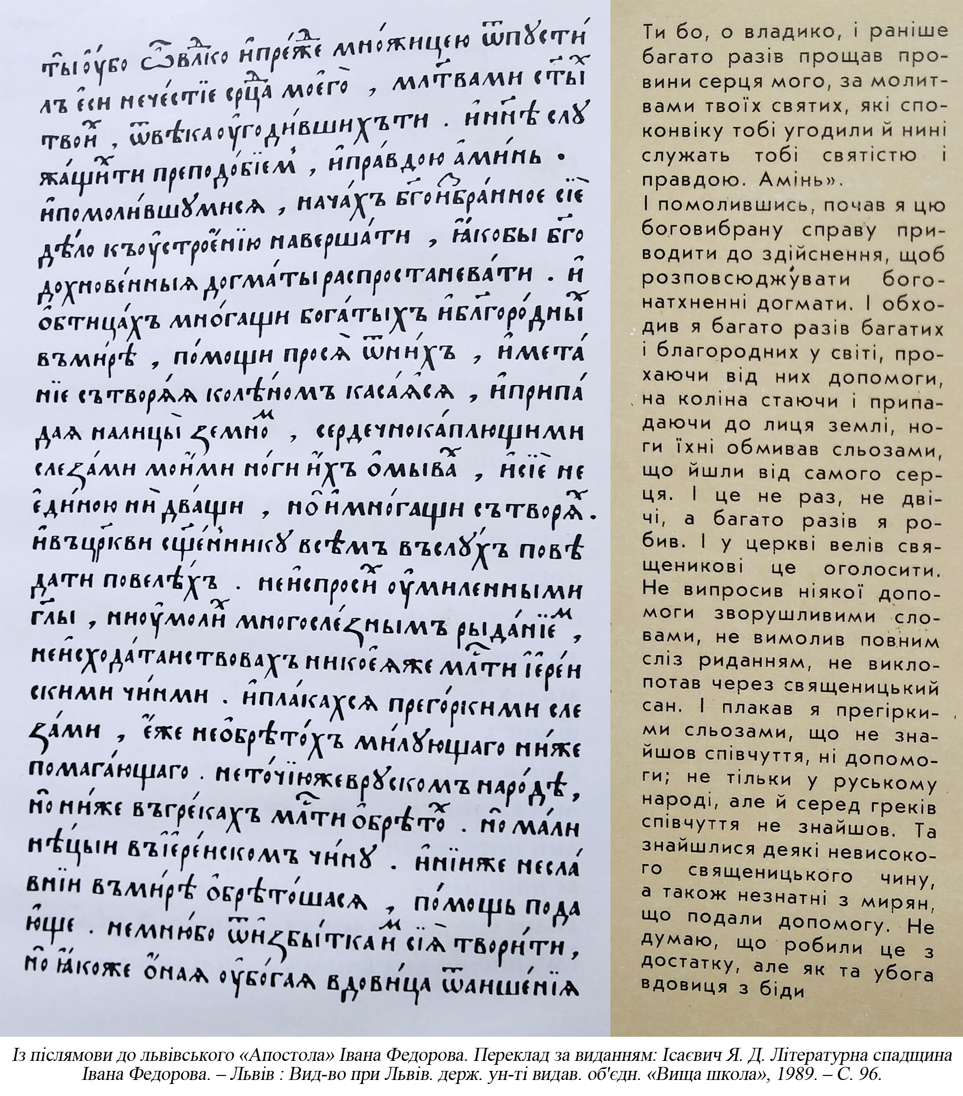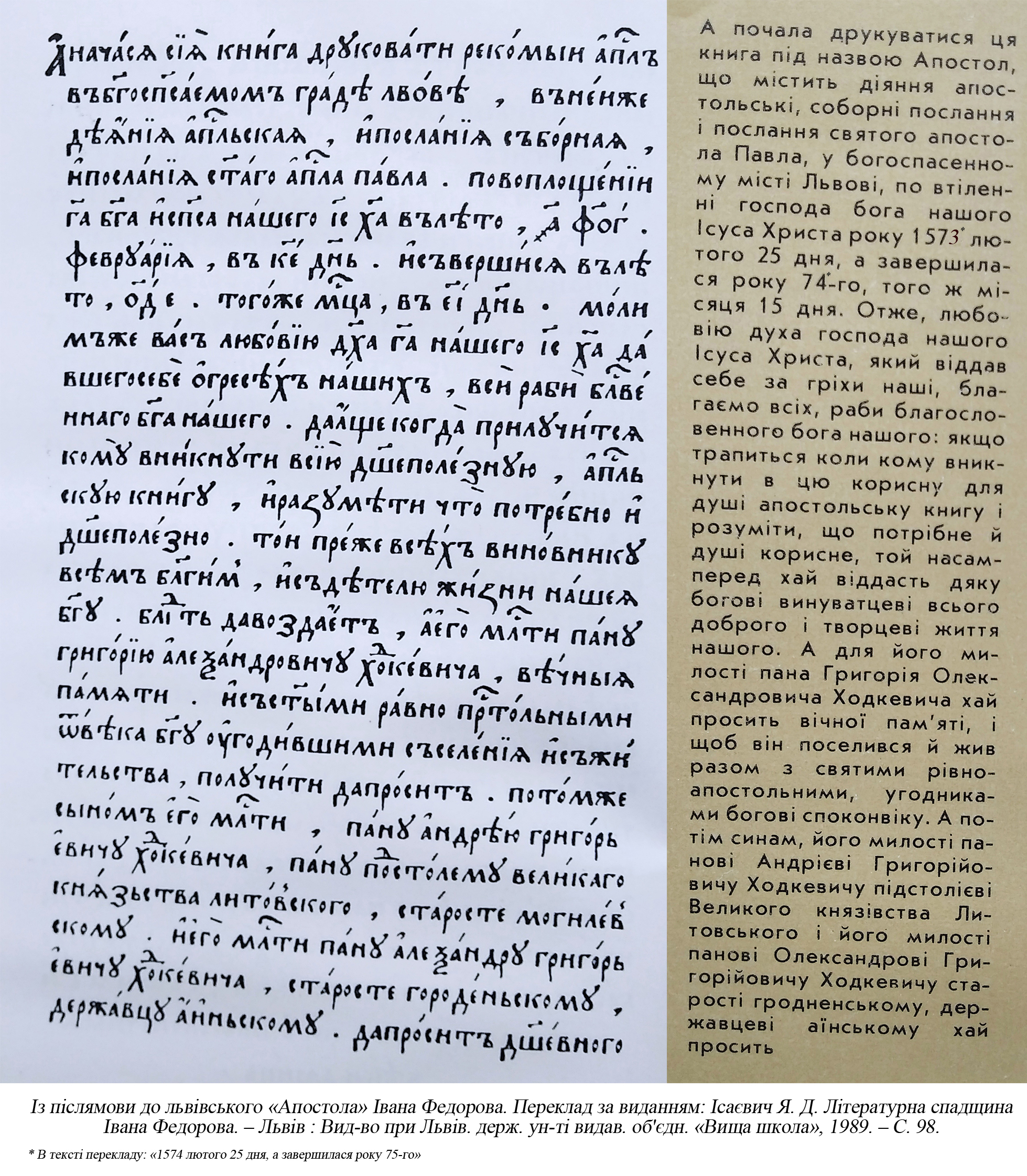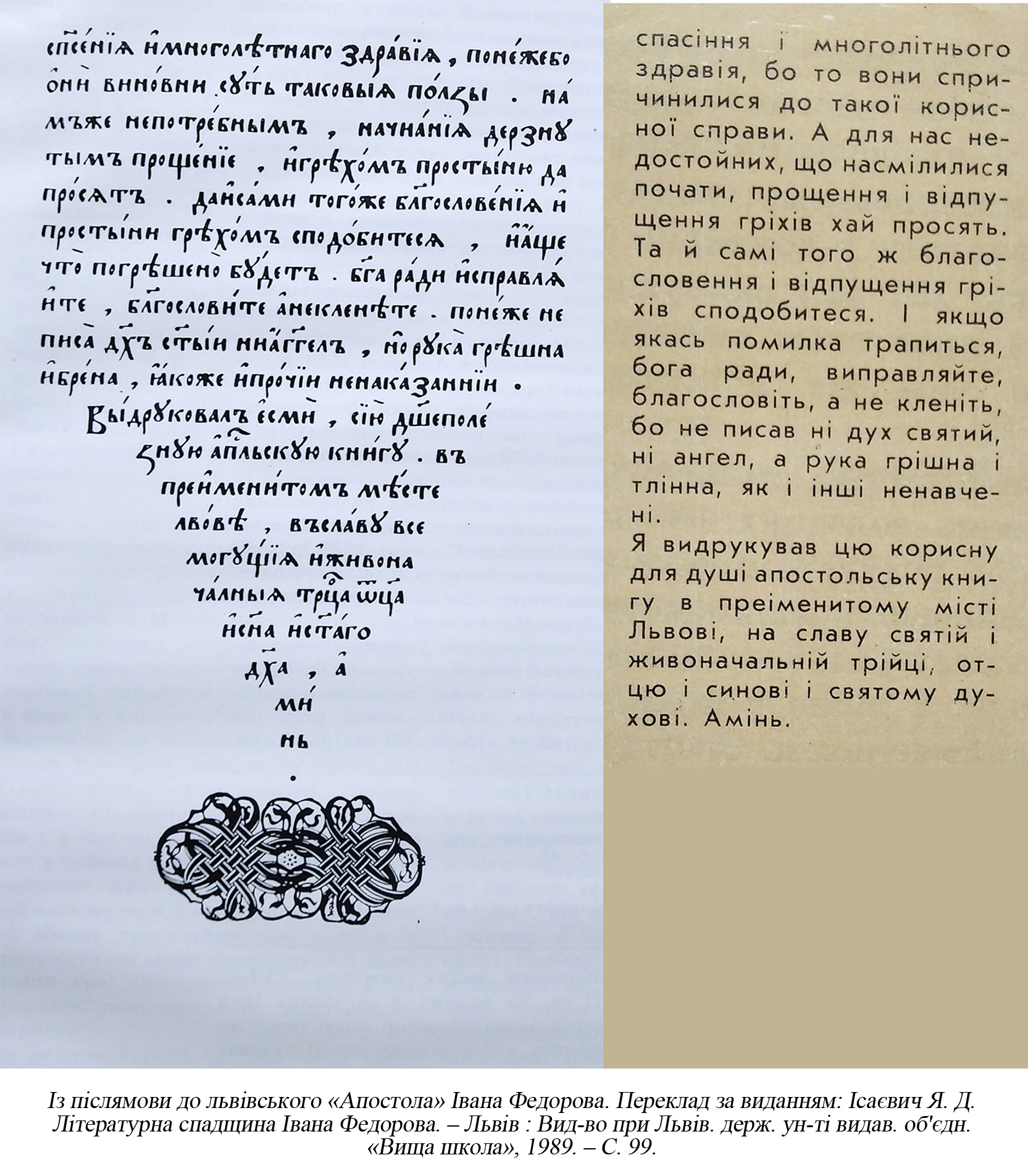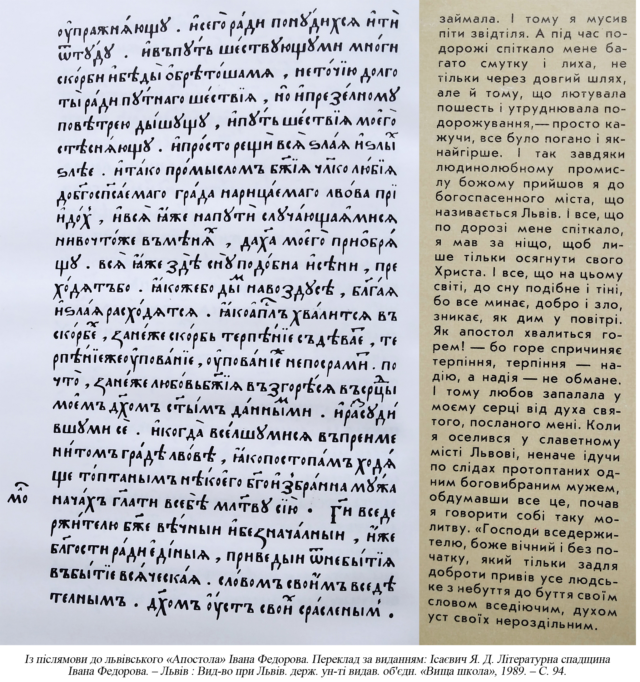 В кінці львівського «Апостола» на 260-264-му аркушах кириличної нумерації вміщена післямова Івана Федорова [«Повість, звідкіля почалася і як була створена ця друкарня»]. Текст «Повісті» є своєрідним зразком давньої вітчизняної мемуаристики, унікальним джерелом автобіографічного характеру, з якого дізнаємось про діяльність друкаря на попередніх періодах (московському та заблудівському) […]. Основна частина післямови (6 сторінок з 9-ти, тобто 2/3 тексту) присвячена розповіді про початок львівського періоду життя та діяльності [Івана Федоровича], в загальних рисах зазначені труднощі, з якими йому довелось зустрітись при заснуванні друкарні у Львові […] [18, с. 26].