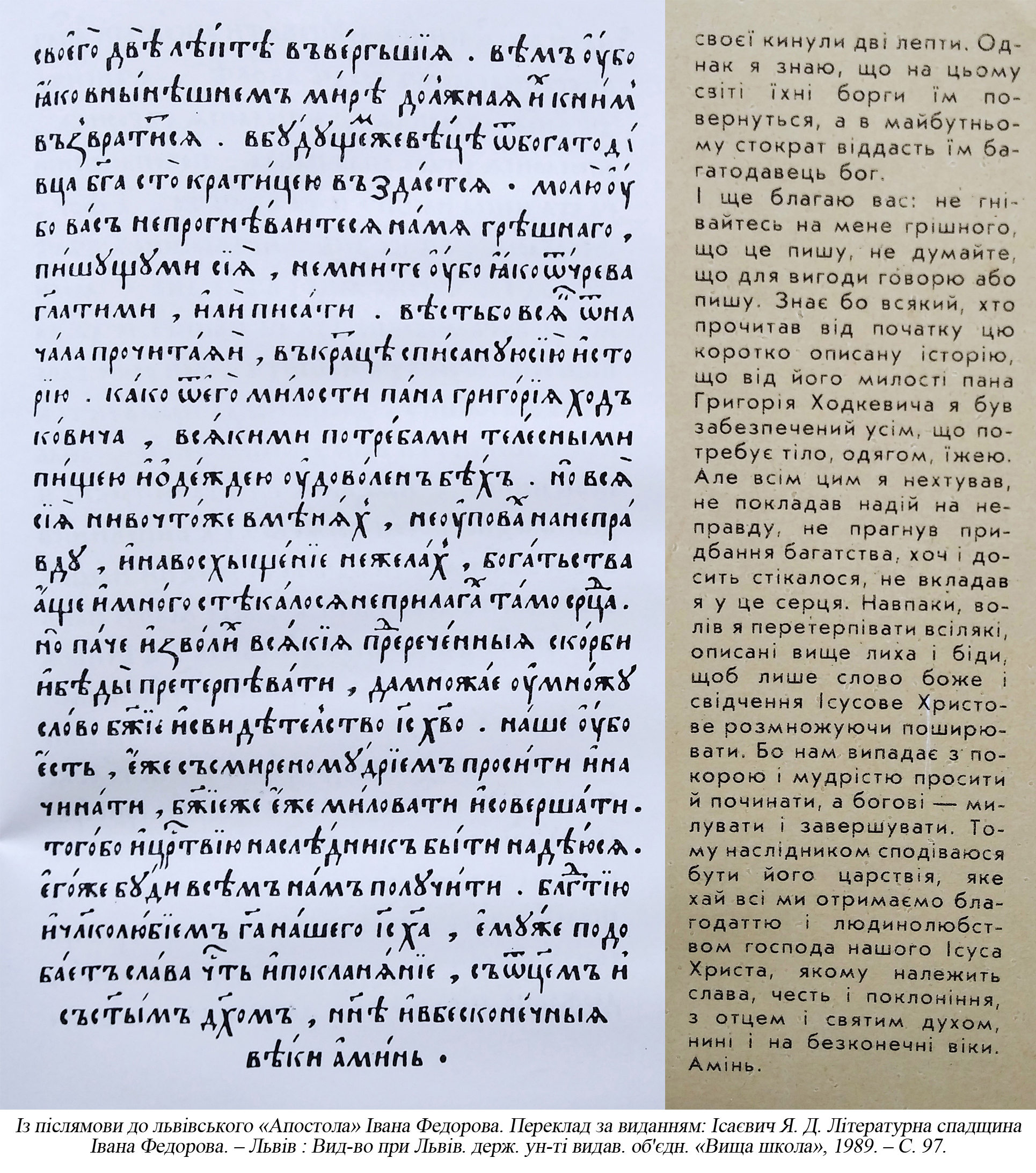 Передмови та післямови федорівських видань у Львові та в Острозі становлять окремий, важливий вид джерел, що мають значну пізнавальну цінність. Завдяки ним стало можливим встановити не лише точне датування стародруків, початок та закінчення їх друкування, але й одержати інформацію з таких питань, як історія заснування друкарень, умови книгодрукування; в цих текстах робляться екскурси в попередні етапи видавничої діяльності першодрукаря [18, с. 24-25].