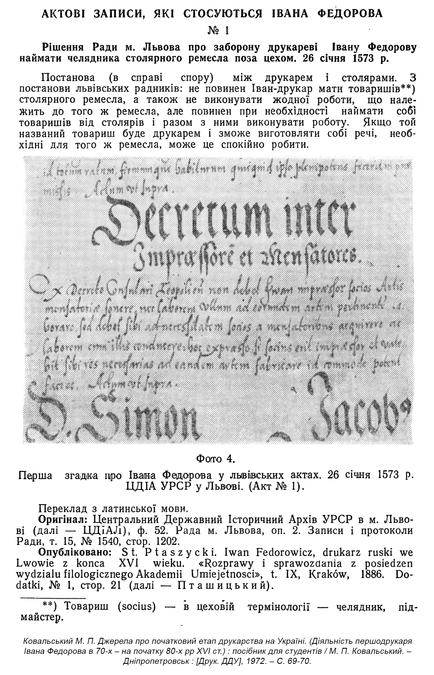 1. Актові записи про спір друкаря з львівським цехом столярів щодо найму челядника столярного ремесла для потреб друкарні […], 26 січня 1573 р. – перша згадка в записах львівських актів про Івана Федорова. Документи свідчать, що у Львові, мабуть, був відсутній досвід організації друкарні, а тому довелось звернутись за консультацією до краківських друкарів, коли Федорову треба було найняти столяра [18, с. 38-39, 59].