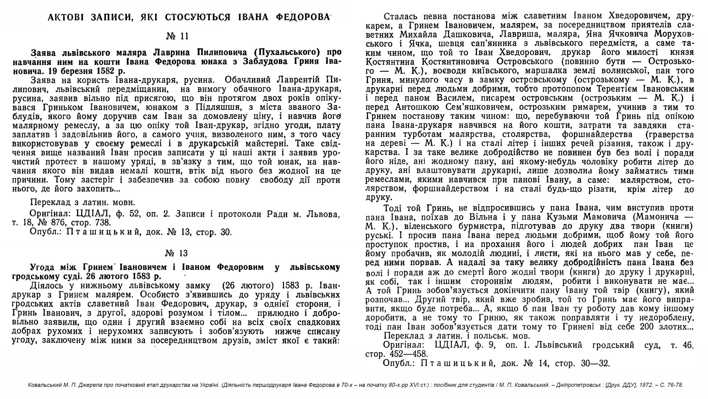3. Серед інших актових матеріалів – два записи в протоколах Ради Львова та львівського гродського суду (19 березня 1582 р. та 26 лютого 1583 р.), що стосуються помічника Федорова, хлопця із Заблудова Гриня Івановича […]. На кошти Івана Федорова Гринь протягом двох років навчався у відомого львівського маляра Лаврентія (Лавриша) Пилиповича-Пухальського […], якого вважають можливим виконавцем рисунка євангелиста Луки (його гравюра вміщена у львівському «Апостолі»). Угода з Гринем Івановичем дає важливі відомості про намагання Федорова після його повернення з Острога продовжити видавничу діяльність та заснувати нову львівську друкарню [18, с. 40-41].