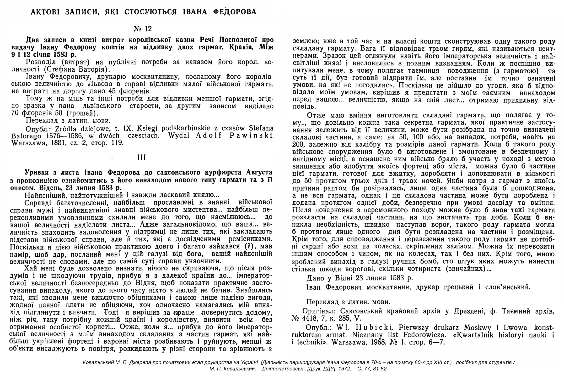 Серед джерел про діяльність Федорова на Україні окреме місце займають два, які, хоч різні за своїм характером та видовими ознаками, об’єднуються тематично. В них висвітлюється діяльність Федорова по виготовленню та винаході нових видів артилерійської зброї. Ця галузь його діяльності напевно не була самоціллю, а одним із засобів роздобути кошти для продовження видавничої справи у Львові після повернення з Острога [18, с. 54].