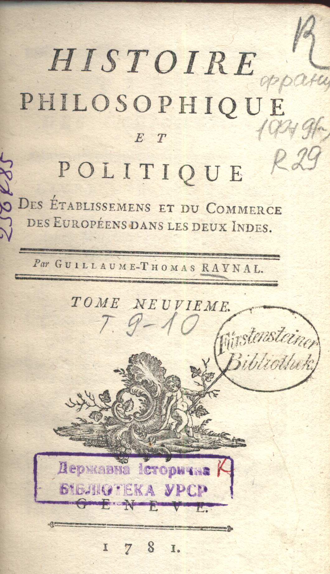 Raynal, Guillaume. Histoire philosophique et politique des Etablissement et du Commerces des Europeens dans les deux Indes [Текст] T. 9-10 / G. Raynal. - Geneve : [s. n.], 1781. - 362, 447 p. - Франц. Шифр: 1Ф / R29