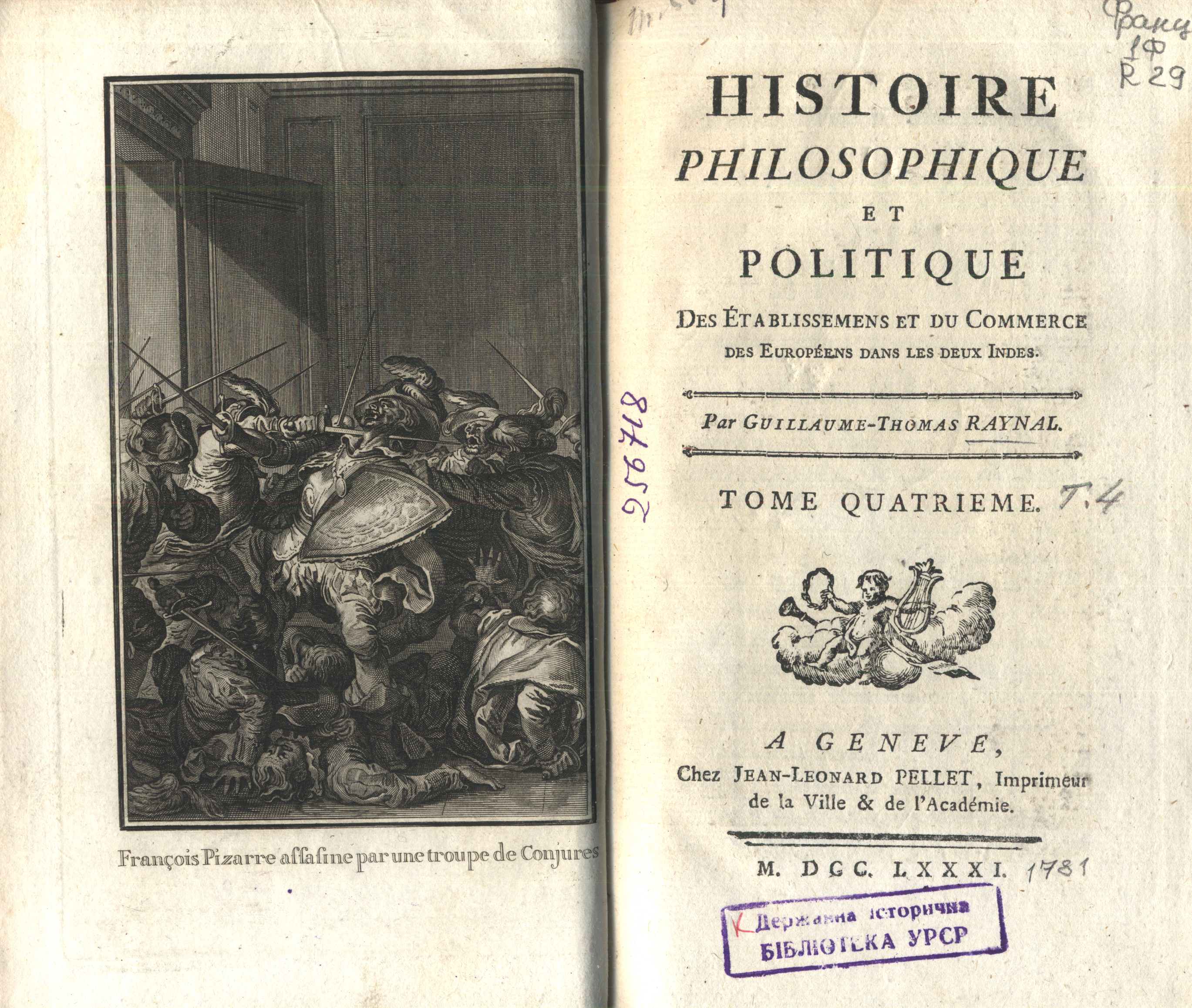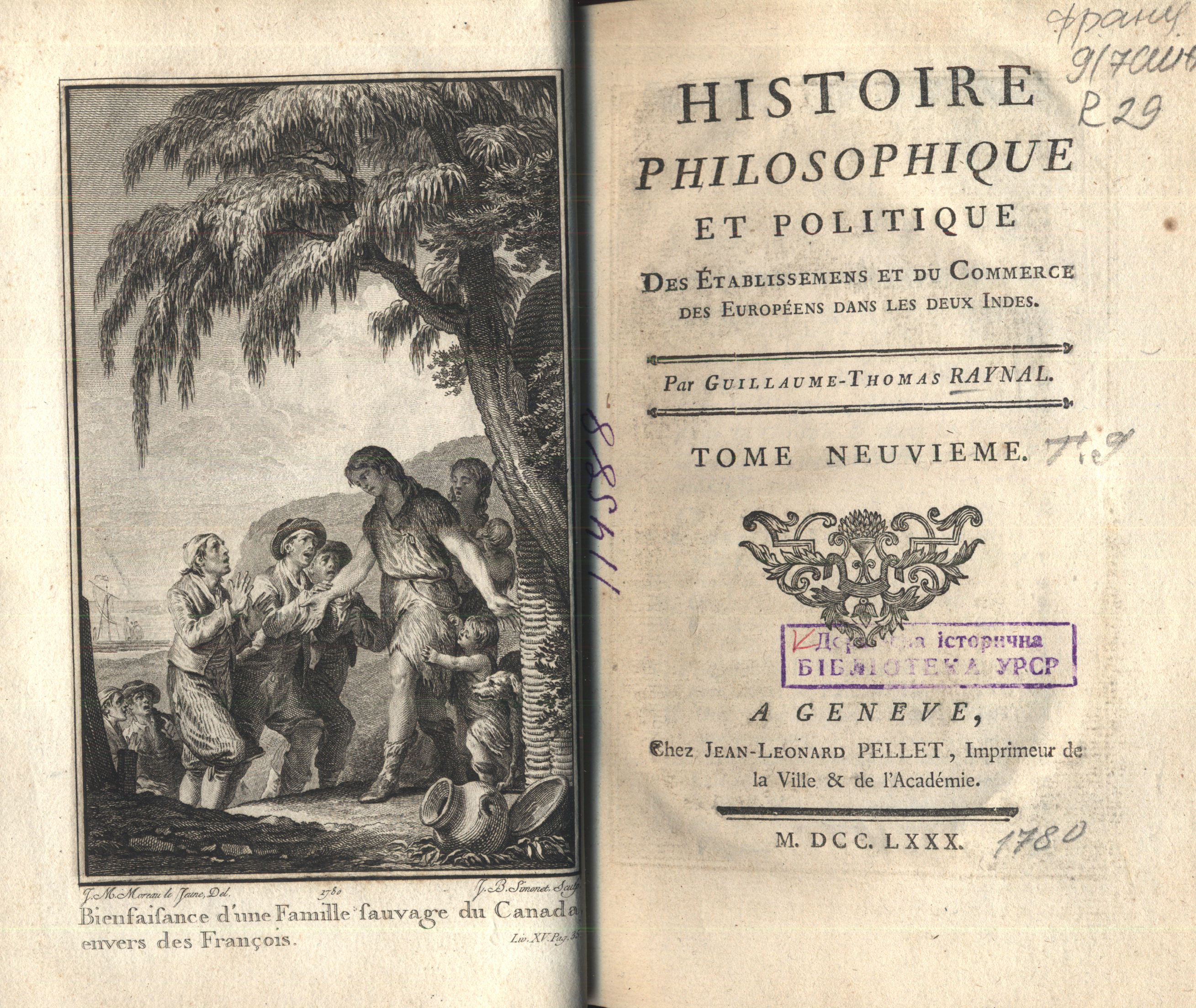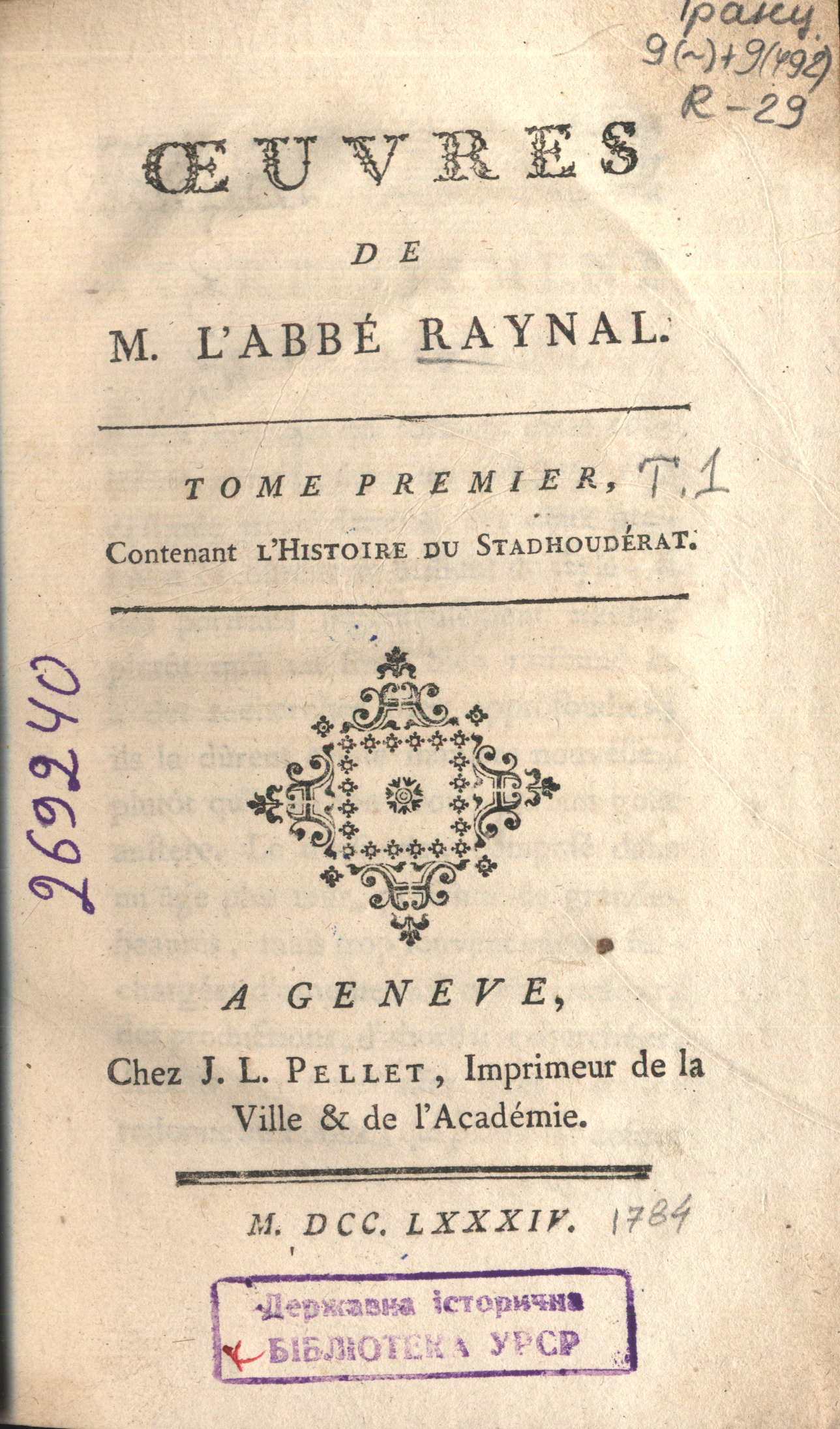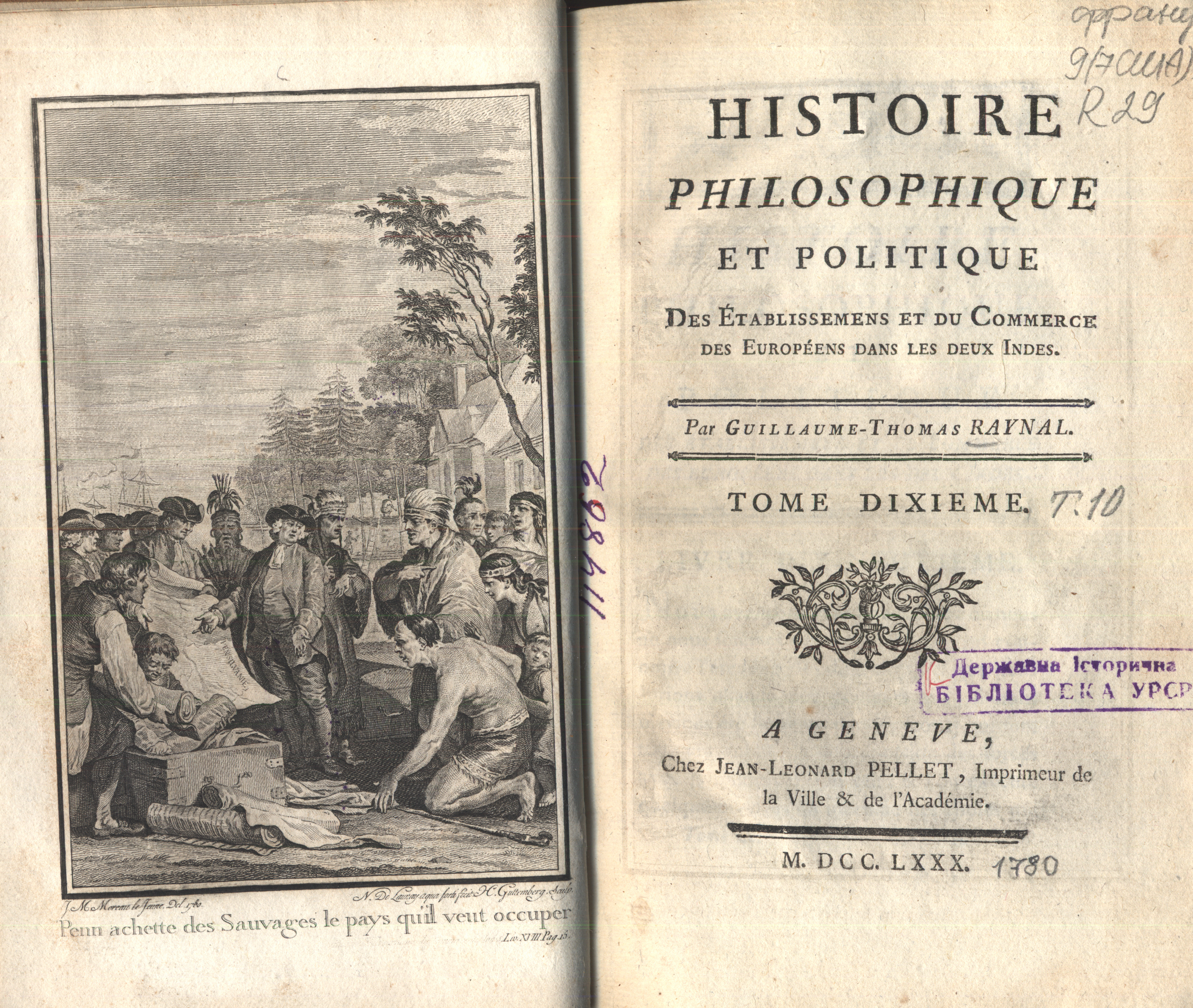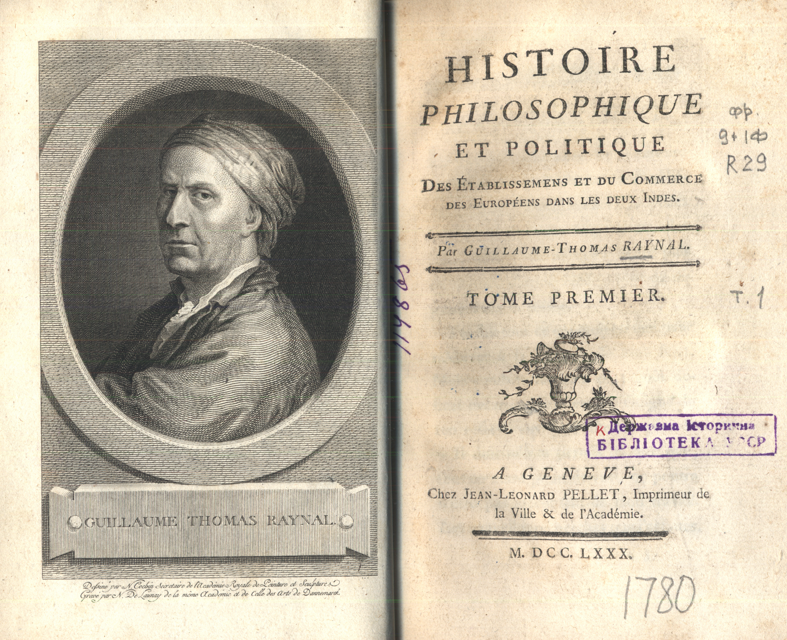 Raynal, Guillaume. Histoire philosophique et politique des Etablissement et du Commerces des Europeens dans les deux Indes [Текст] T. 1 / G. Raynal. - Geneve : [s. n.], 1780. - XVI, 532 p. - Франц. Шифр: 9 / R29