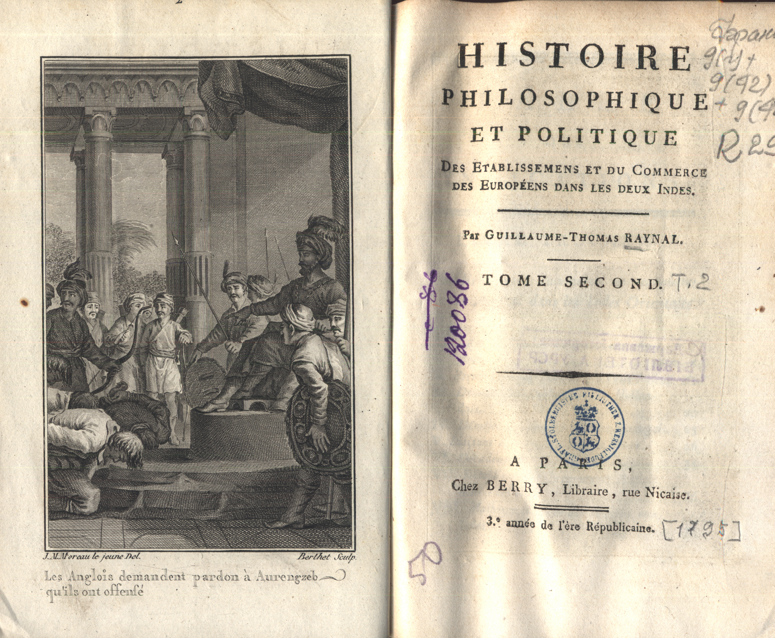 Raynal, Guillaume. Histoire philosophique et politique des Etablissemens et du commerce des Europeans dans les deux Indes [Текст] Т. 2 / G. Raynal. - Paris : Berry, [1795]. - 12, 548 p. : il. – Франц. Шифр: 9(~) / R29