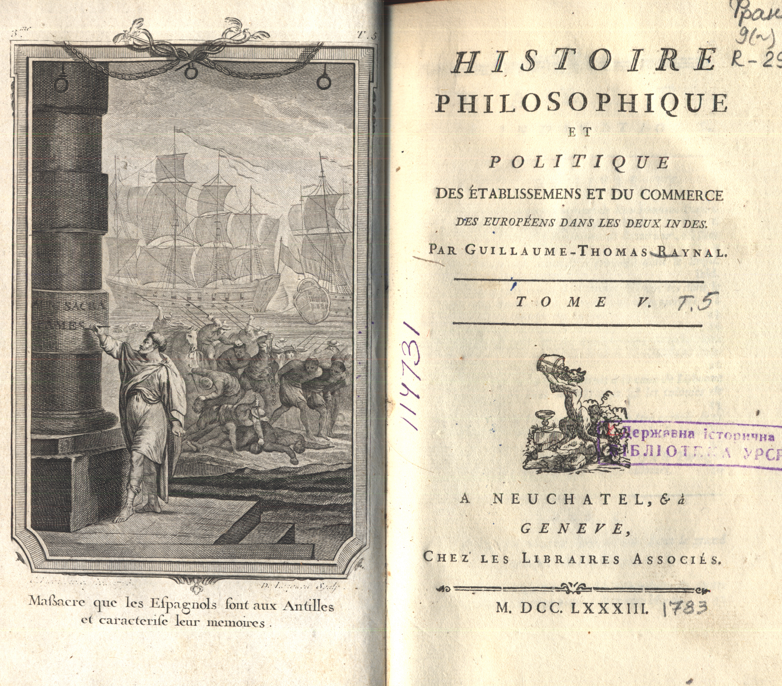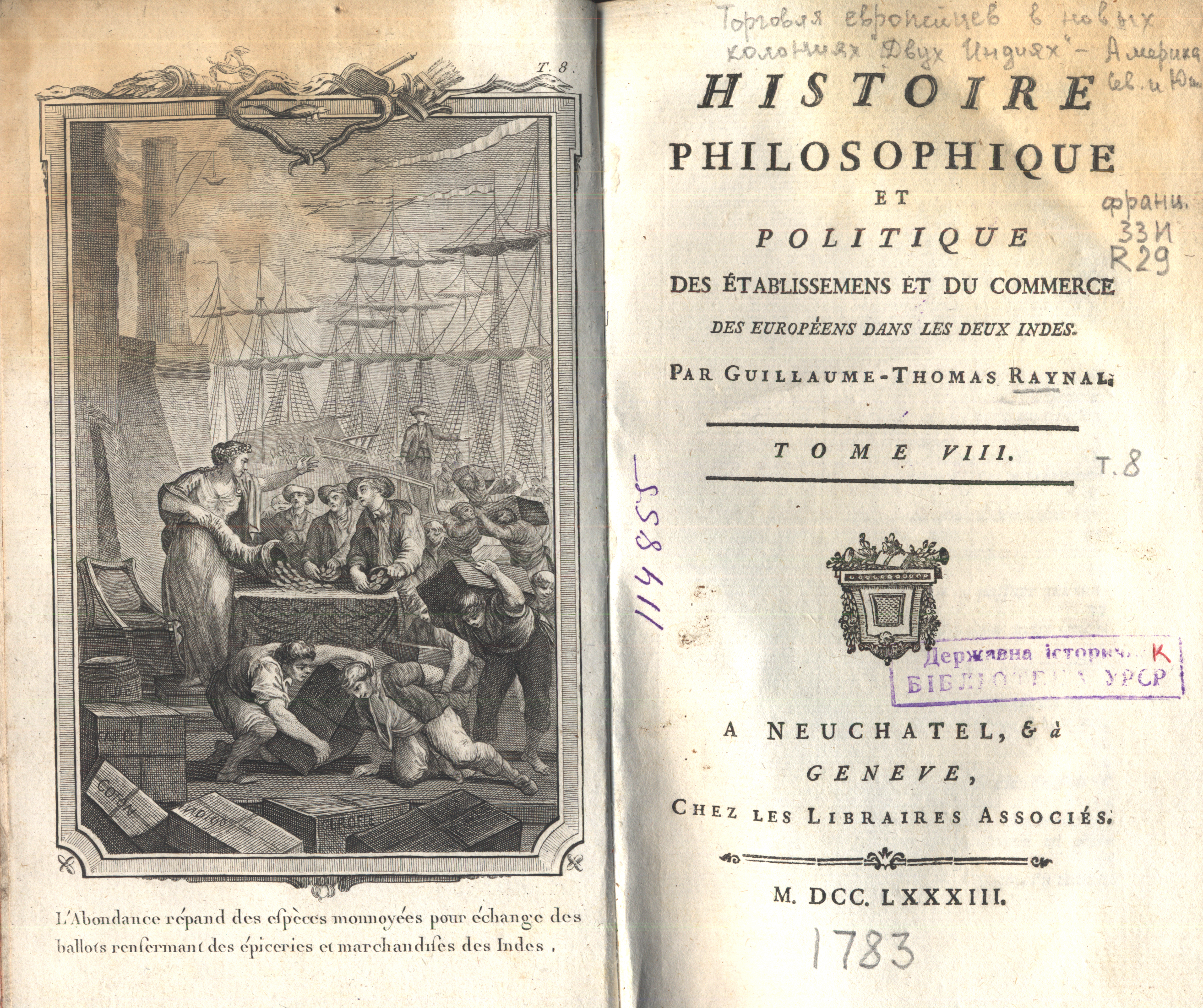 Raynal, Guillaume. Histoire philosophique et politique des Etablissement et du Commerces des Europeens dans les deux Indes [Текст] T. 1 / G. Raynal. - Neuchatel ; Geneve : Libraires Associes, 1783. - X, 416 p. - Франц. Шифр: 9(~) / R29