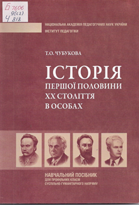 Б7606 / 9(с2) Чубукова Т. О. Зміст навчального посібника «Історія першої половини ХХ століття в особах» висвітлює історію людства, окремих народів через долю пересічної людини та видатної постаті, тому що людина є творцем, суб’єктом і відповідно основною діючою особою в історії. В посібнику розкрито сутність і значення гуманістичних цінностей та традицій українського народу, подано гуманітарно-історичну картину світу за допомогою різноманітних образів і картин з життя людей минулого. Головна мета: показати роль особистості в історії; сформувати в учнів більш повну і яскраву картину нашої держави та міста; виховувати в учнів почуття патріотизму, почуття гордості за свою Батьківщину та її громадян. |