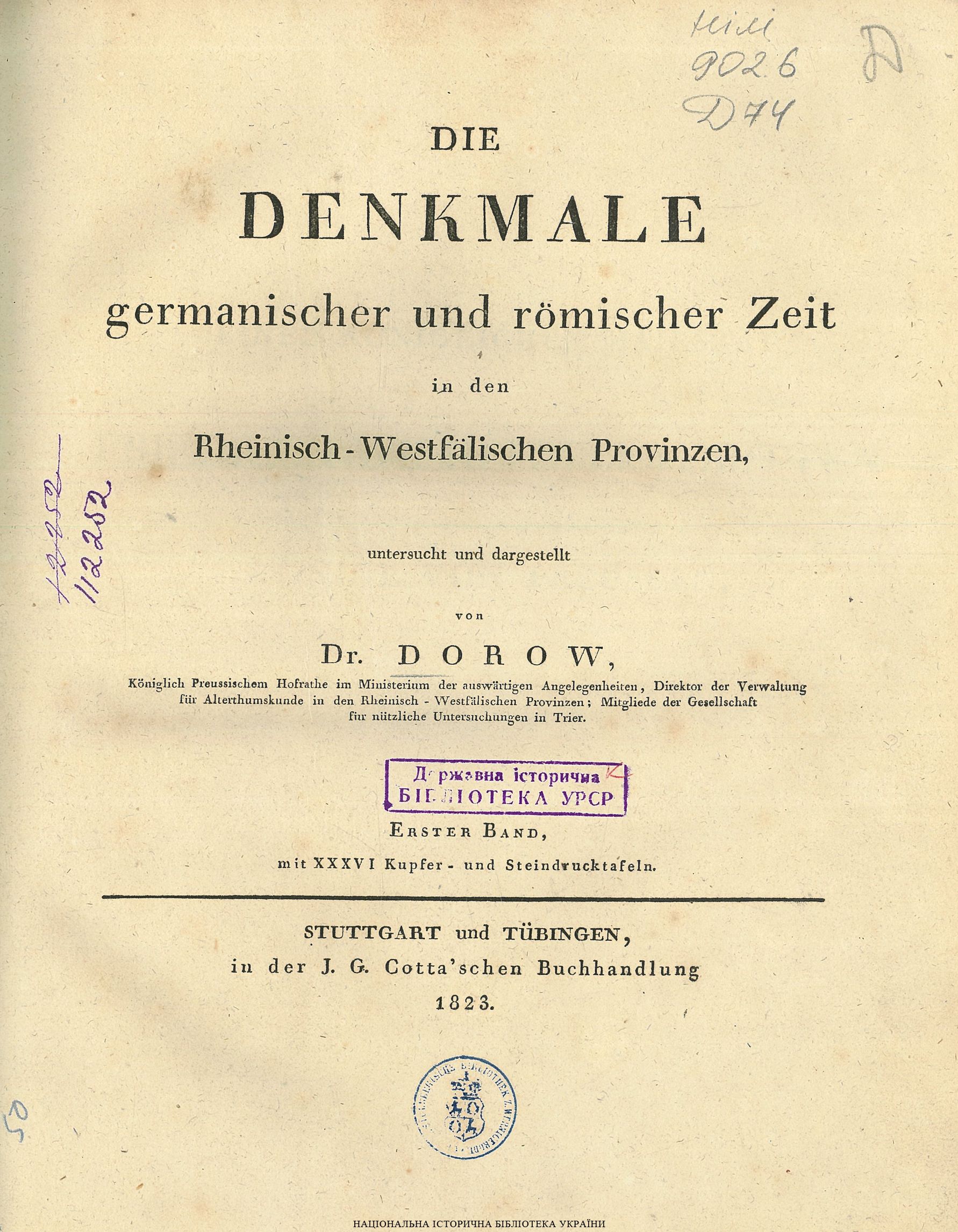 Dorow, Wilhelm. Die Denkmale germanische und römischer Zeit in den Rheinisch-Westfalischen Provinzen [Текст] Т. 1 / W.Dorow. - Stuttgart ; Tübingen : [s. n.], 1823. - XVI, 134 s. - Нім. [Шифр видання: 902.6 / D74]