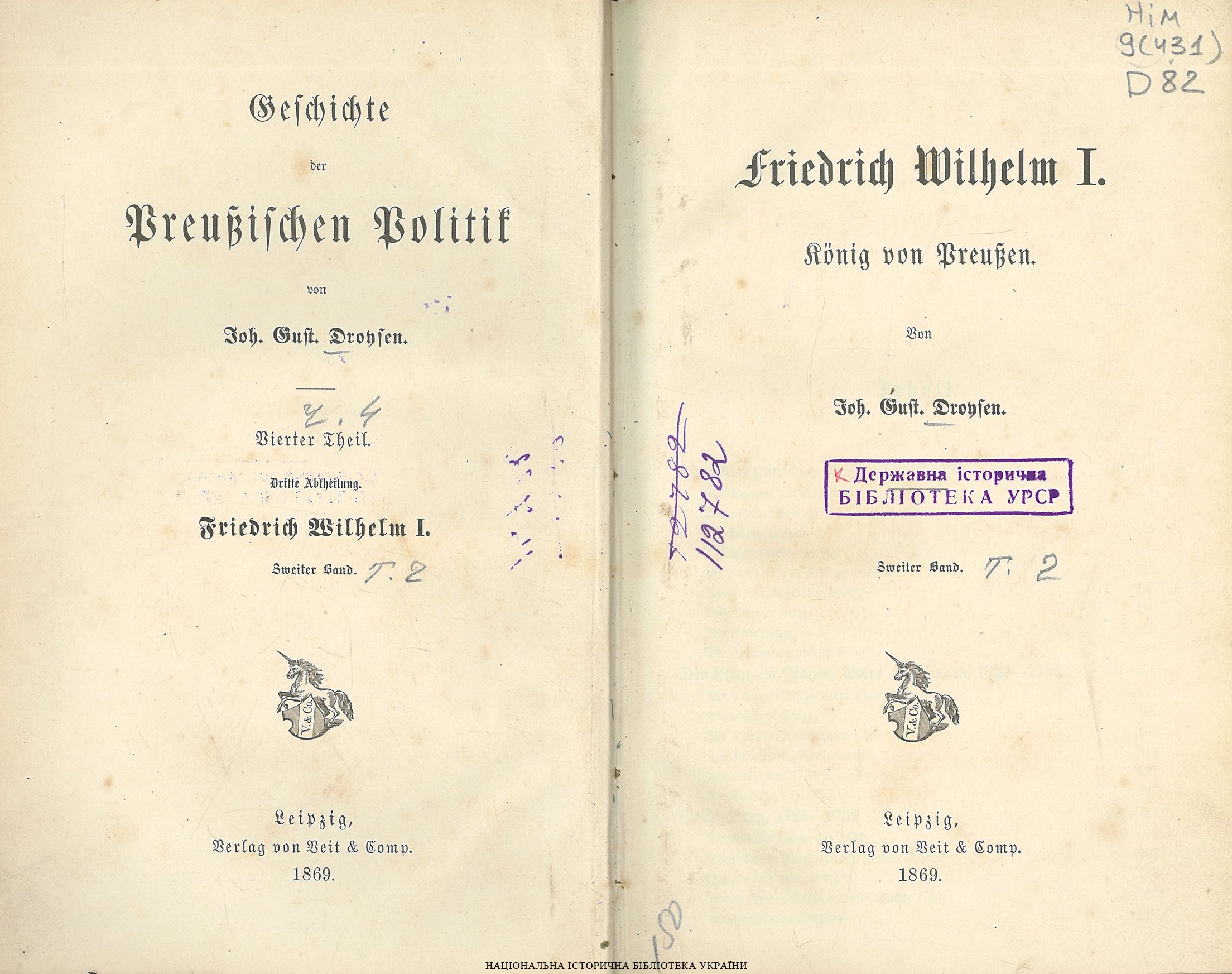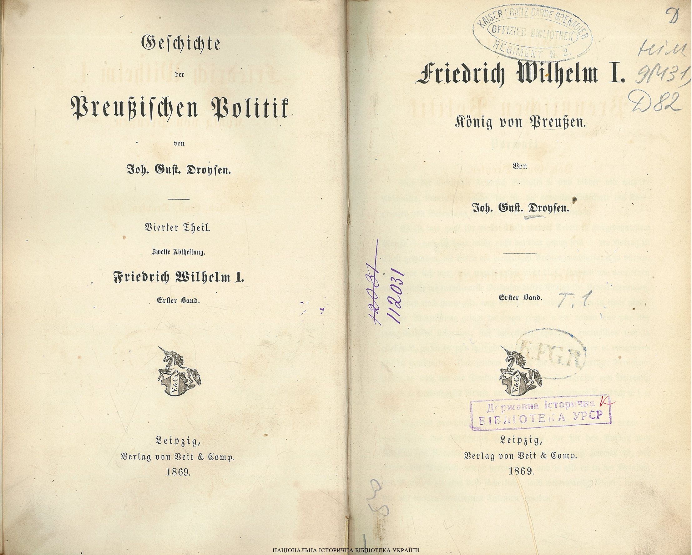 Droysen, Johann Gustav . Geschichte der Preussischen Politik [Текст] Ч. 4. Т. 2. Friedrich Wilhelm I. König von Preussen / J. G. Droysen. - Leipzig : [s. n.], 1869. - VI, 428. - Нім.