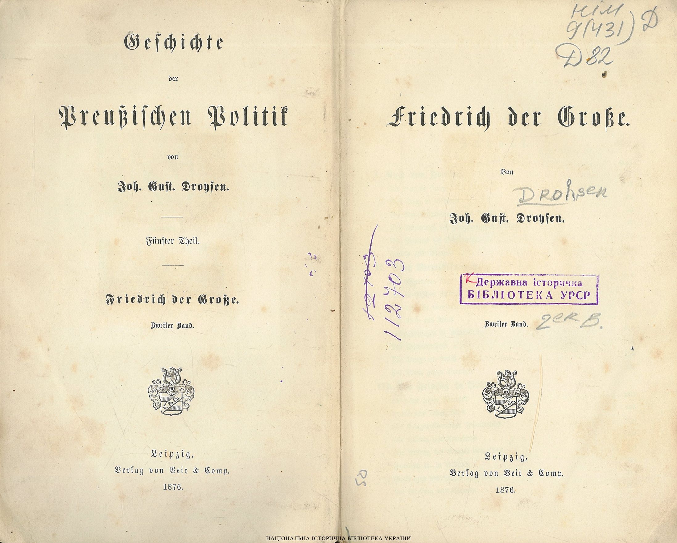 Droysen, Johann Gustav . Friedrich der Grosse [Текст]. Bd. 2. Geschichte der preussischen Politik. Т. 5 / J. G. Droysen. - Leipzig : [s. n.], 1876. - 659 s. - Нім.