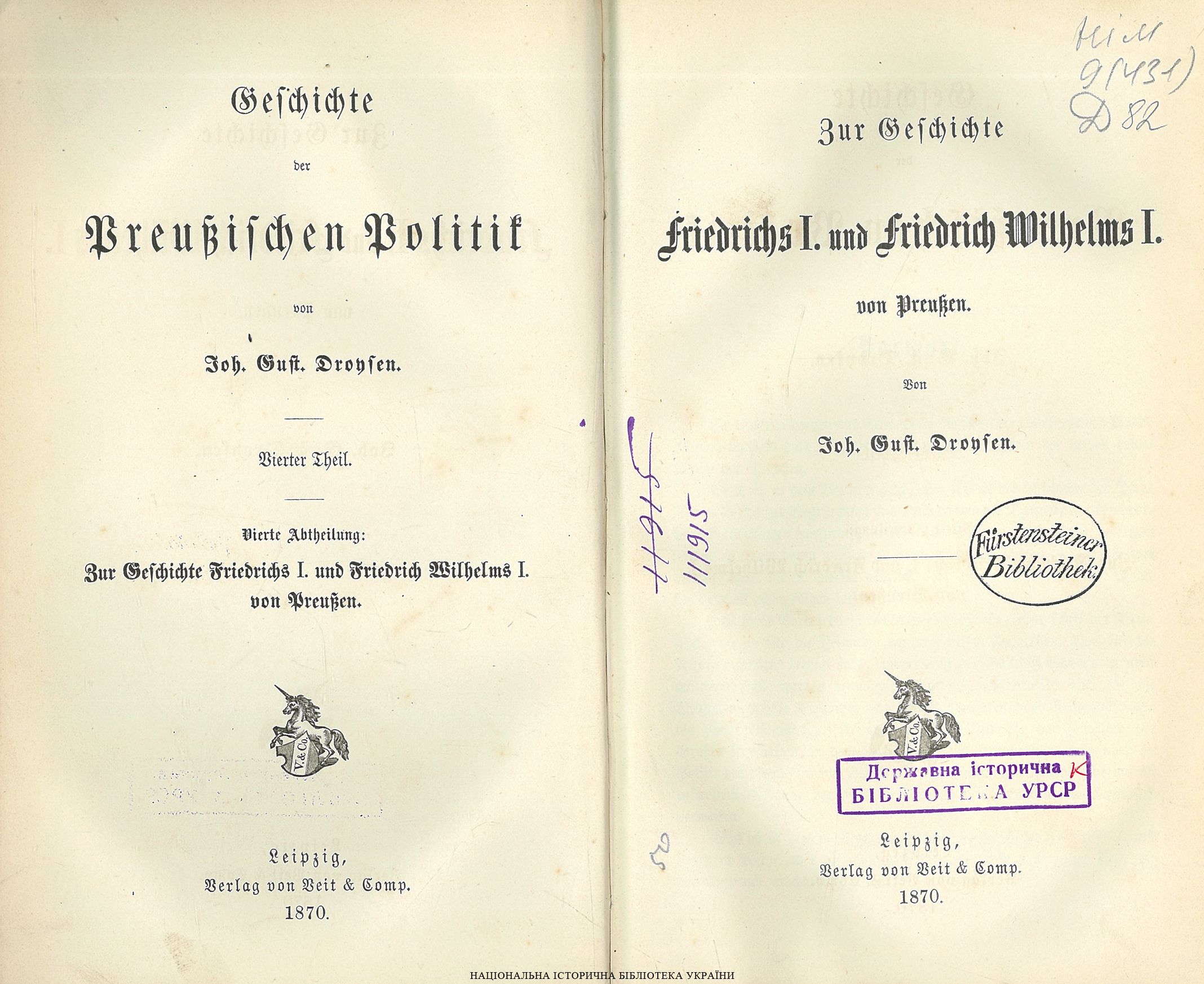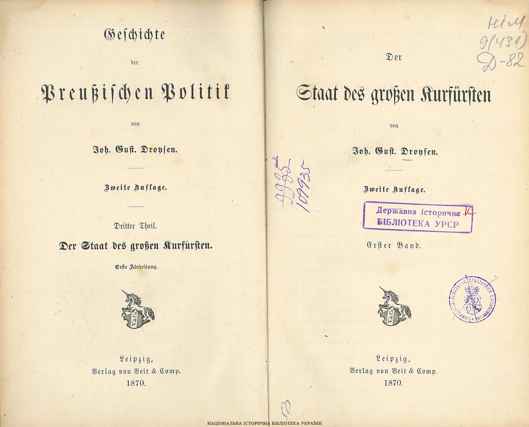 Droysen, Johann Gustav . Geschichte der preußischen Politik [Текст] . Т. 1 / J. G. Droysen. - Leipzig : Veit, 1868. - 471 s. - Нім.