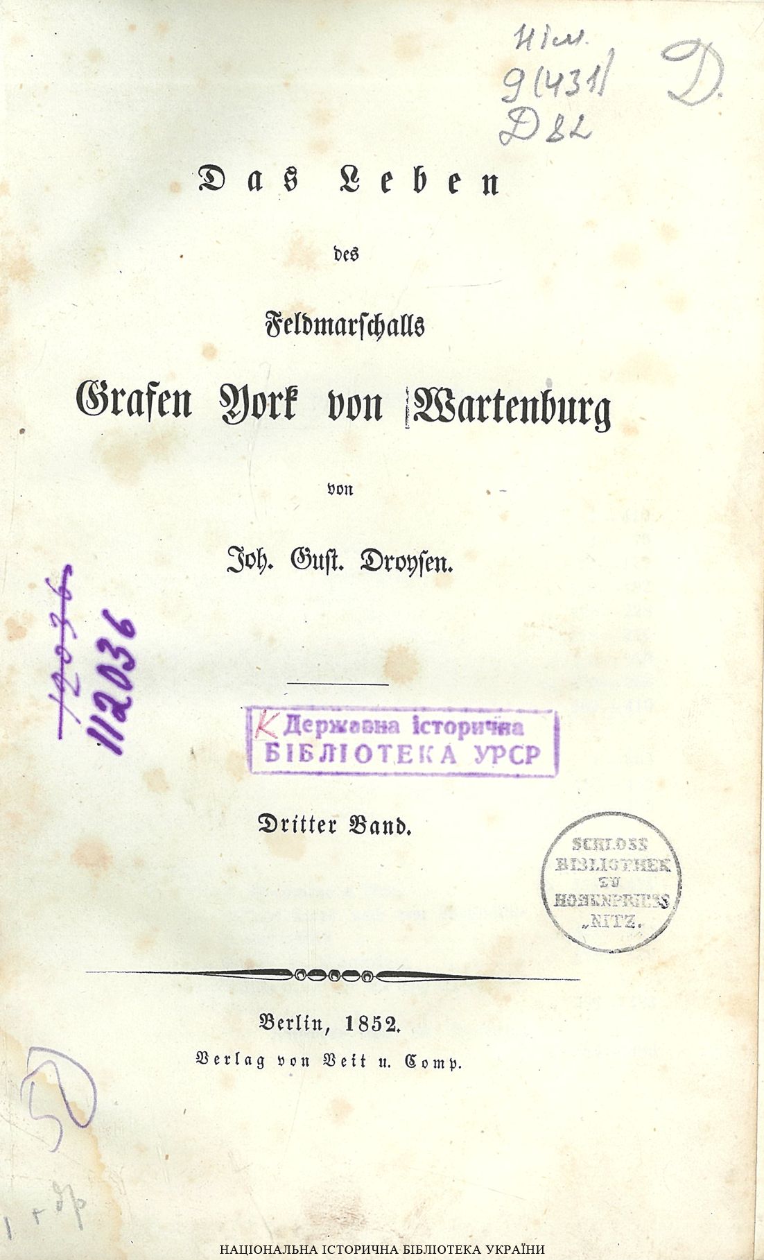 Droysen, J. G. Das Leben des Feldmarshalls Grafen York von Wartenburg [Текст]. Т. 3 / J. G. Droysen. - Berlin : [s. n.], 1852. - 510 s. - Нім.