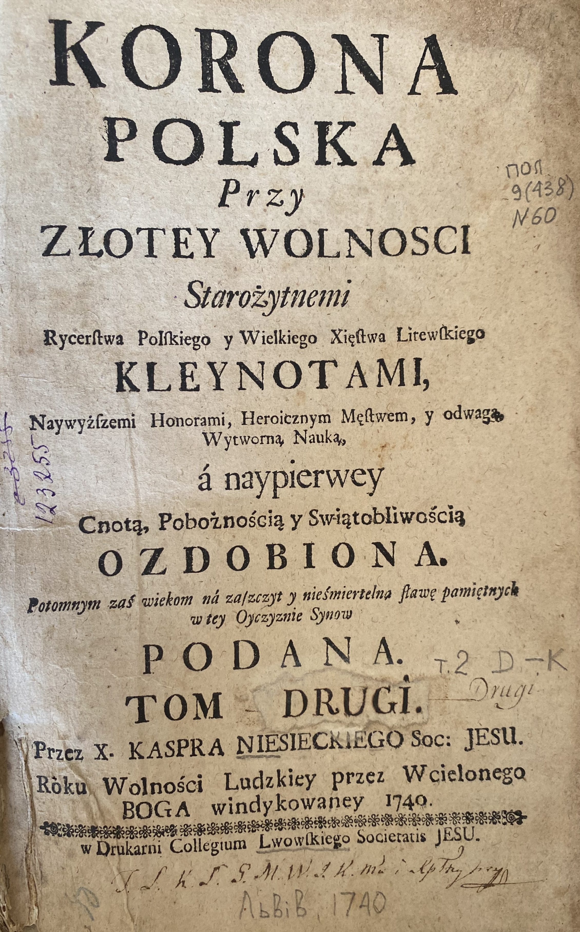 Niesiecki, Kasper. Korona polska przy złotej wolności starożytnemi rycerstwa polskiego i Wielkiego Księstwa Litewskiego klejnotami ozdobiona [Текст] T. 2 / K. Niesiecki. - Lwow : [s. n.], 1740. - 759 с. - Польс.