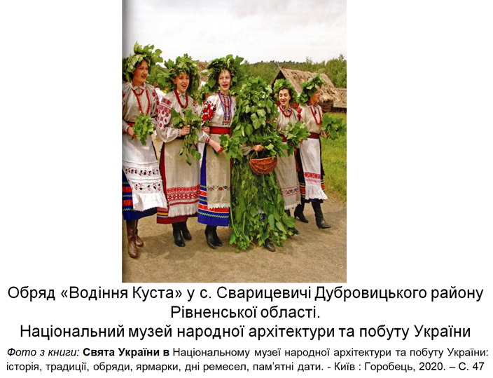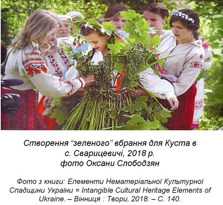 У селі Сварицевичі Зелені свята розпочинаються богослужінням у місцевому храмі, потім старші люди йдуть «голосити» на кладовище, потім громада збирається до дійства наряжання та водіння Куста. «Обряд проводять лише жінки та дівчата на 50-й день після Великодня на свято Трійці, триває він три дні. В перший день йдуть на цвинтар, прикрашають могилки лепехою та кленовим гiллям. Старші жiнки у формi плачу-речитативу «викликають на розмову» своїх родичiв, розповiдають їм про події минулого року – «голосять». Потім збираються в лiсi й вбирають (клечають) найвродливiшу дівчину. За крайку затикають гiлля дерев, лепеху, а на голову одягають пишний вінок, сплетений з кленового листя та квітiв. Кустовий гурт обходить оселі, співаючи величальні кустові пісні, а наприкінці виголошує побажання: «Вийди, господаре, з нового покоя. Винесь Кусту хоч да пувзолотого», «Водимо Куста, щоб другого року дождаті і поспiваті», «Щоб ішов дощ і все було зелене!». Завершується обряд на полі, де зелень дівчини-«Куста» розбирається, розривається на частини та, як символ родючості, викидається «на врожай». Окремі гілочки з «Куста» приносять додому й розкидають по городу» [Елементи Нематеріальної Культурної Спадщини України = Intangible Cultural Heritage Elements of Ukraine / М-во культури України, Український культурний фонд ; наук. ред.: В. В. Телеуця, Л. М. Снігирьова. – Вінниця : Твори, 2018. – 145, [6] с. : іл. – С. 138].