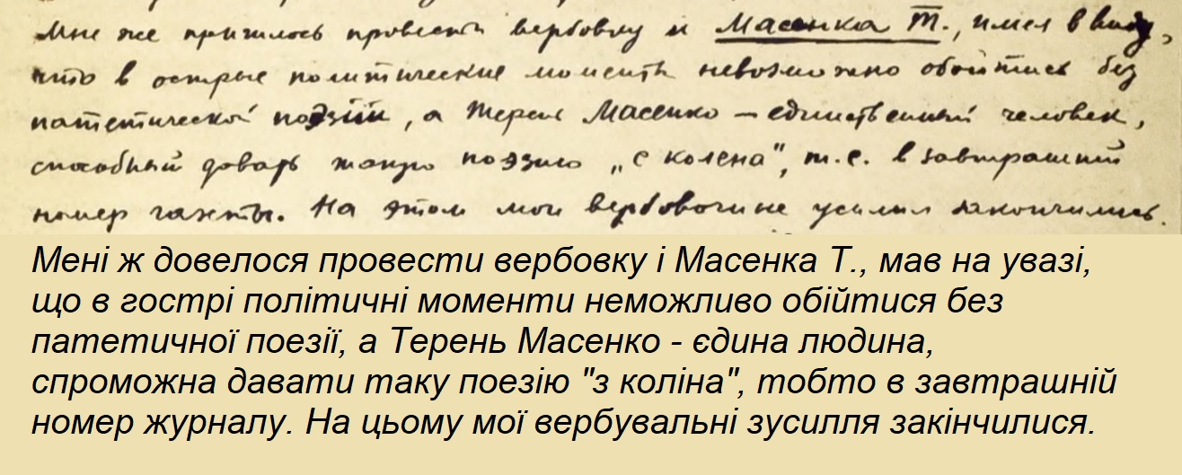 “Високий, худий поет Терень Масенко був засланий з іншими, тепер, повернувшись з заслання, пише.” [Куліш В. Слово про будинок “Слово” : Спогади / В. Куліш. – Канада : Гомін України, 1966. – С 46]. – Елетронне джерело : https://diasporiana.org.ua/memuari/1741-kulish-v-slovo-pro-budinok-slovo/