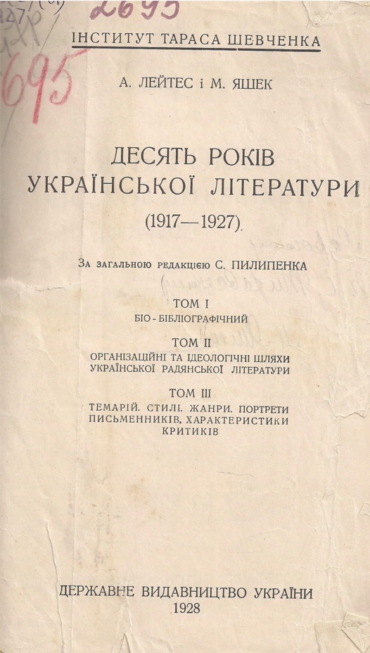 Лейтес А. Яшек М. Десять років української літератури (1917–1927). Т. 1 / А. Лейтес, М. Яшек ; за заг. ред. С. Пилипенка ; Ін-т Т. Шевченка. – Харків : Держвидав України, 1928. – 673 с.